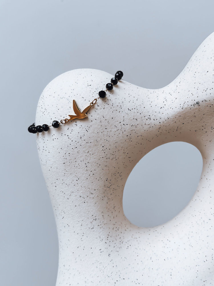 Náramek s motivem holuba.Model má černé kuličky spojené zlatým řetízkem a celek je zakončen přívěskem ve tvaru holuba.Náramek je mimořádně stylový.