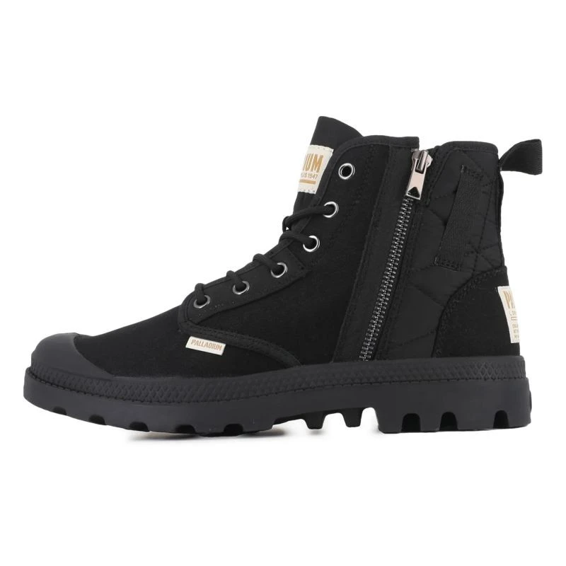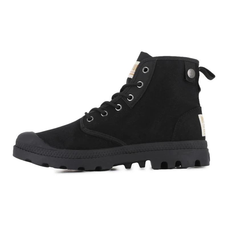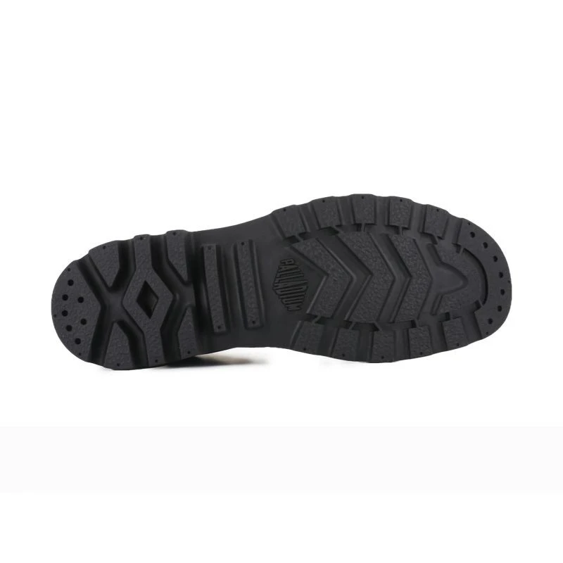 Bota je vybavena zpevněním paty, poutkem v zadní části a značkou Palladium - nášivkou na jazyku a logem na svršku. Strobelová trvanlivá konstrukce zajišťuje dobrou pružnost a kontakt se zemí. Jedná se o návrh městské obuvi s výrazným charakterem, která je vhodná pro každodenní použití i outdoorovou stylizaci.