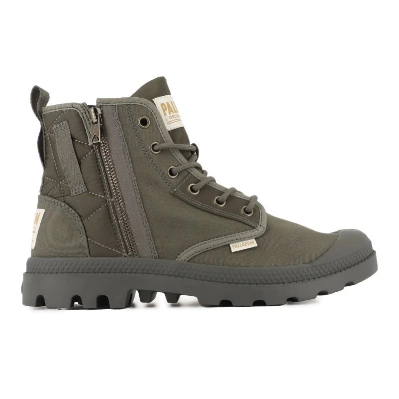Boty Palladium Pampa Detroit Zip 79500-325 Olive Night kombinují vojenskou inspiraci s městskou funkčností. Jsou vyrobeny z materiálu organického plátna a prošívaného nylonu a představují robustní, ale zároveň rafinovaný vzhled. Zapínání kombinuje klasické tkaničky s bočním zipem, což umožňuje snadné nazouvání a vyzouvání bot bez nutnosti neustálého rozvazování tkaniček.