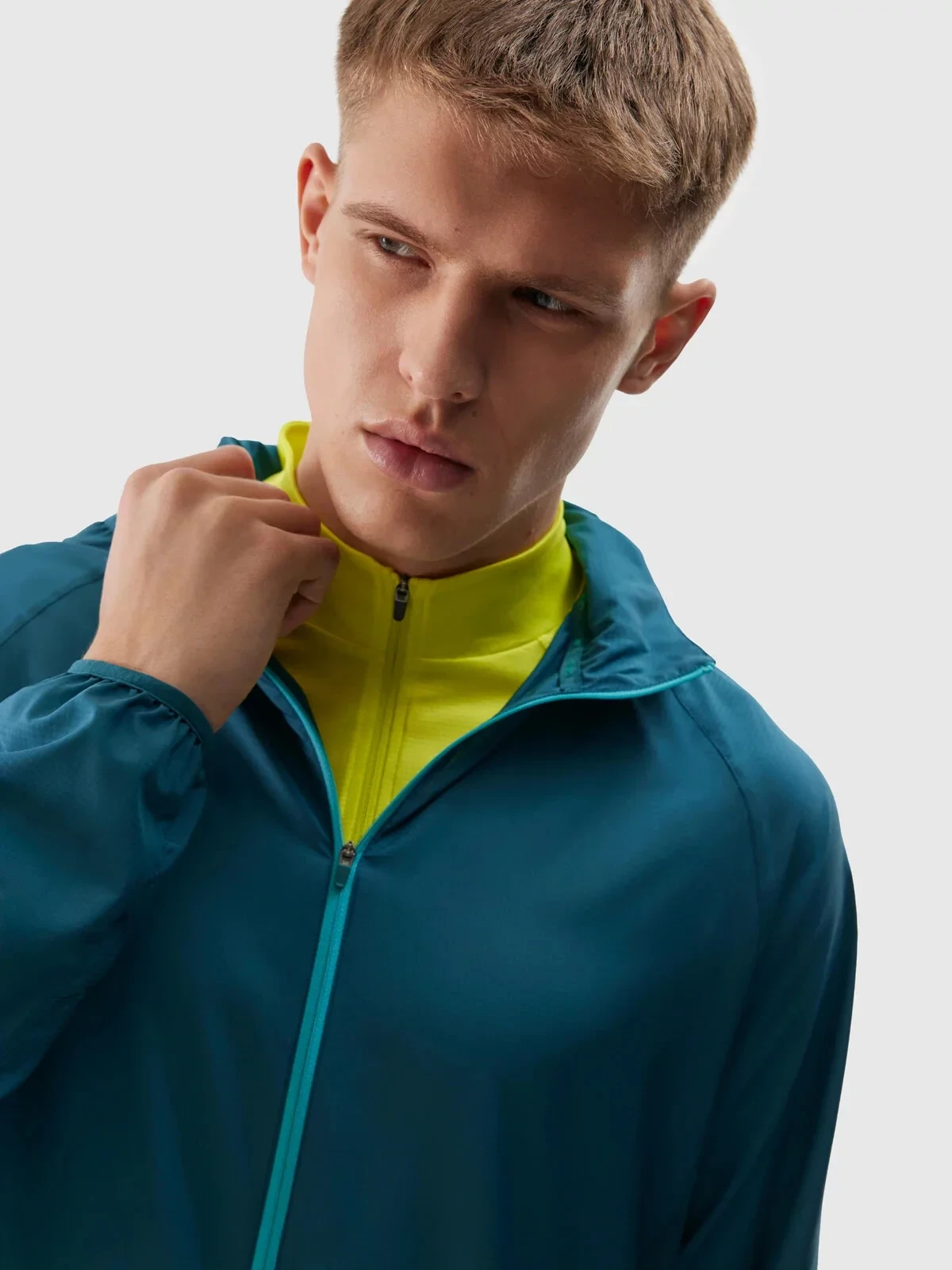 Pánská běžecká bunda má integrovanou kapuci, kterou lze složit a uložit do límce. Krk je krytý stojáčkem, který chrání před mírným prochladnutím. Rukávy jsou zakončeny nenastavitelnými manžetami s elastickým lemováním. Podél trupu se nachází větrací panel z prodyšné síťoviny, který zlepšuje proudění vzduchu.