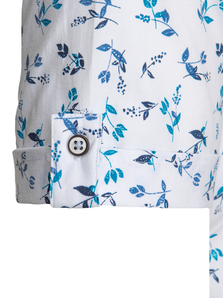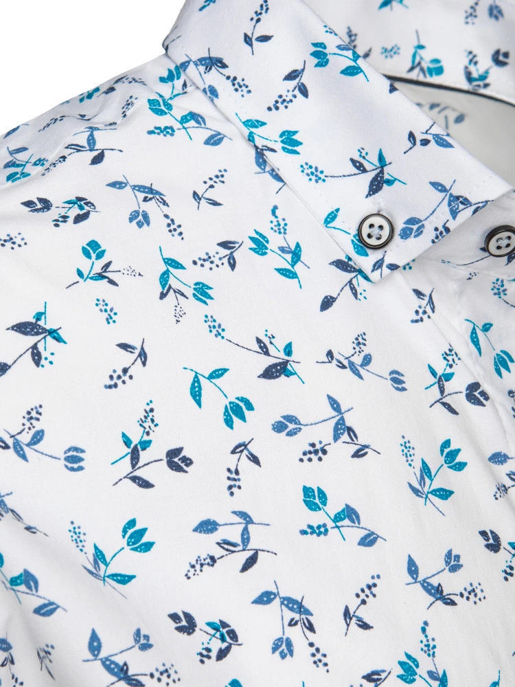 Tato pánská košile s krátkým rukávem slim fit střihu je skvělou volbou pro teplejší měsíce. Listový a květinový vzor dodává košili svěžest a charakter, zatímco knoflíkový límec a zapínání na knoflíky jí dodávají elegantní vzhled. Ideální pro ležérní i elegantní styling - ideální na jarní schůzky nebo letní výlety.