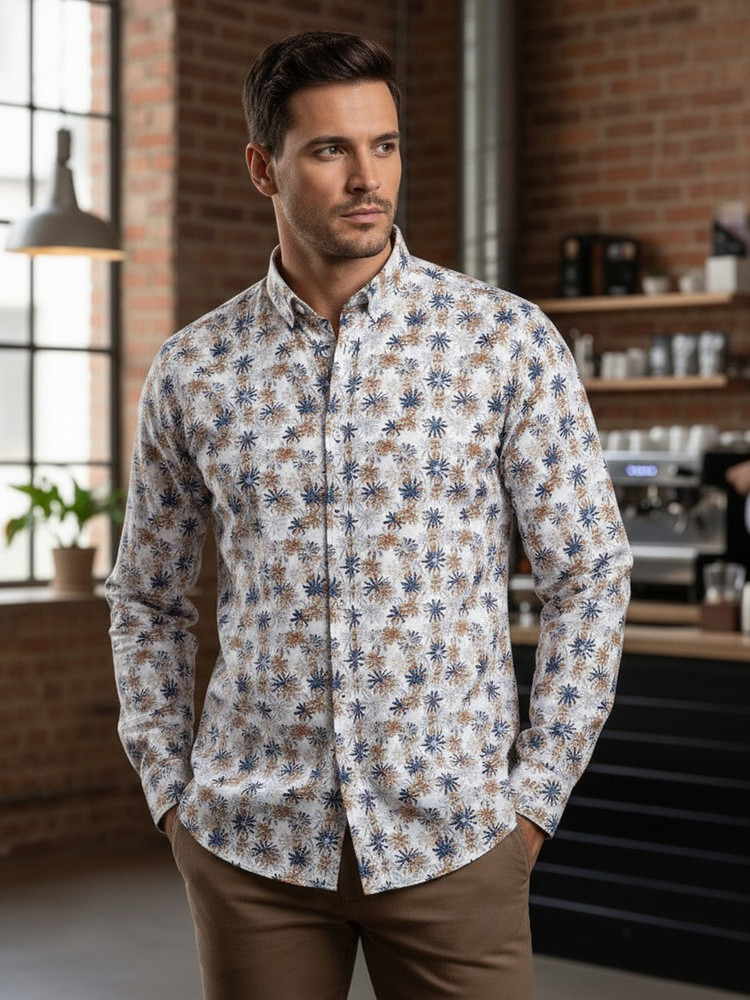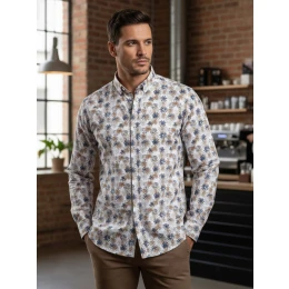 Męska koszula casualowa o efektownym wzorze w kontrastowe kwiaty, idealna na wiosnę i lato. Model slim fit podkreślający sylwetkę, zapinany na klasyczne guziki. Koszula posiada klasyczny kołnierzyk oraz długie rękawy zakończone mankietami z regulowanym zapięciem. Świetny wybór na co dzień i na luźniejsze okazje.