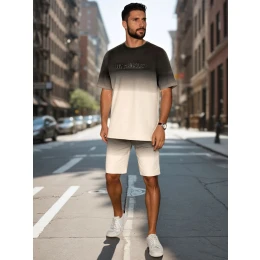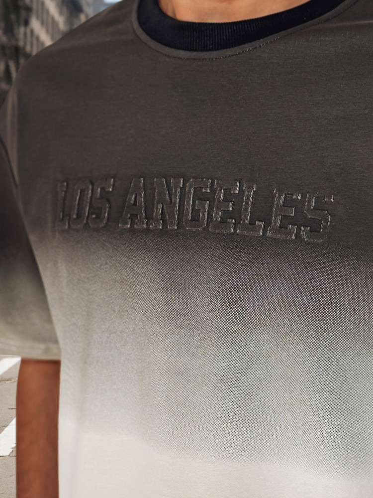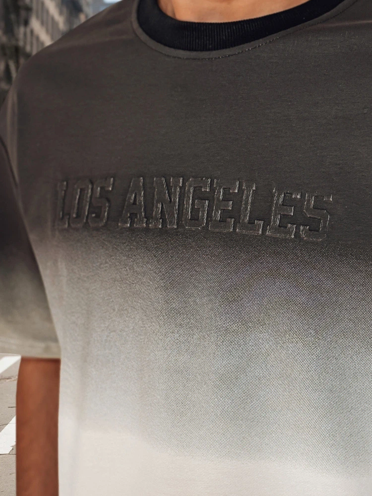 Dwuczęściowy komplet męski, który doskonale sprawdzi się na co dzień. W zestawie koszulka z krótkim rękawem i okrągłym dekoltem oraz spodenki o prostym kroju. Oba elementy zdobi efekt ombré, który przechodzi z ciemniejszego w jaśniejszy ton. Koszulka ma tłoczony napis „LOS ANGELES”, a spodenki posiadają elastyczny pas ze sznurkiem i dwie kieszenie z przodu.