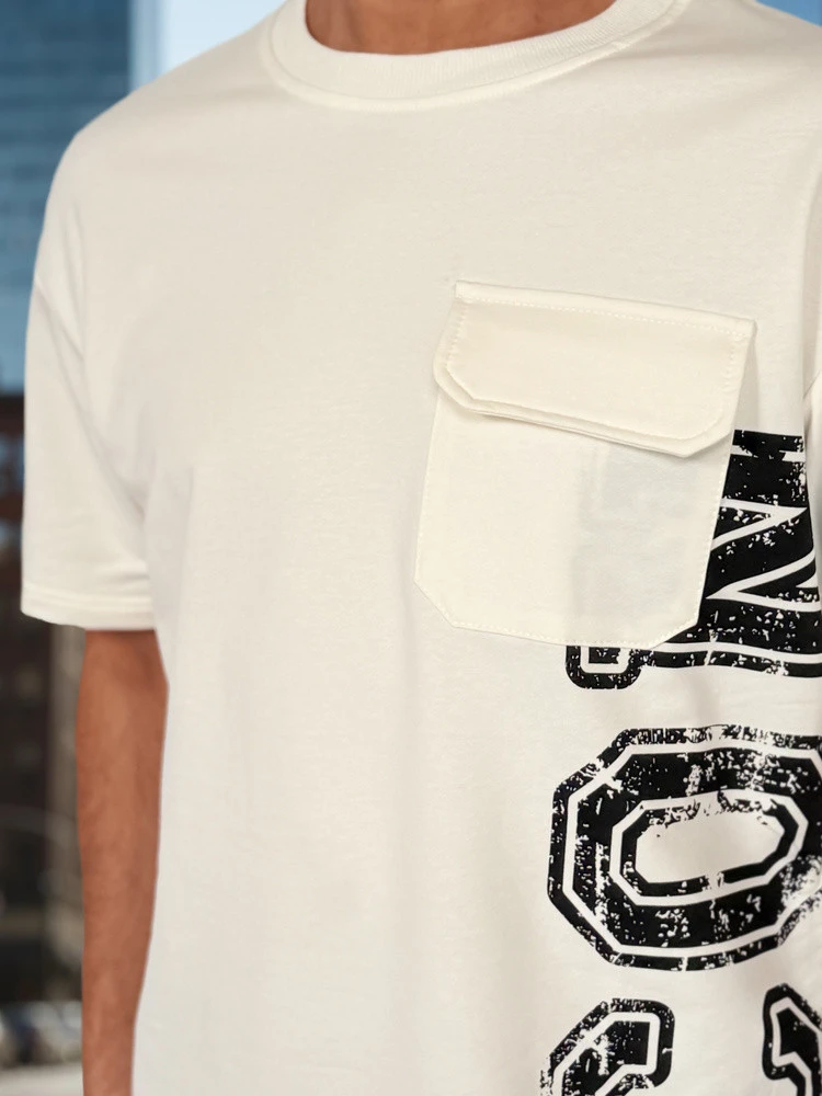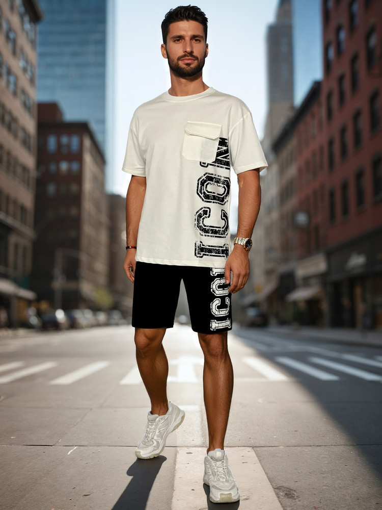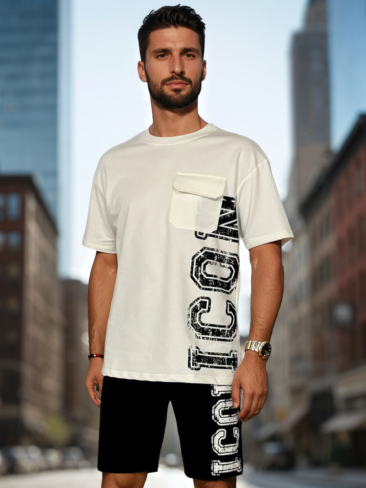 Męski komplet dresowy składający się z t-shirta i krótkich spodenek to nowoczesna propozycja dla fanów wygodnego stylu. Koszulka posiada oryginalny nadruk z napisem "ICON" i kieszonkę z klapką, a krótkie spodenki wyposażone są w elastyczny pas ze sznurkiem oraz zamki w kieszeniach. Całość świetnie sprawdza się w miejskich stylizacjach, na ciepłe dni wiosny.