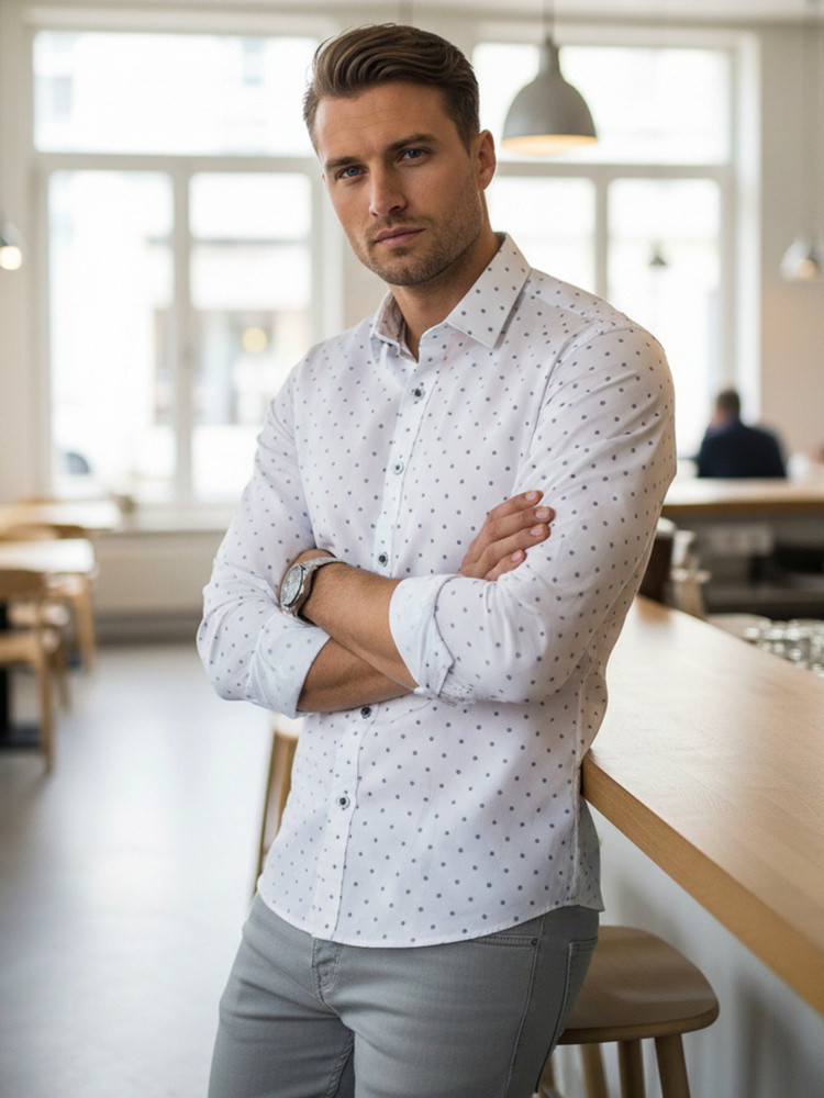 Tato pánská košile slim fit střihu zvýrazňuje siluetu a poskytuje moderní vzhled. Je vyrobena ze směsi bavlny a elastanu a zaručuje pohodlí a volnost pohybu. Jemný vzor jí dodává elegantní a zároveň univerzální vzhled a bude se dobře hodit jak pro pracovní, tak pro elegantní ležérní styling.