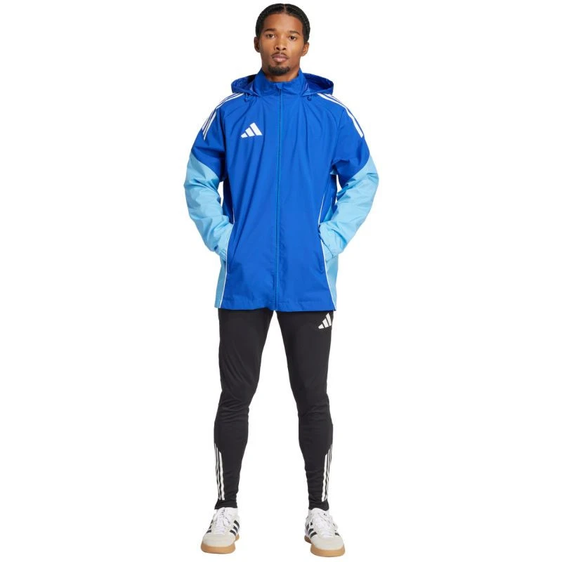Pánská bunda adidas Tiro 25 Competition All-Weather Blue JI8930 Pánská bunda adidas Tiro je ideální na trénink, má zip po celé délce pro rychlé oblékání, náplast na ochranu brady a kapuci s nastavitelným stoperem, kterou lze zastrčit do límce. Technické specifikace:- Vnější vrstva: 100% polyester (recyklovaný)- Vnitřní vrstva: 100% termoplastický polyuretan- Standardní střih- Přední kapsy na zip- Síťovaná podšívka- Skrytá kapuce- Elastické manžety.