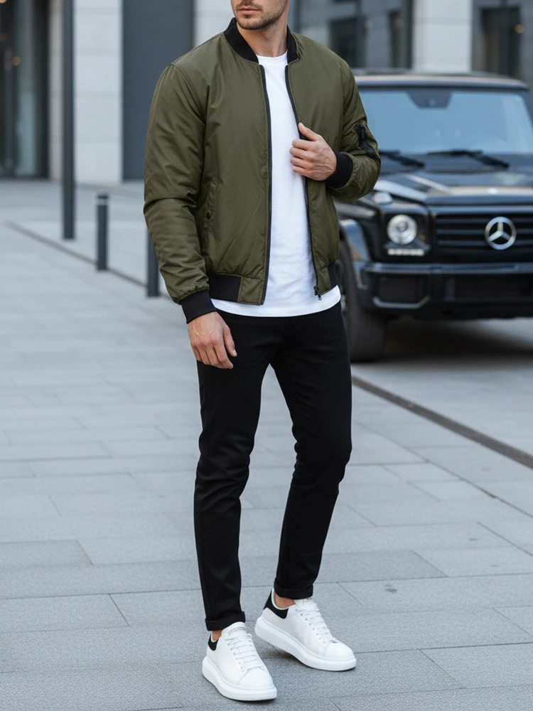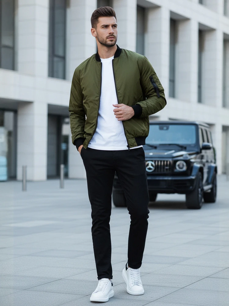 - Pro trochu formálnější styl: Bundu bomber zkombinujte s černým rolákem, tmavými chinos kalhotami a koženými mokasínami, abyste dosáhli kombinace klasiky a moderny.