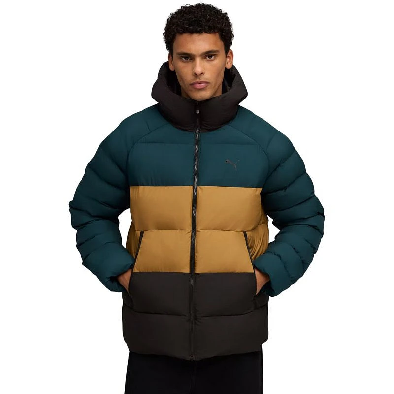 Pánská bunda Puma Mono Hooded Green-Brown-Black 688367 75. Pánská bunda Puma vás v chladných dnech zahřeje a dodá vám sportovní vzhled. Syntetické peří s technologií WarmCell poskytuje spolehlivou ochranu před chladem a je extrémně lehké, takže si zachovává plnou volnost pohybu. Hydrofobní úprava snižuje absorpci vlhkosti. WindCell chrání před větrem. Regularní střih. Prošívané horizontální panely. Boční kapsy na zip. Rovný prošívaný střih. Neodnímatelná kapuce. Bunda vyrobena ze 100% recyklovaných materiálů. Technické údaje:- Materiál: 100% polyester- Výplň: 100% polyester- Podšívka: 100% polyester.