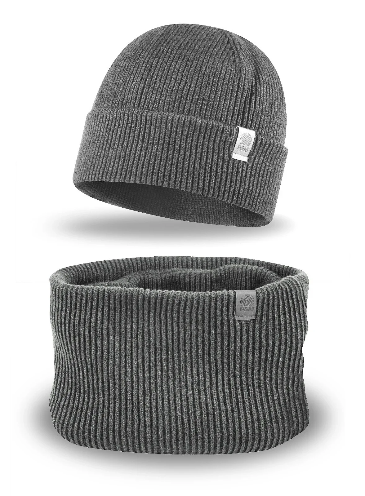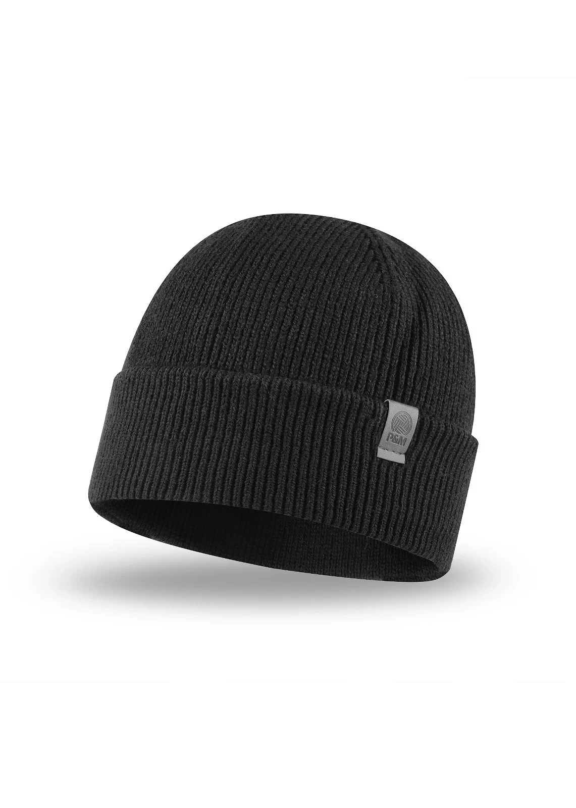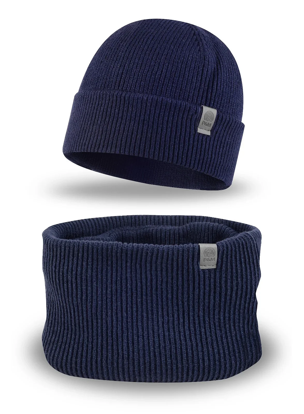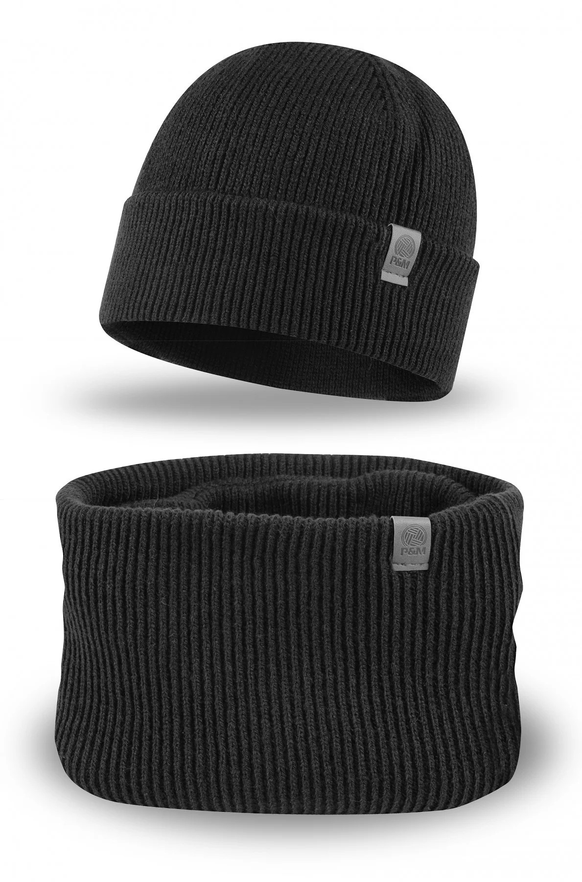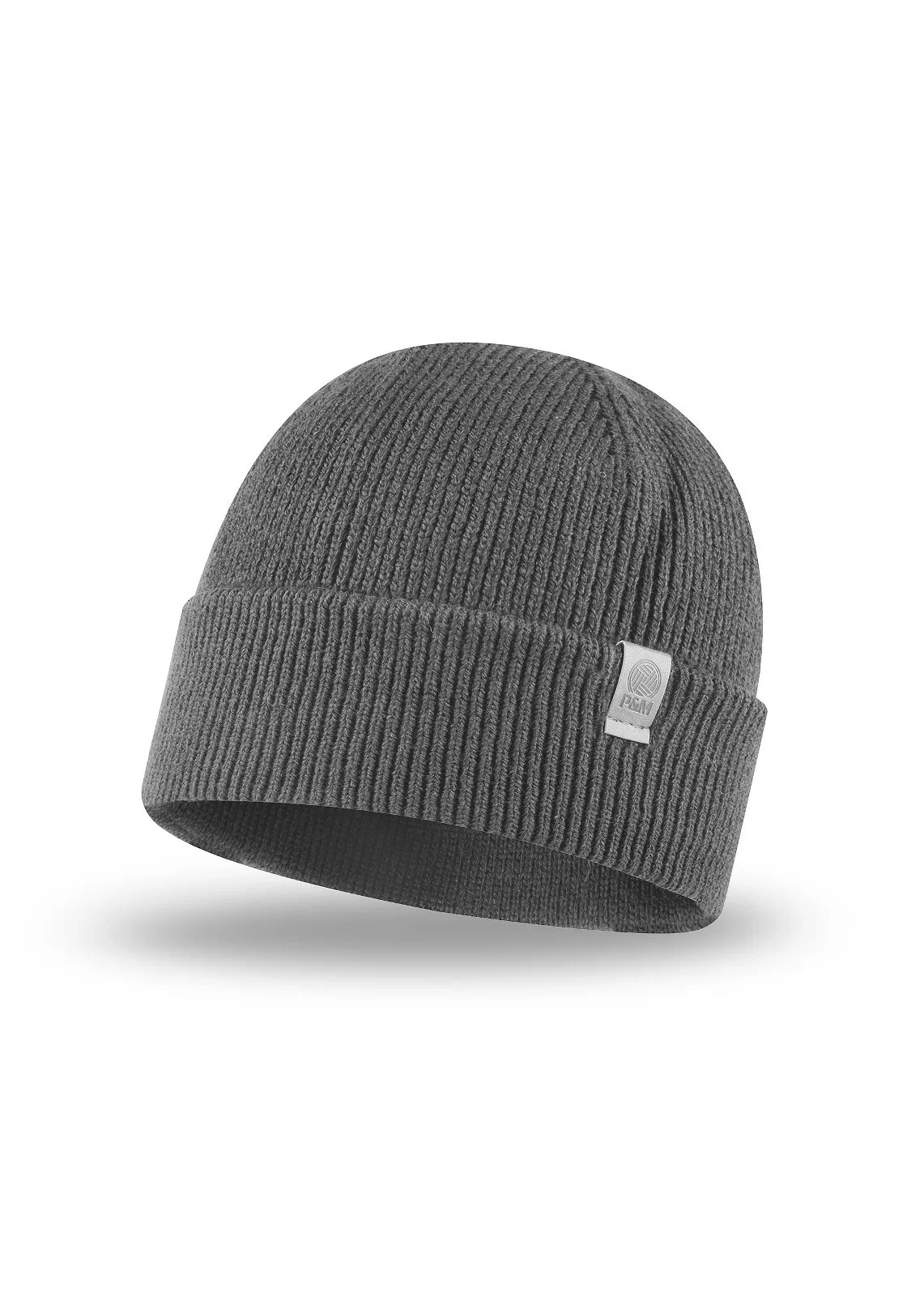 Čepice je vyrobená ze žebrované tkaniny, má ohrnutý lem a je ozdobená nášivkou s logem P&M.