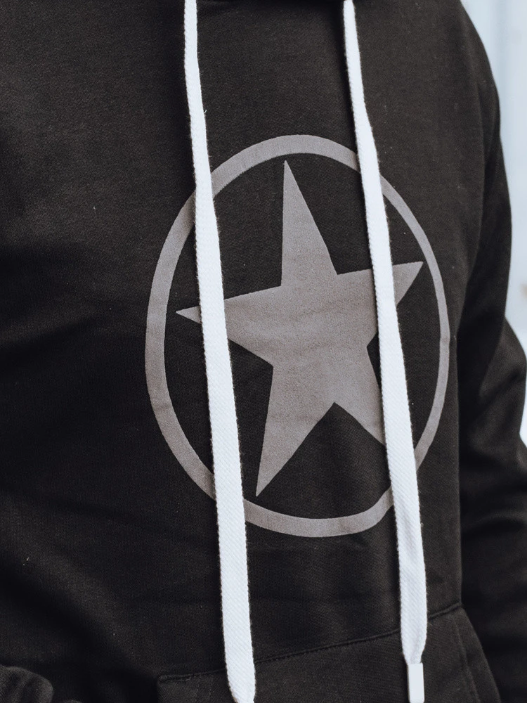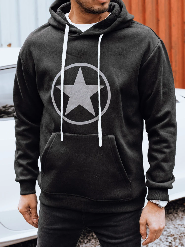 Bluza męska z dużym nadrukiem gwiazdy na froncie, idealna do codziennych stylizacji o sportowym charakterze. Model wykonany z miękkiej, ciepłej tkaniny z ociepleniem meszkiem polarowym od wewnątrz. Posiada praktyczny kaptur regulowany sznurkami, kieszeń typu kangurka oraz elastyczne ściągacze przy rękawach i na dole.