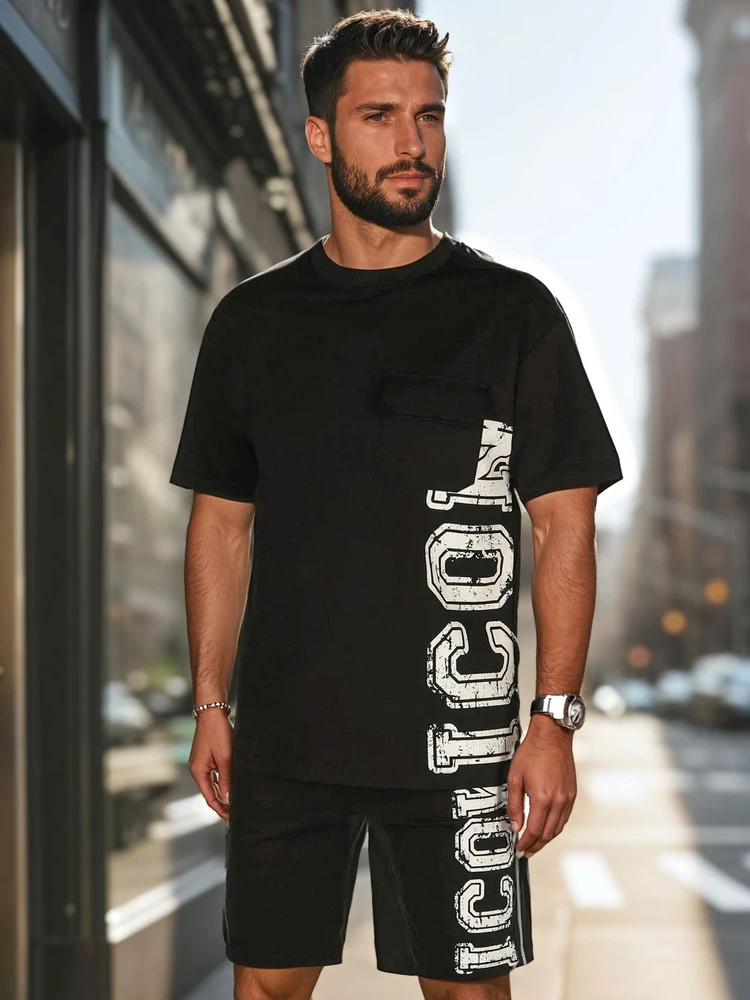 Pánská tepláková souprava sestávající z trička a šortek je moderní volbou pro příznivce pohodlného stylu. Tričko má originální potisk s nápisem "ICON" a kapsu s klopou, zatímco šortky mají elastický pas se stahovací šňůrkou a zipy v kapsách. Celá souprava je ideální pro městský styling v teplých jarních dnech.