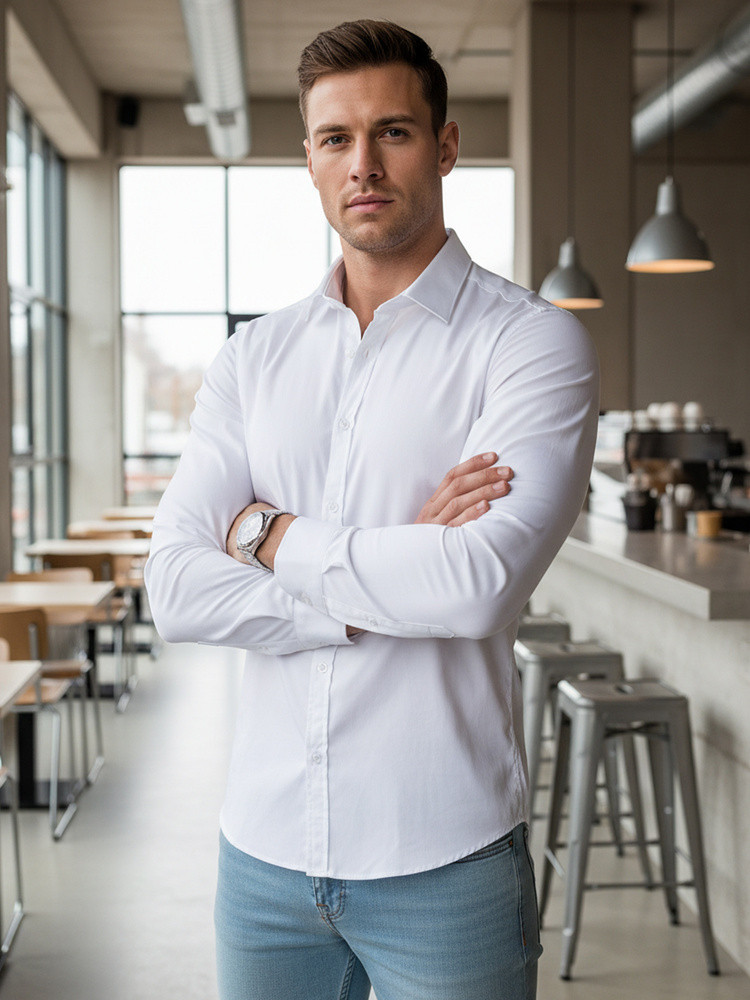 Klasická košile s čistými liniemi, navržená pro každodenní pohodlí a elegantní vzhled. Hladká tkanina s přídavkem elastanu zajišťuje volnost pohybu a dobré přizpůsobení siluetě. Díky univerzálnímu charakteru je model vhodný pro kancelářský i poloformální styling.
