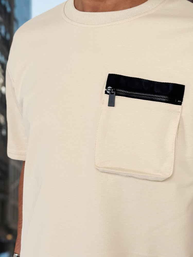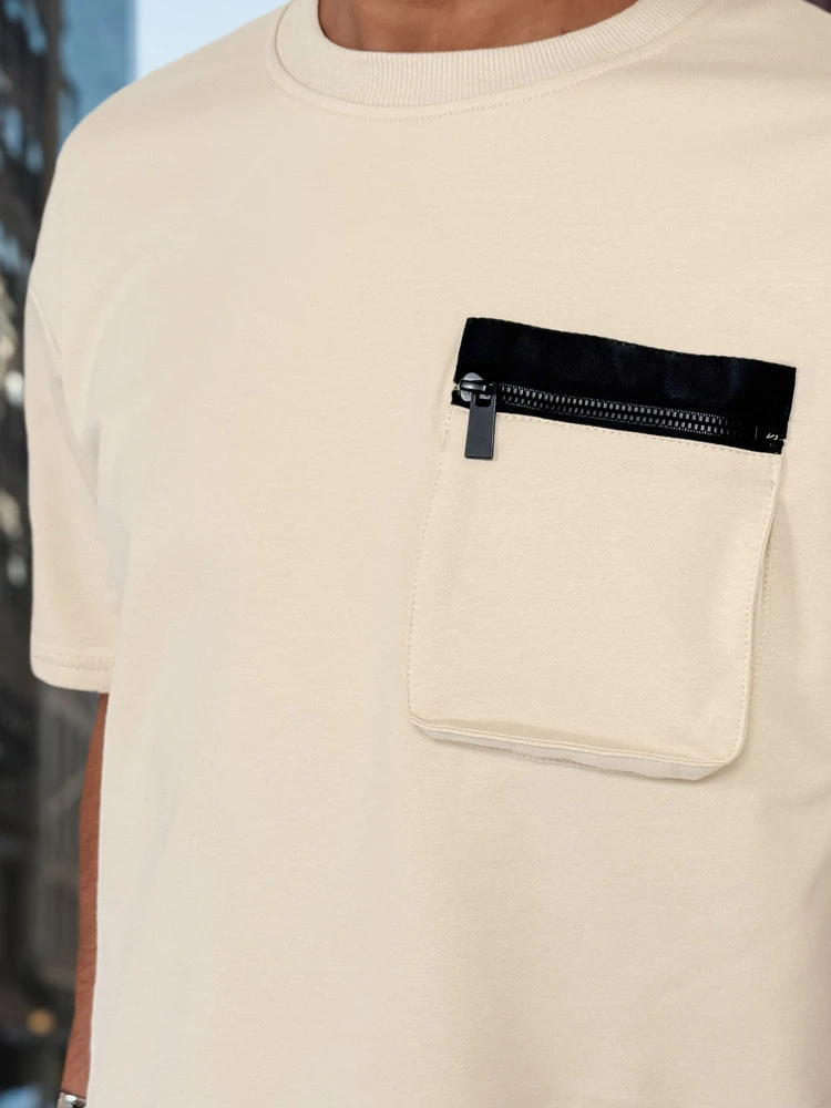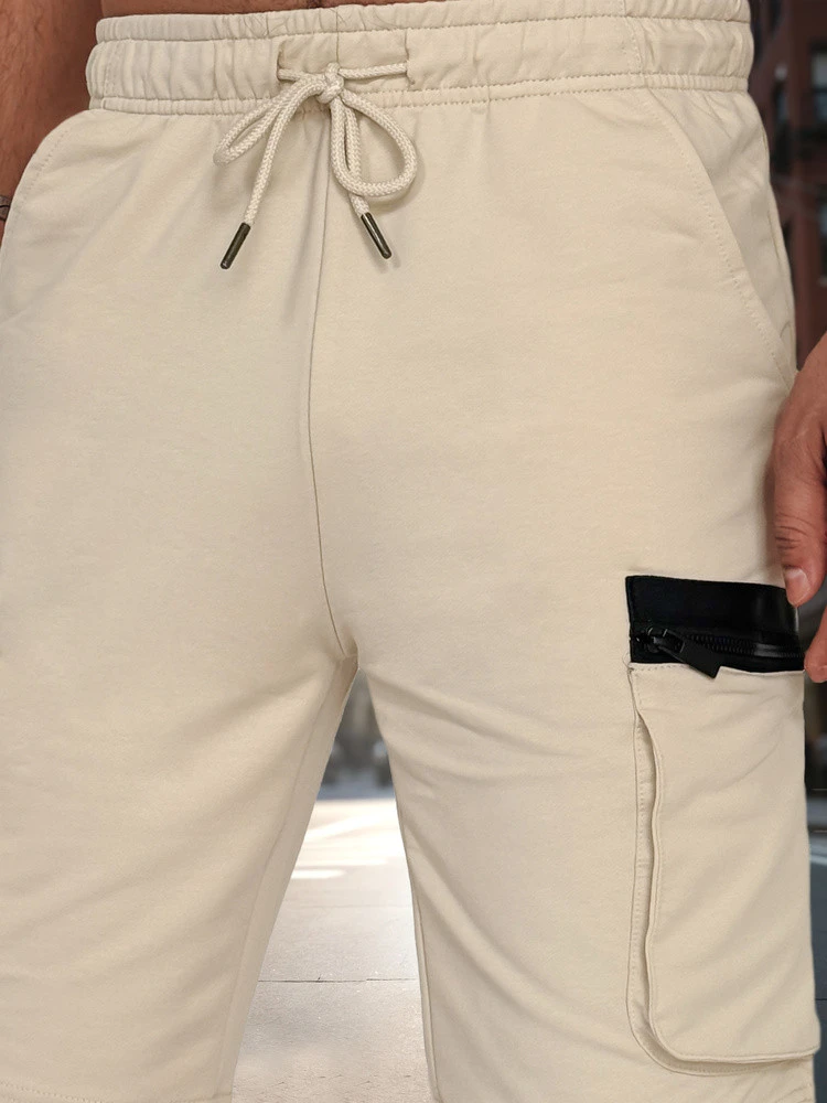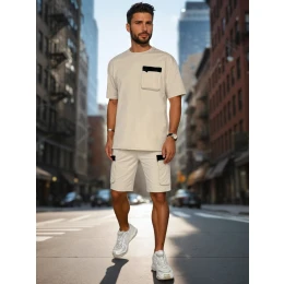 Dwuczęściowy męski komplet dresowy to propozycja z modnym charakterem. Koszulka z krótkim rękawem wyróżnia się ozdobną kieszenią na piersi, zapinaną na suwak. Zaokrąglony dekolt i dopracowany krój zapewniają komfort przez cały dzień. Spodenki typu cargo posiadają cztery kieszenie, miękki ściągacz w pasie oraz sznurek do regulacji. Całość wykonana z przyjemnego materiału, który świetnie sprawdza się w wiosenne dni, zarówno w mieście, jak i podczas aktywności.