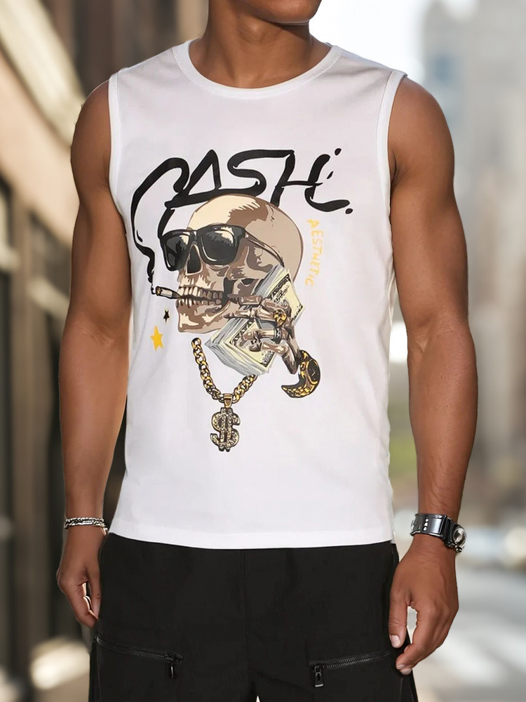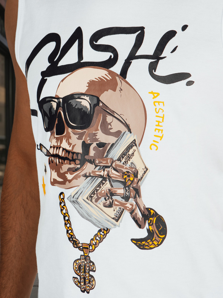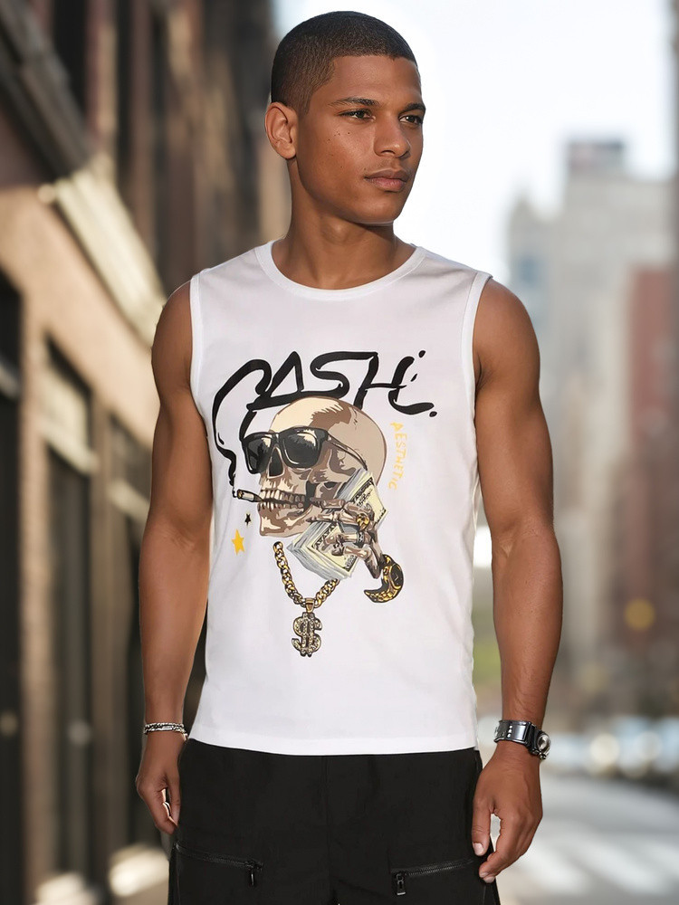 Tričko bez rukávů s městským potiskem je tou správnou volbou pro muže, kteří hledají výrazný akcent ke svému letnímu outfitu. Výstřih, klasický střih a výrazný potisk s motivem lebky a nápisem "CASH" dodávají tričku módní a mladistvý nádech. Skvěle se hodí na jarní a letní procházky městem.