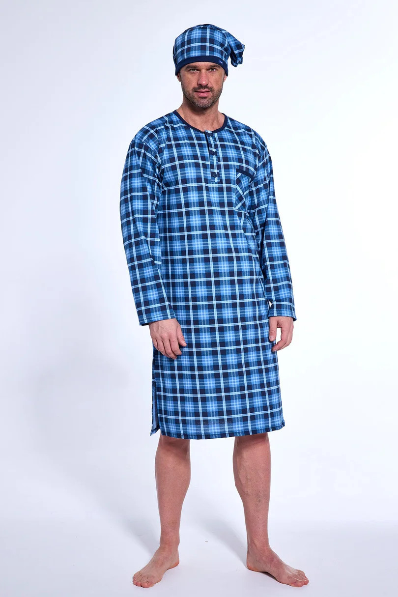 Pánská noční košile s dlouhými rukávy z extra měkké bavlny, zapínání na knoflíky vpředu, baleno v krabici.