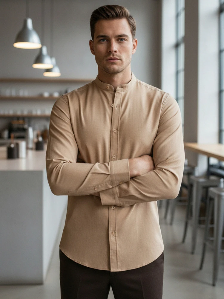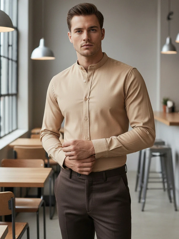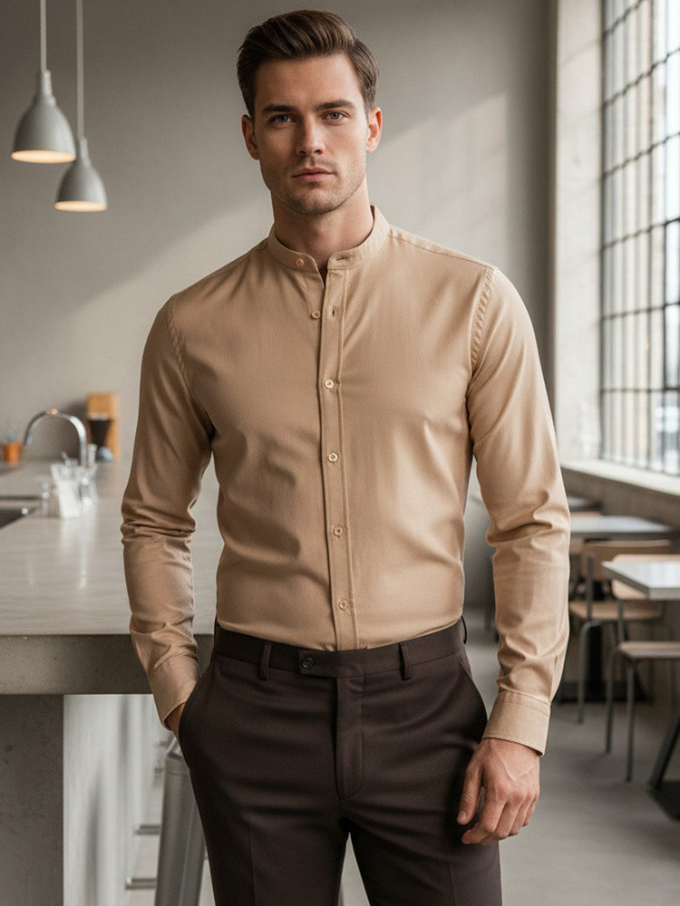 Pánská ležérní béžová košile SLIM FIT se stojáčkem FashionStreet DX2601