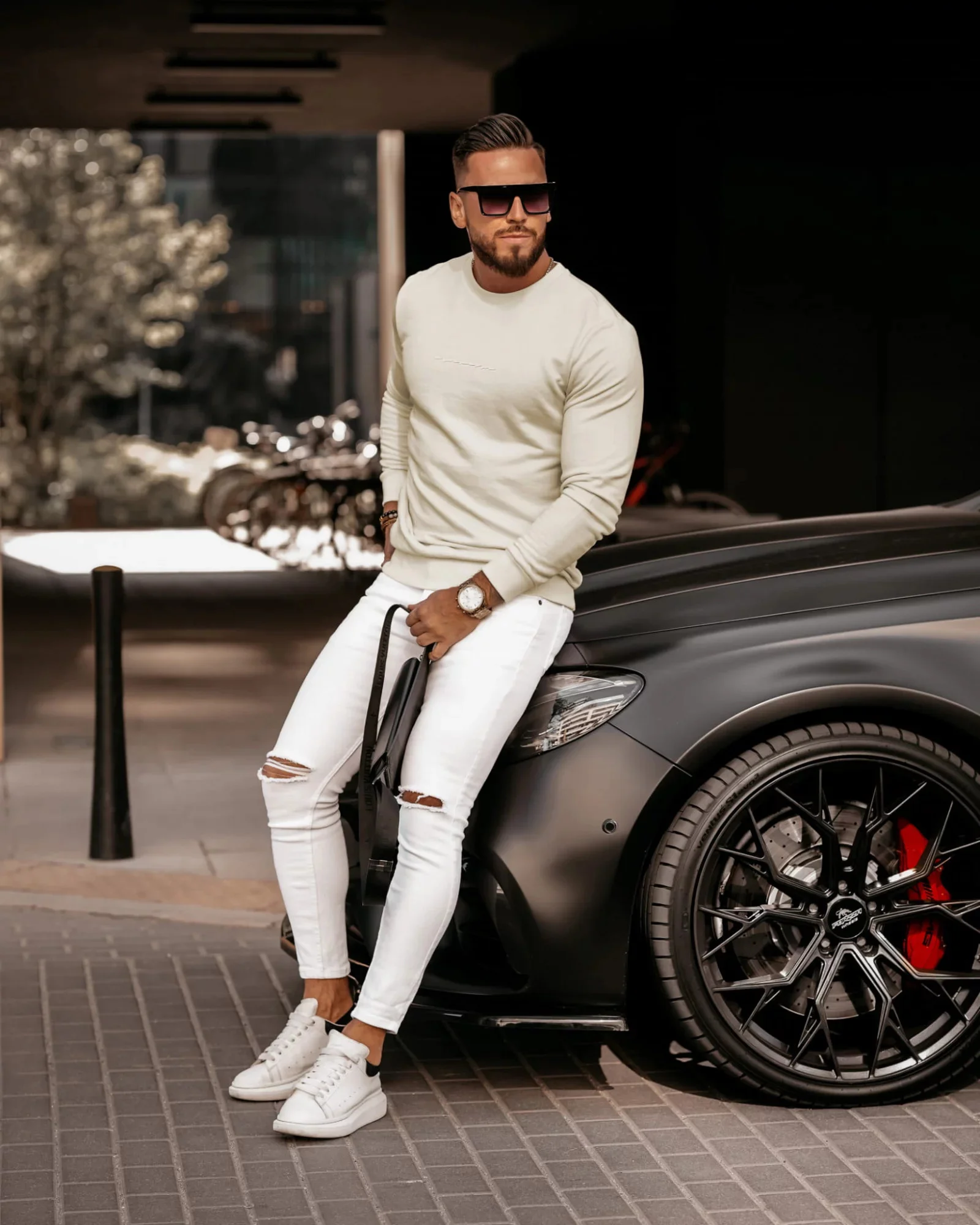 Model nosí velikost M, měří 182 cm a váží 85 kg.