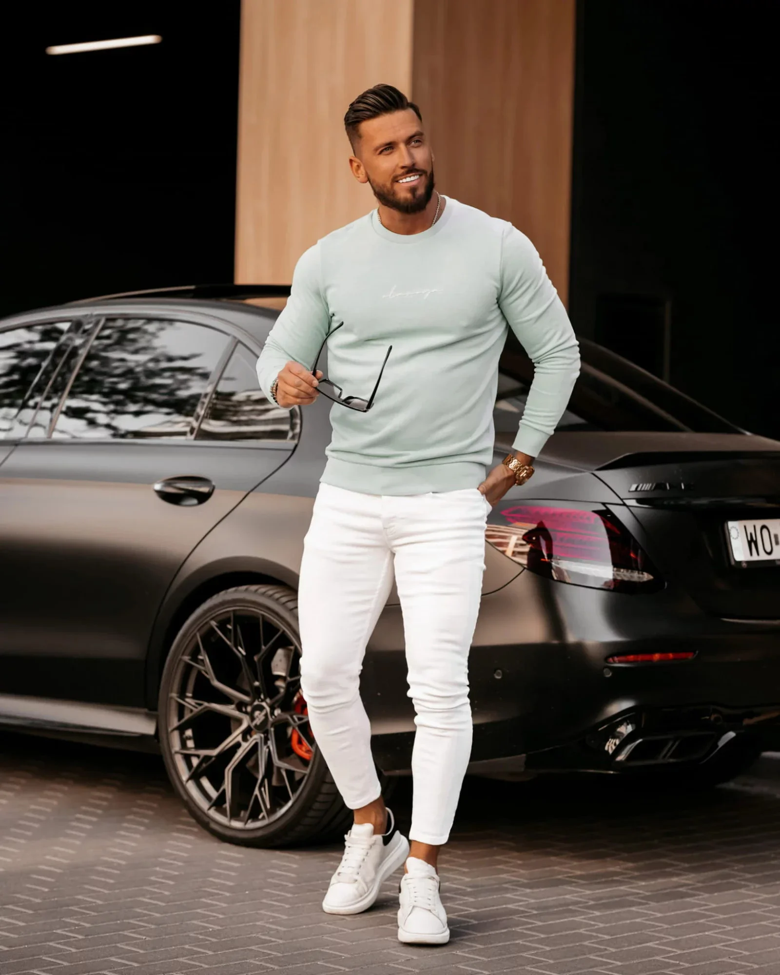Model nosí velikost M, měří 182 cm a váží 85 kg.