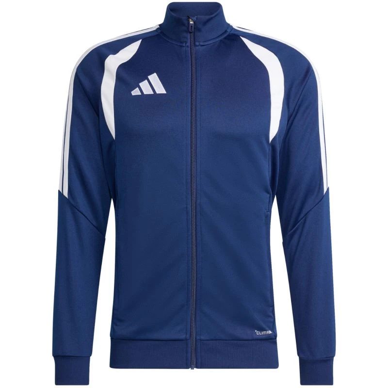 Pánská fotbalová mikina adidas Tiro 26 League Training v tmavě modré barvě JY7205. Tato pánská fotbalová mikina adidas je ideální na trénink. stojáček. zip po celé délce. střih na míru. technologie Climacoool pro absorpci a odvod vlhkosti. síťované vsadky na hrudi. boční kapsy na zip. nášivka na ochranu brady. pruhy na rukávech. decentní logo. recyklovaná vlákna. materiál: 100% recyklovaný polyester.