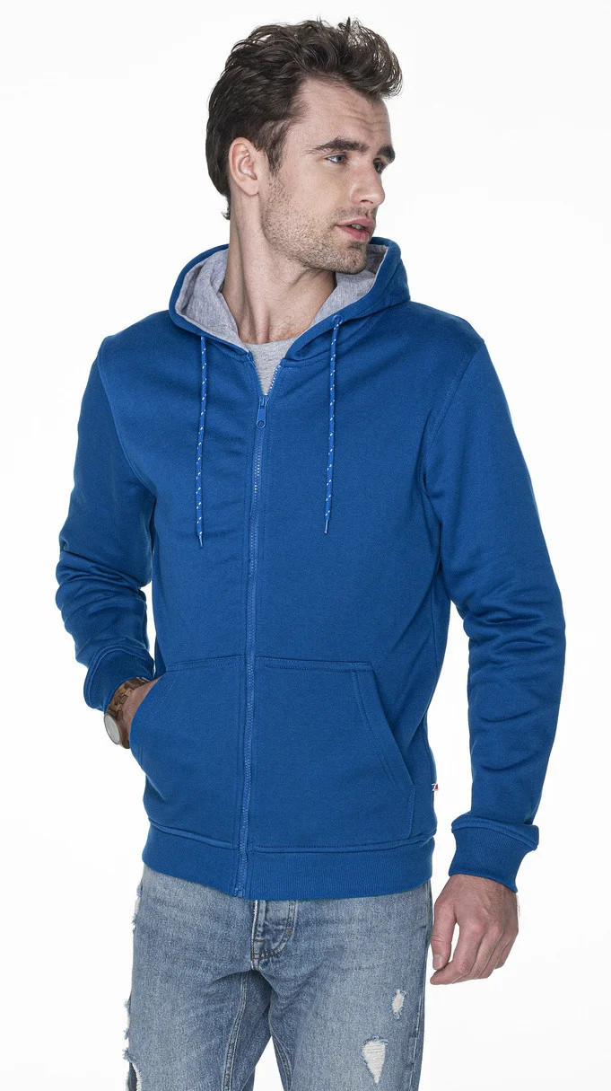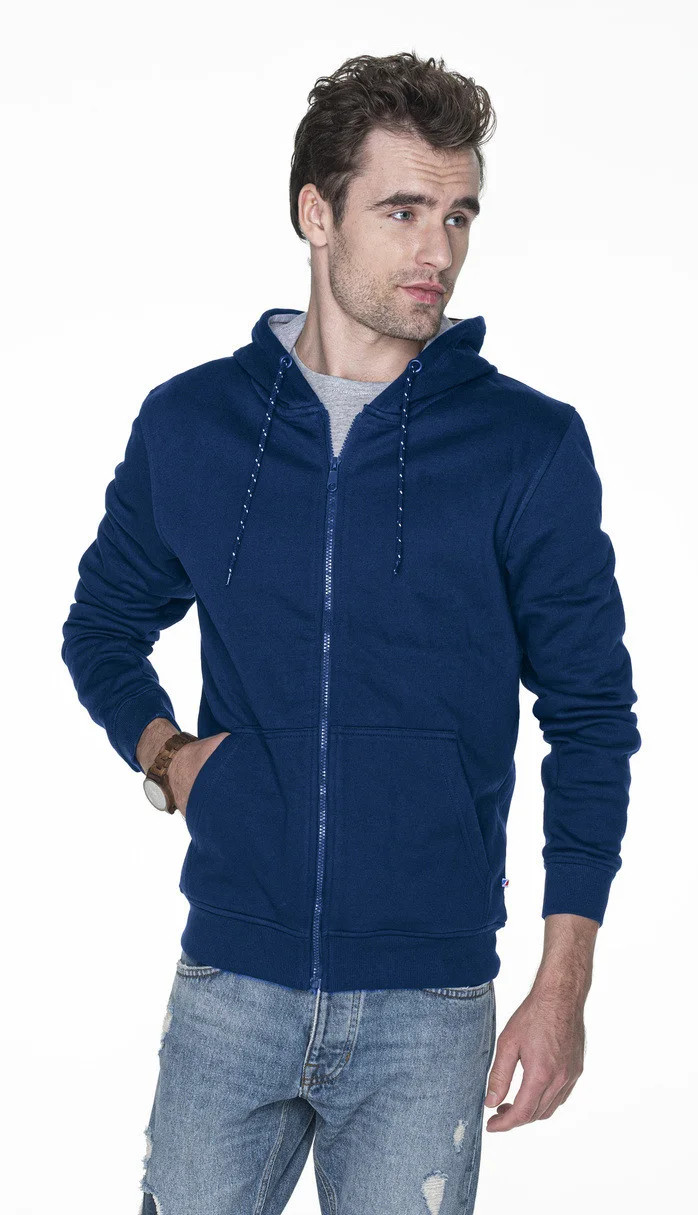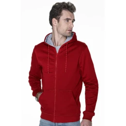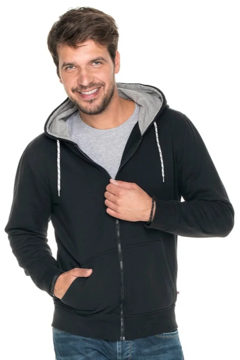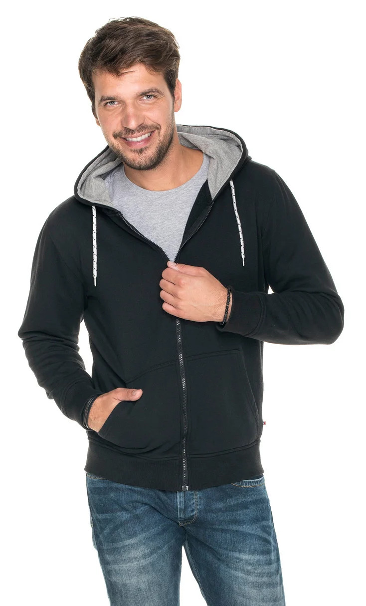 Pánská mikina s kapucí. Vnitřní strana česaná, vnější strana je odolná proti žmolkování. Kapuce má vevnitř kontrastní barvu a reguluje se ozdobnou šňůrkou. Zip je umělohmotný. Vpředu jsou dvě velké kapsy. Rukávy a spodní okraj zakončené pružným lemem.