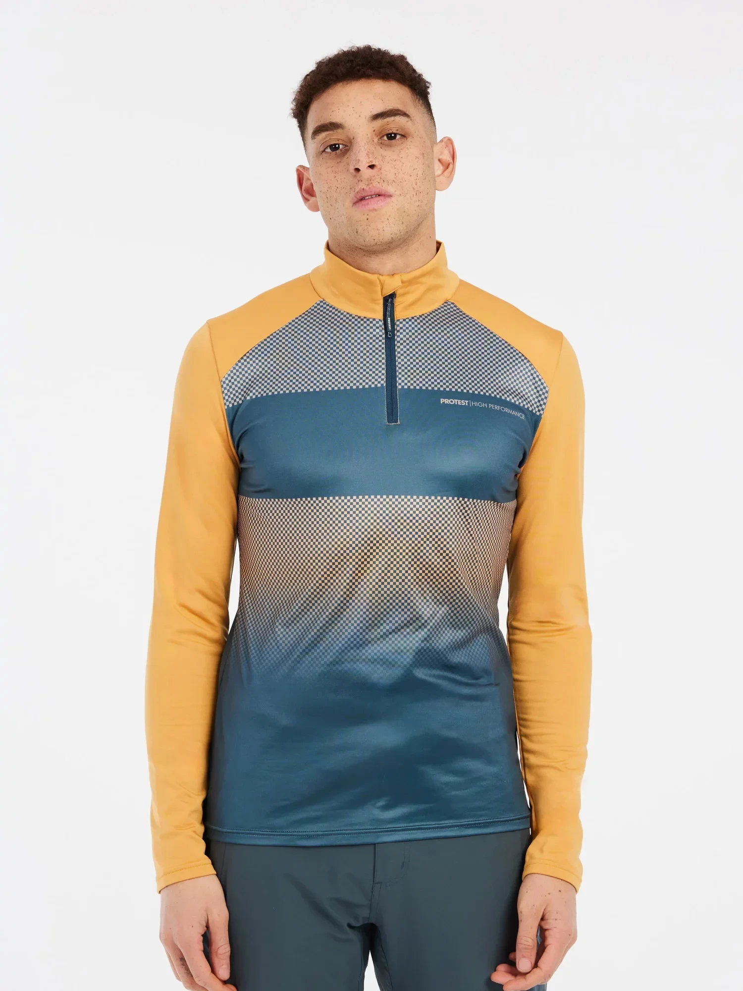 PRTENVILLE běžné délky zaujme moderním stylem díky čtvrtzipu, kostkovanému designu na hrudi a přiléhavému střihu.