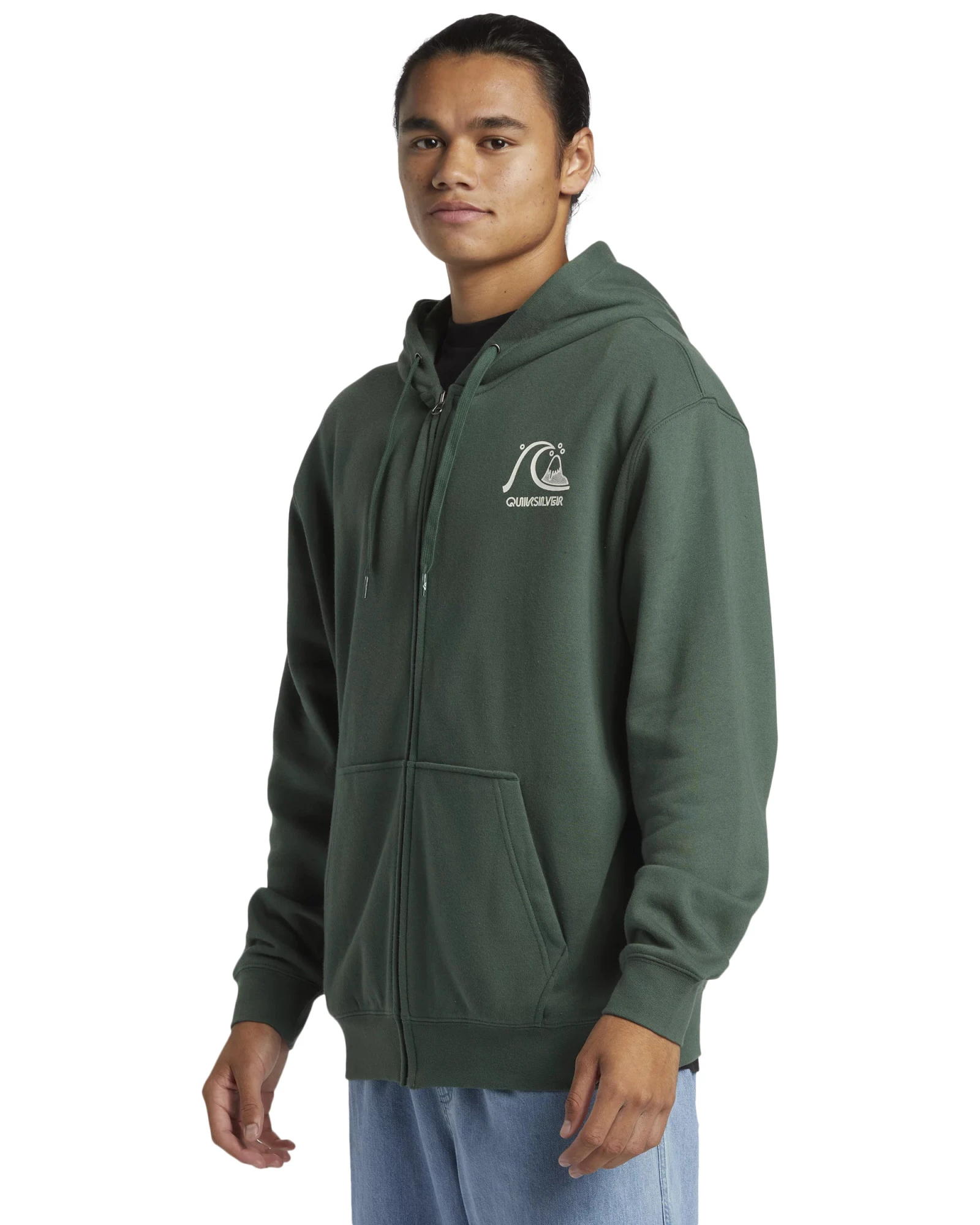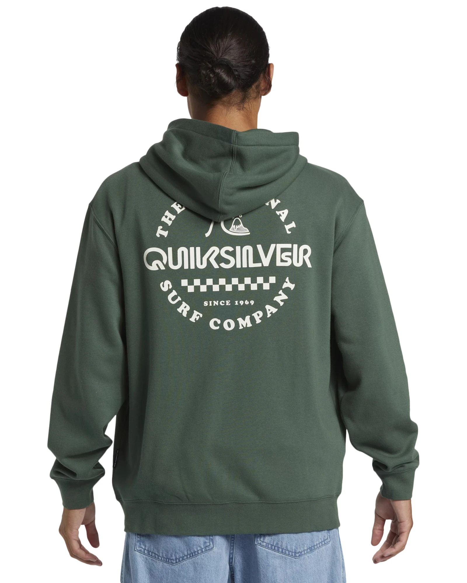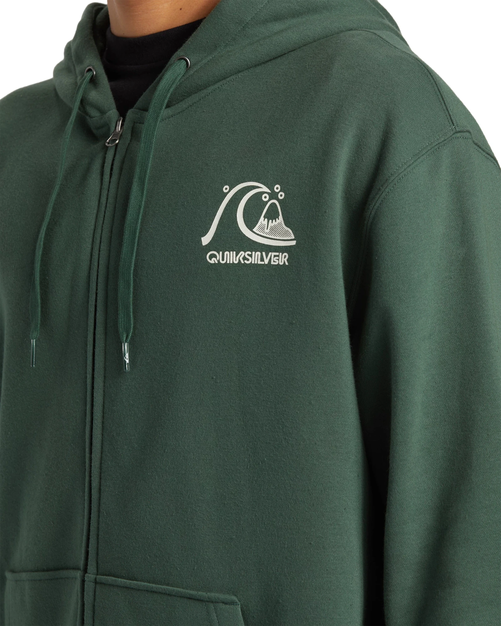 Velký potisk na zádech. Sítotisk na levé straně hrudi. Tkaný štítek Quiksilver integrovaný do bočního švu.