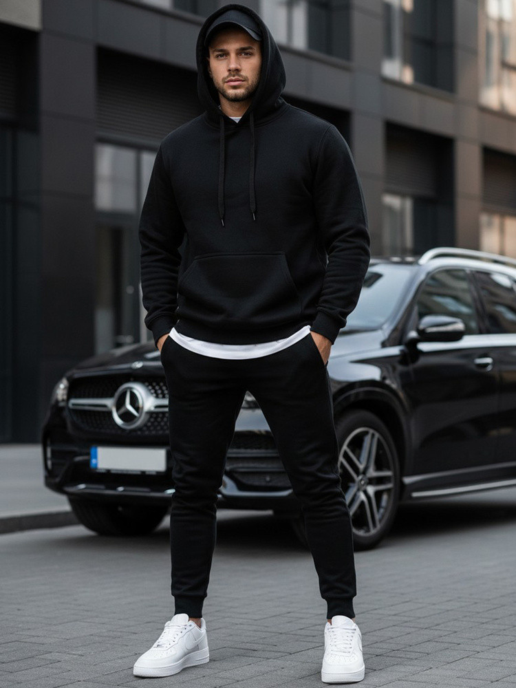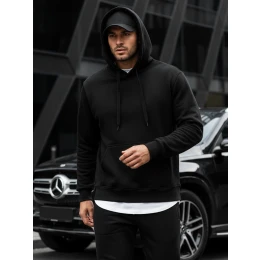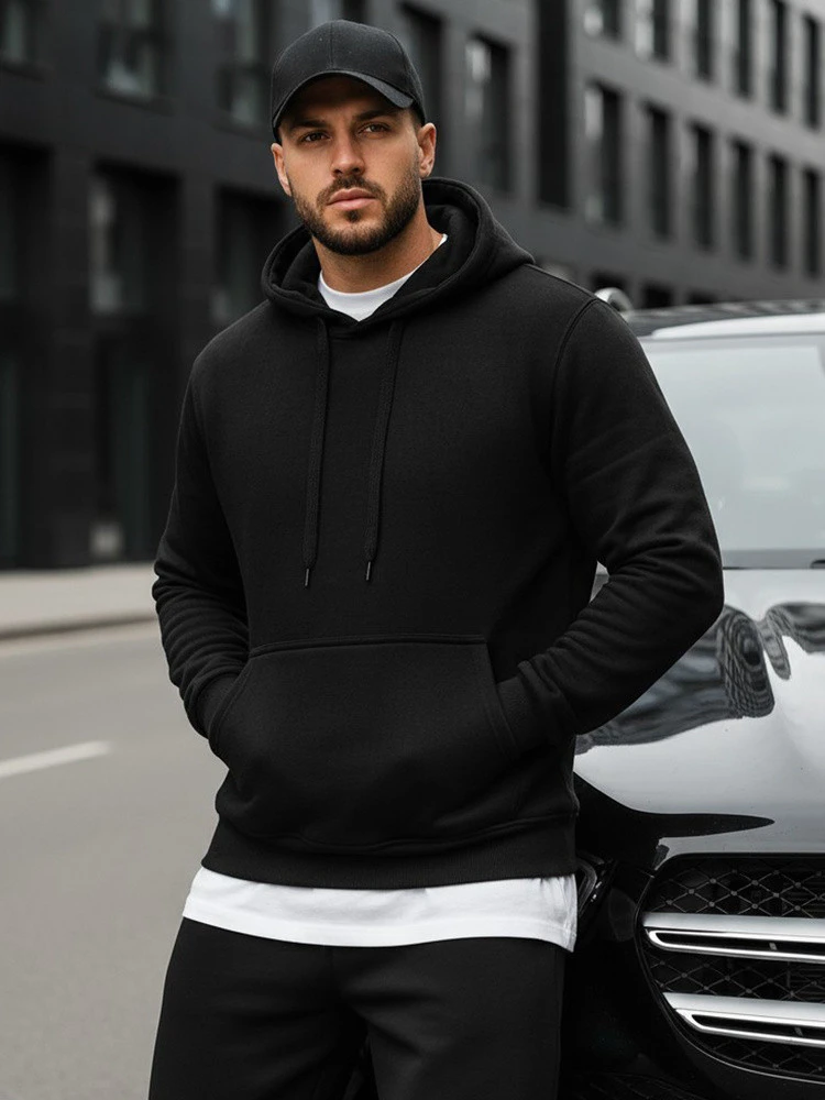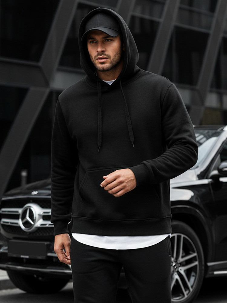 Oferowana bluza jest w kolorze intensywnej czerni, dzięki czemu jest uniwersalna i będzie pasowała do każdej stylizacji - idealnie skomponuje się z modnymi joggerami, swobodnymi chinosami czy dopasowanymi rurkami. Przedstawiany model jest niezwykle wygodny ze względu na to, że jest zakładany przez głowę i posiada kaptur z regulowanymi sznurkami, dzięki któremu można ochronić się przez wiatrem i deszczem. Ogromną zaletą jest to, że bluza została wyposażona w pojemną kieszeń typu kangur, która umożliwi schowanie telefonu czy portfela bez efektu wypchania. Ta czarna bluza z kapturem męska została uszyta z miękkiej i komfortowej bawełny (przeważa w składzie, ponieważ stanowi 65% materiału), co daje zapewnia swobodę ruchów podczas każdej aktywności oraz przewiewność podczas treningu. Zastosowanie wysokiej jakości materiałów jest gwarancją długiego użytkowania i nie tracenia koloru. Rękawy oraz dół bluzy zostałe zakończone praktycznymi ściągaczami a luźny fason do