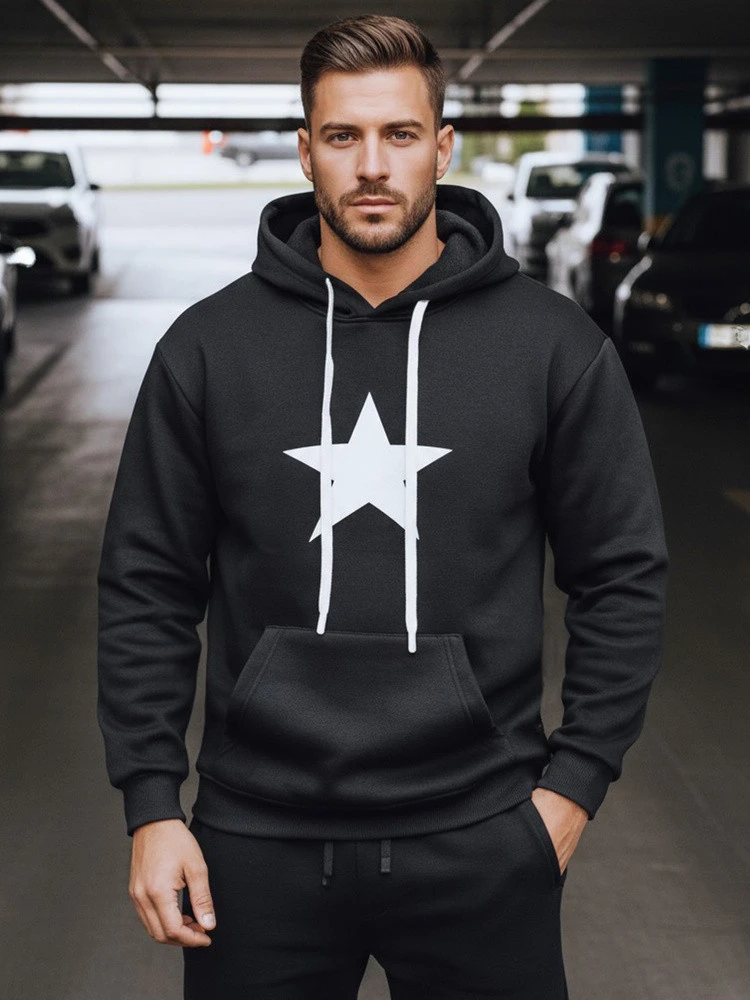 Bluza męska z kapturem o prostym kroju, idealna do codziennych, miejskich stylizacji. Model posiada duży nadruk gwiazdy na przodzie, pojemną kieszeń typu kangurka oraz ściągacze przy rękawach i na dole, które gwarantują dopasowanie i wygodę. Miękki materiał z ociepleniem od wewnątrz sprawia, że bluza doskonale sprawdzi się w chłodniejsze dni.