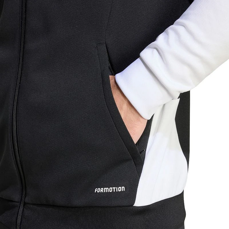 Pánská fotbalová mikina adidas Tiro 26 Competition Training černá KA7680 Tato pánská fotbalová mikina adidas je ideální na trénink. Stojáček. Dlouhý zip s ochrannou légou. Přiléhavý střih. Technologie Formotion pro větší pohyblivost. Vložky ze síťoviny na hrudi. Pruhy na ramenou. Jemné logo na hrudi. Kontrastní vložky na rukávech a bocích. Rychleschnoucí vlákna. Materiál: 100% recyklovaný polyester.