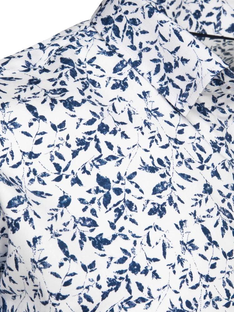 Tato pánská ležérní košile s dlouhým rukávem z lehké tkaniny je ideální volbou na jaro, má klasický límec a poutavý stylizovaný vzor listů, úzký střih, který se dokonale přizpůsobí tělu, a nastavitelné manžety pro pohodlné nošení, ideální pro elegantní ležérní styling.