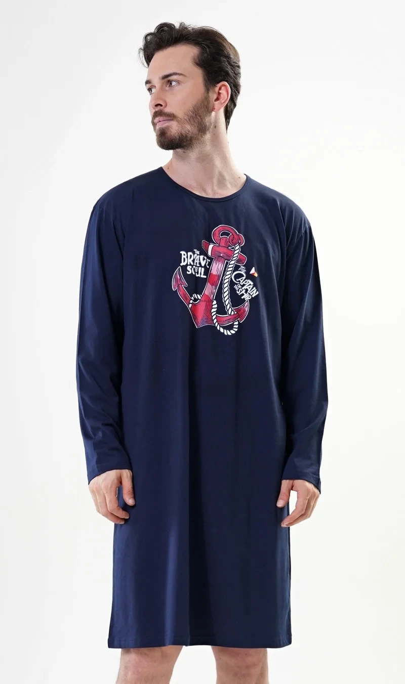 Pánská bavlněná noční košile s dlouhým rukávem Kotva. Pánská noční košile s dlouhým rukávem má na hrudi výrazný obrázek kotvy. Použitý bavlněný materiál je příjemný a poddajný na dotek.