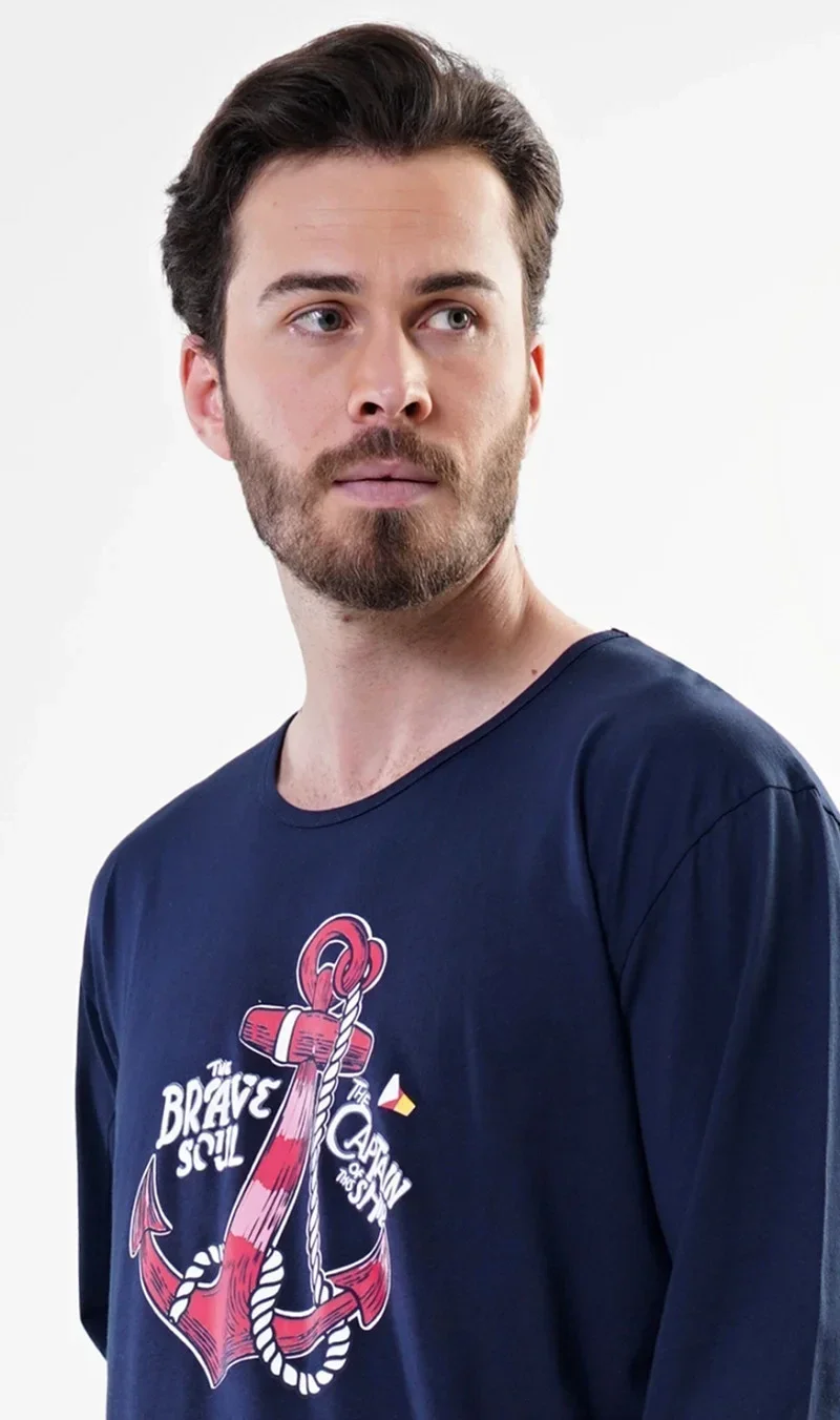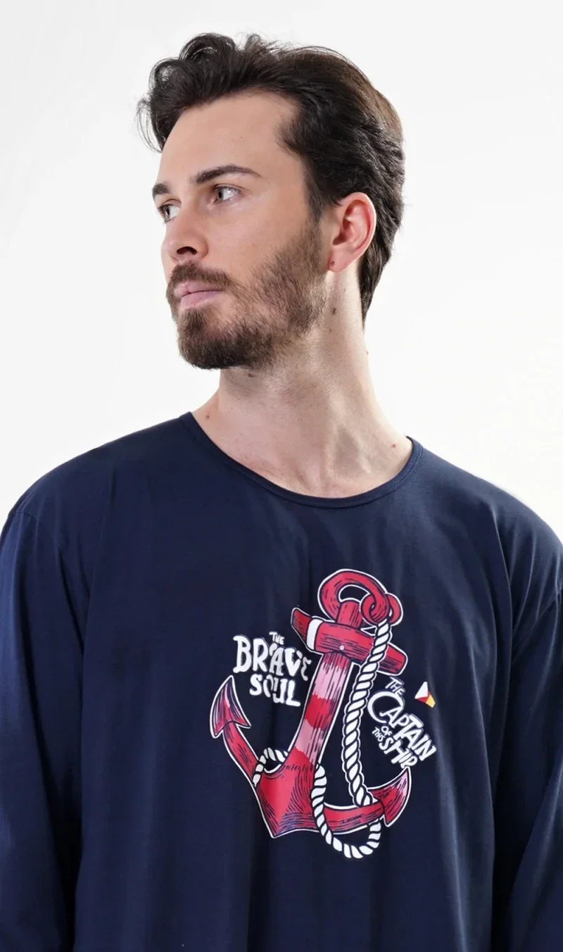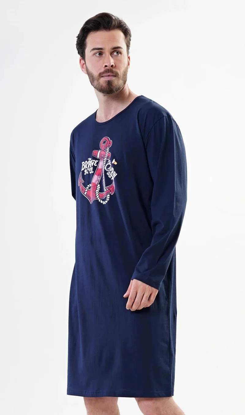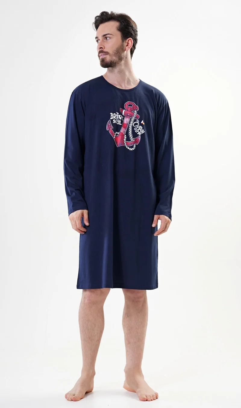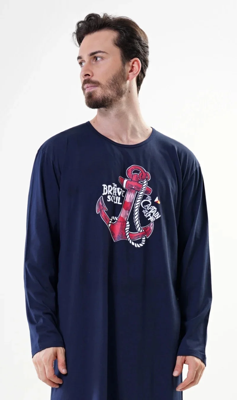 Pánská noční košile s dlouhým rukávem Kotva. Pánská noční košile s dlouhým rukávem má na hrudi obrázek výrazné kotvy. Použitý materiál je jemný a poddajný na dotek.