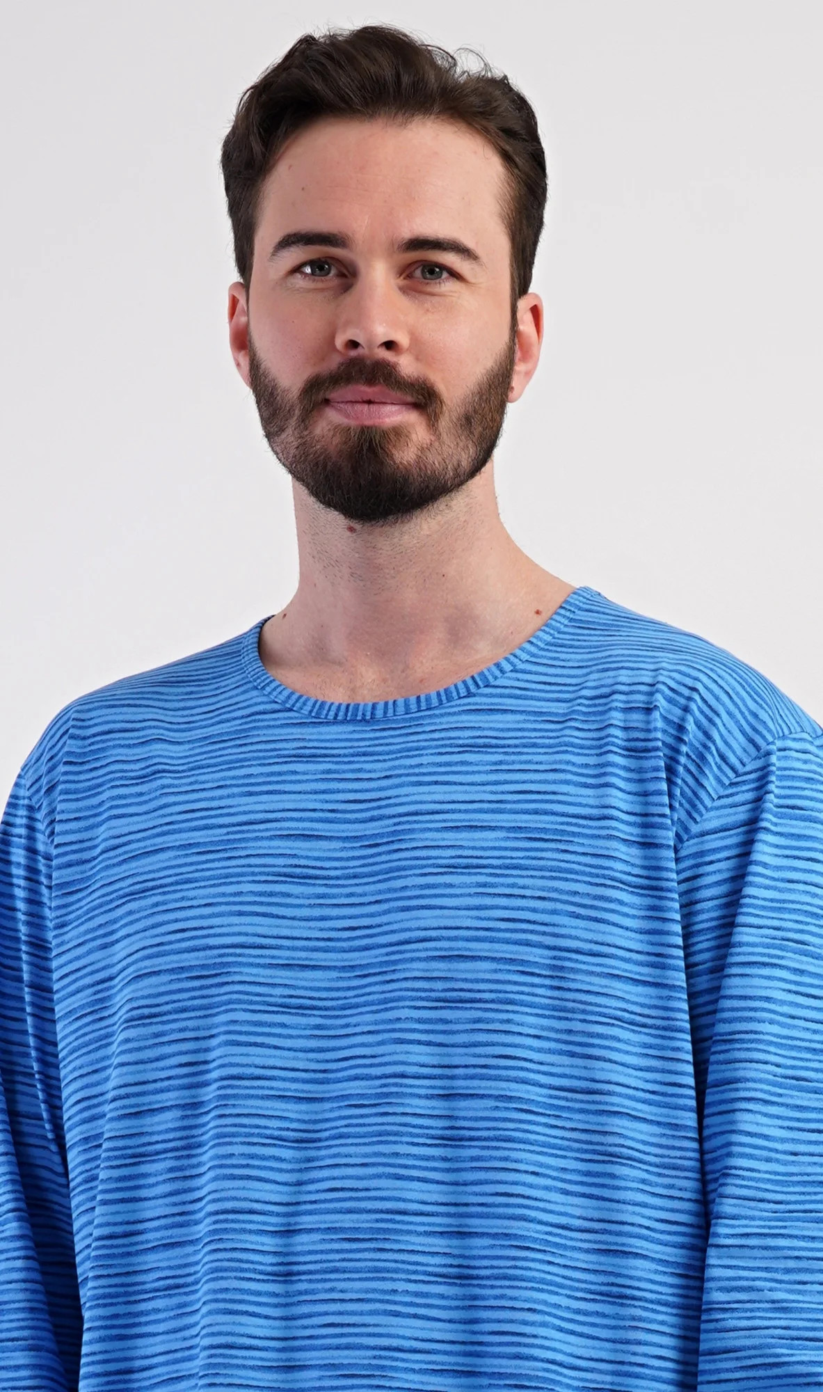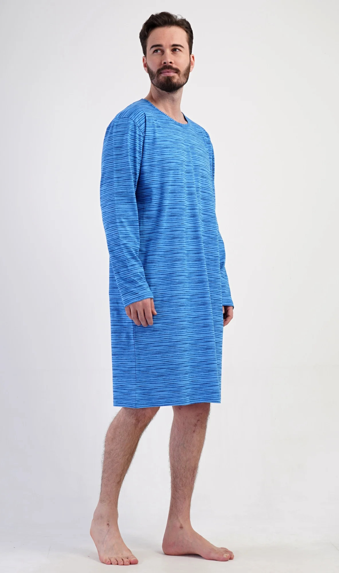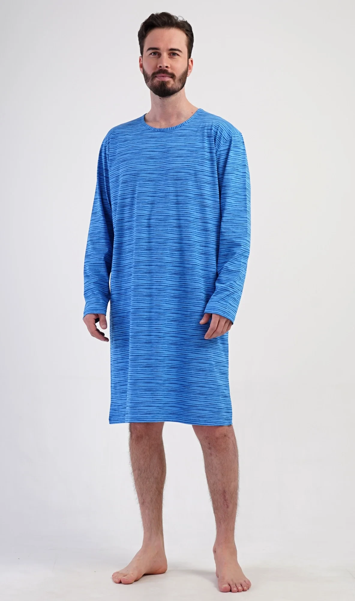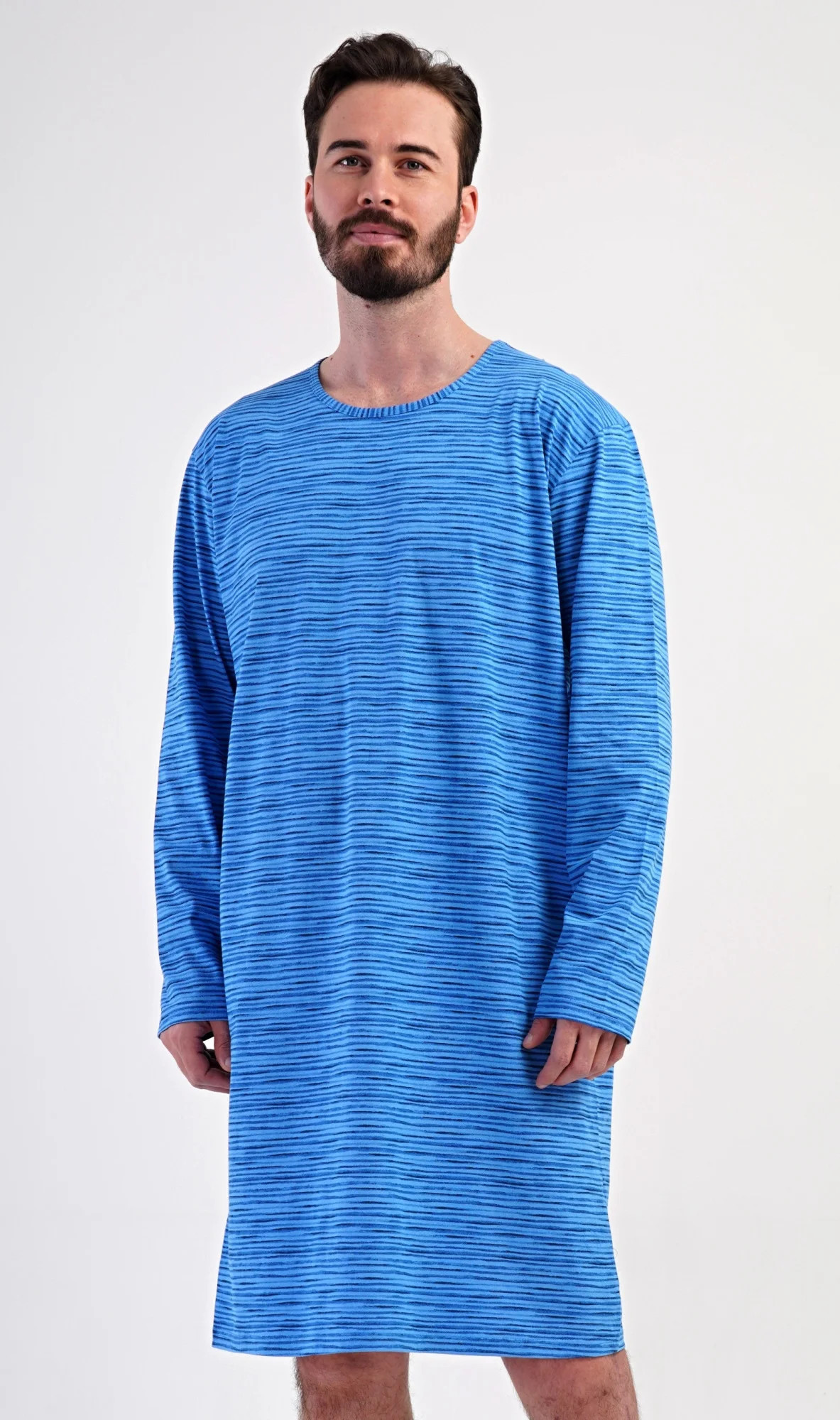 Pánská bavlněná noční košile s dlouhým rukávem Sebastian. Noční košili s kulatým výstřihem a délkou po kolena zdobí jemné proužky. Je vhodným dárkem pro všechny milovníky pohodlného spaní. Použitý materiál s obsahem bavlny 100% je příjemný a poddajný na dotek.