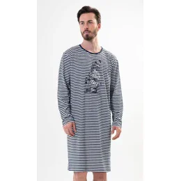 Pánská bavlněná noční košile s dlouhým rukávem Plachetnice. Pánská noční košile s kulatým výstřihem pro všechny milovníky pohodlí. Na pruhovaném podkladu košile je veliká plachetnice. Touto noční košilí potěšíte všechny milovníky dálek. Použitý bavlněný materiál je příjemný a poddajný na dotek.