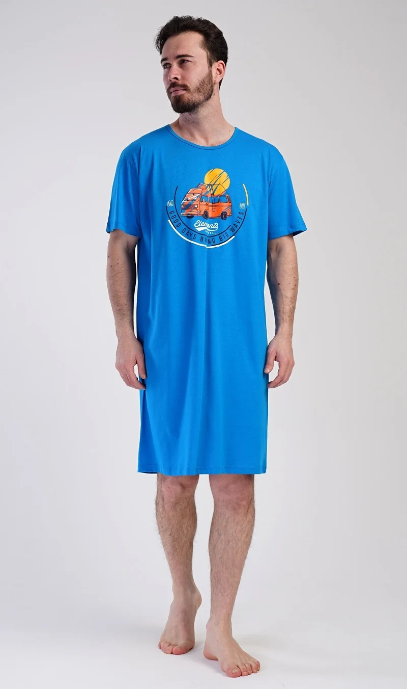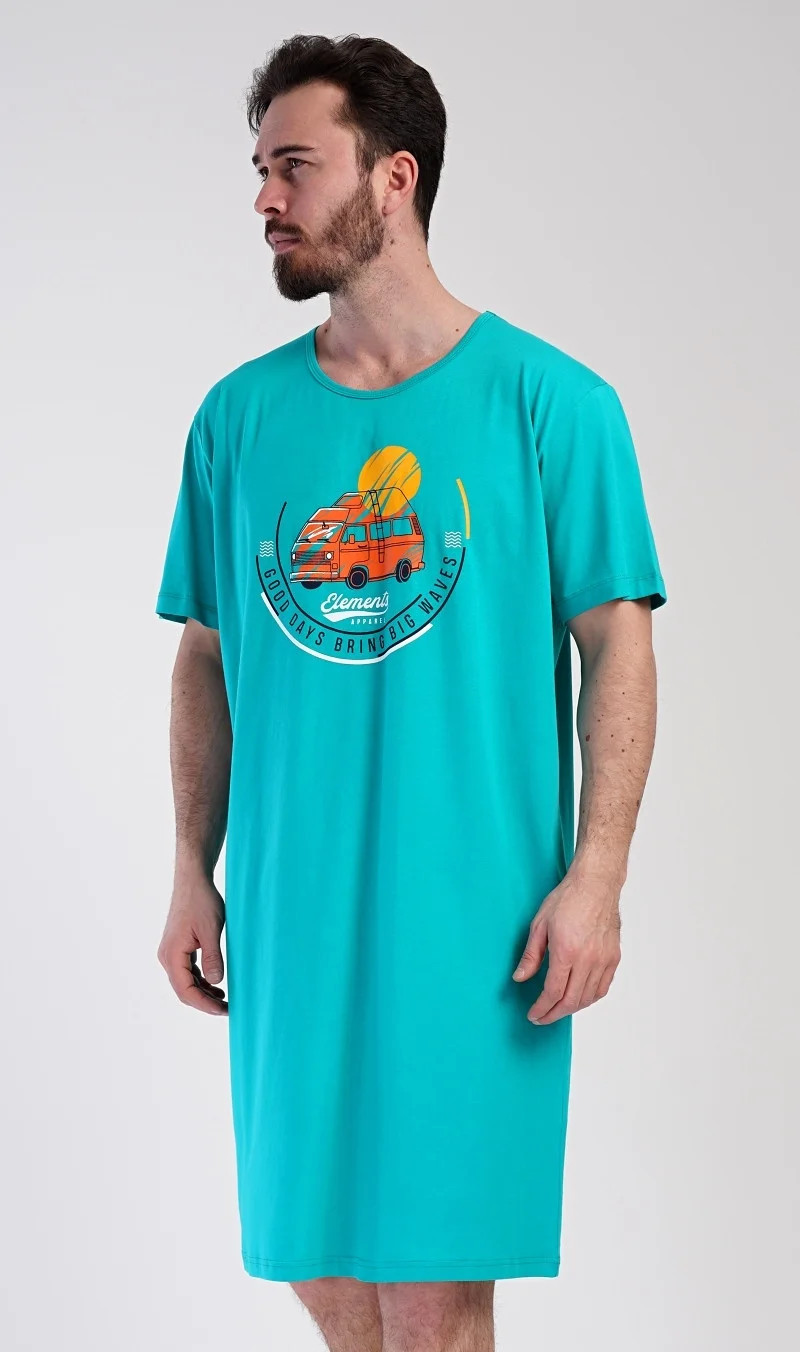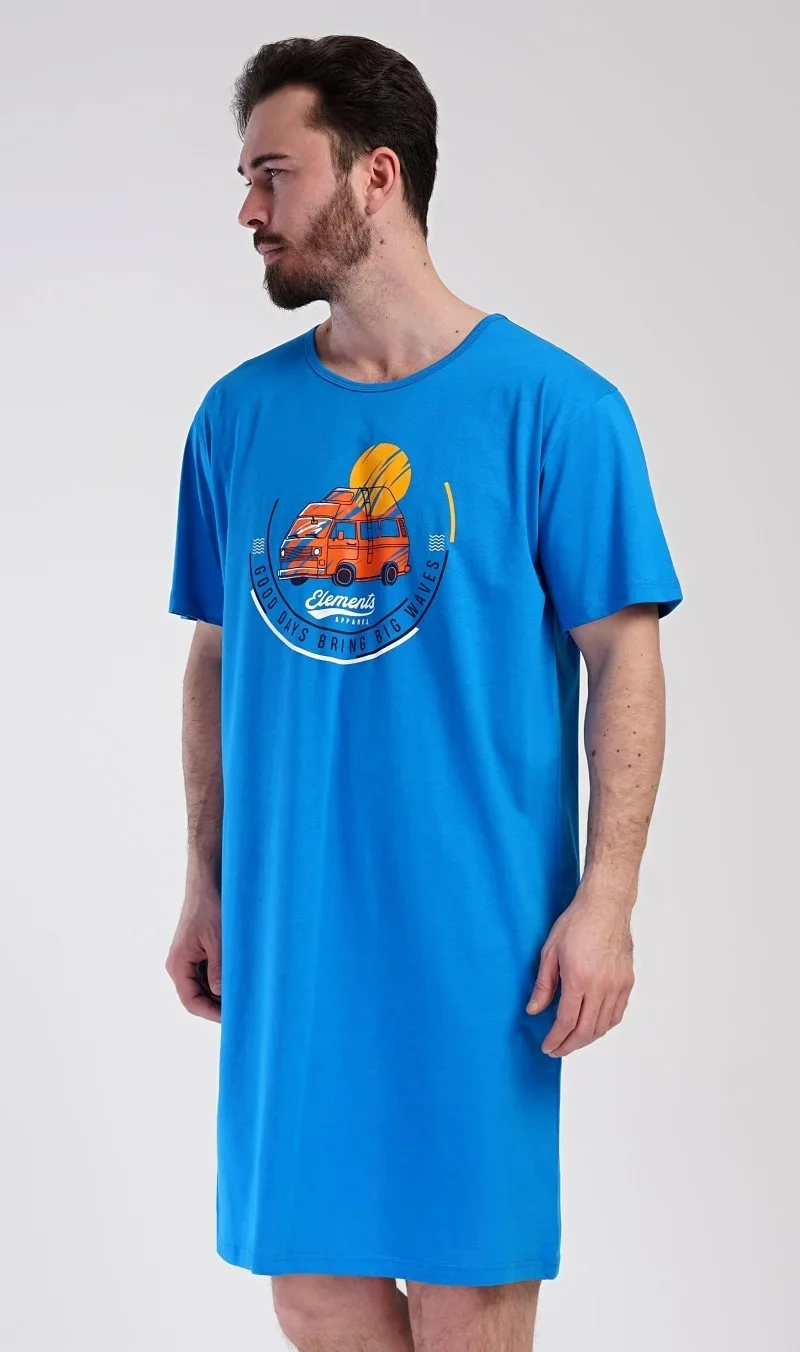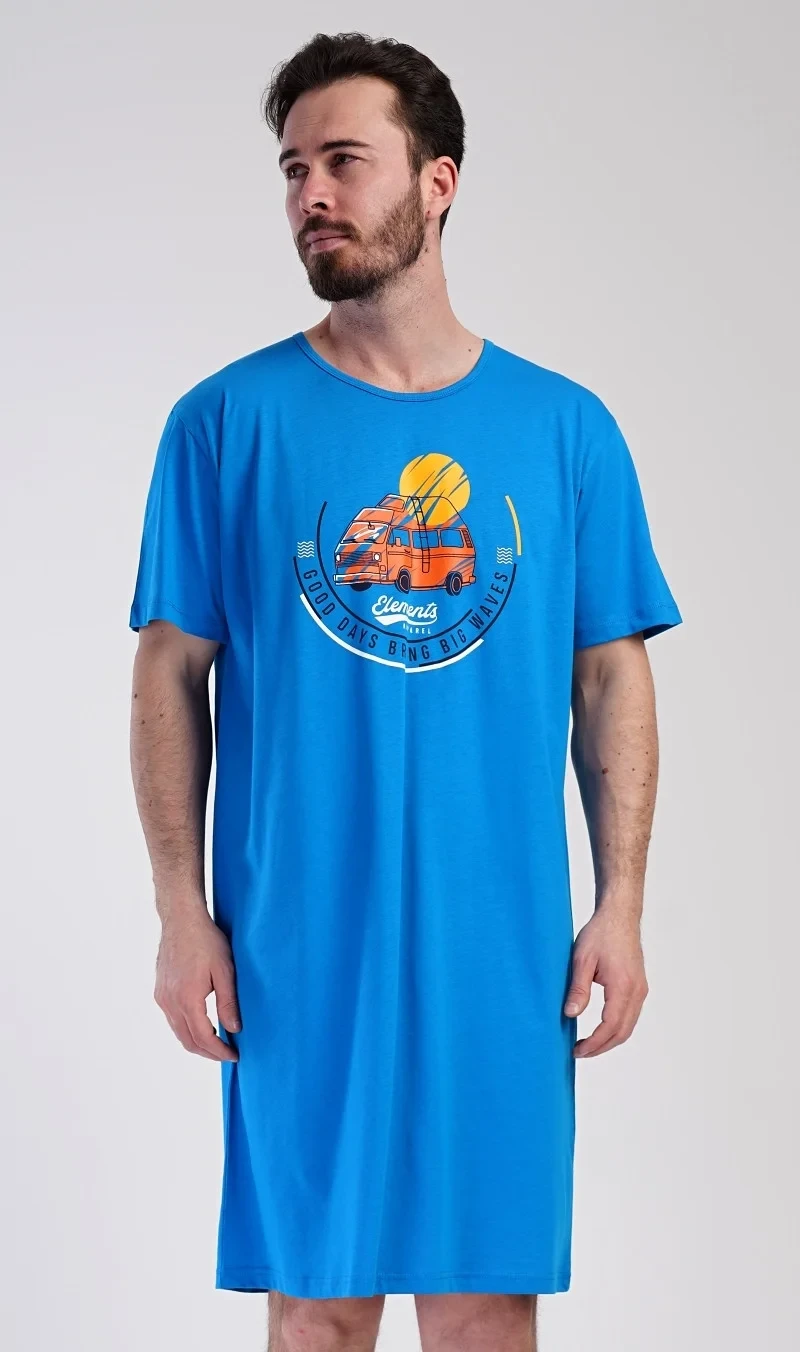 Pánská bavlněná noční košile s krátkým rukávem Adventure. Jednobarevná pánská noční košile s kulatým výstřihem a délkou po kolena má na hrudi obrázek obytného vozu a nápis 'Good days bring big waves'. Noční košile je vhodným dárkem pro všechny milovníky cestování. Použitý materiál s obsahem bavlny 100% je příjemný a poddajný na dotek.