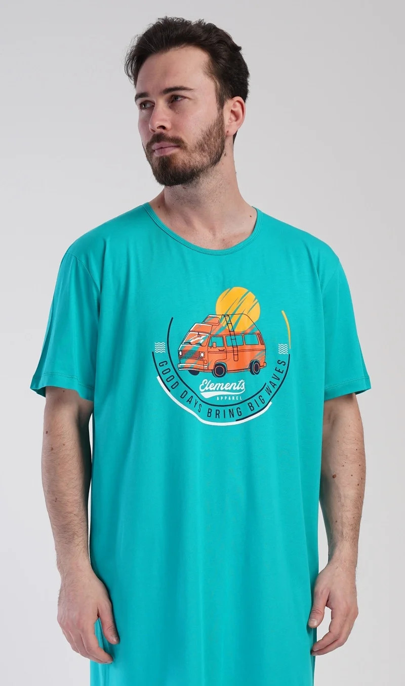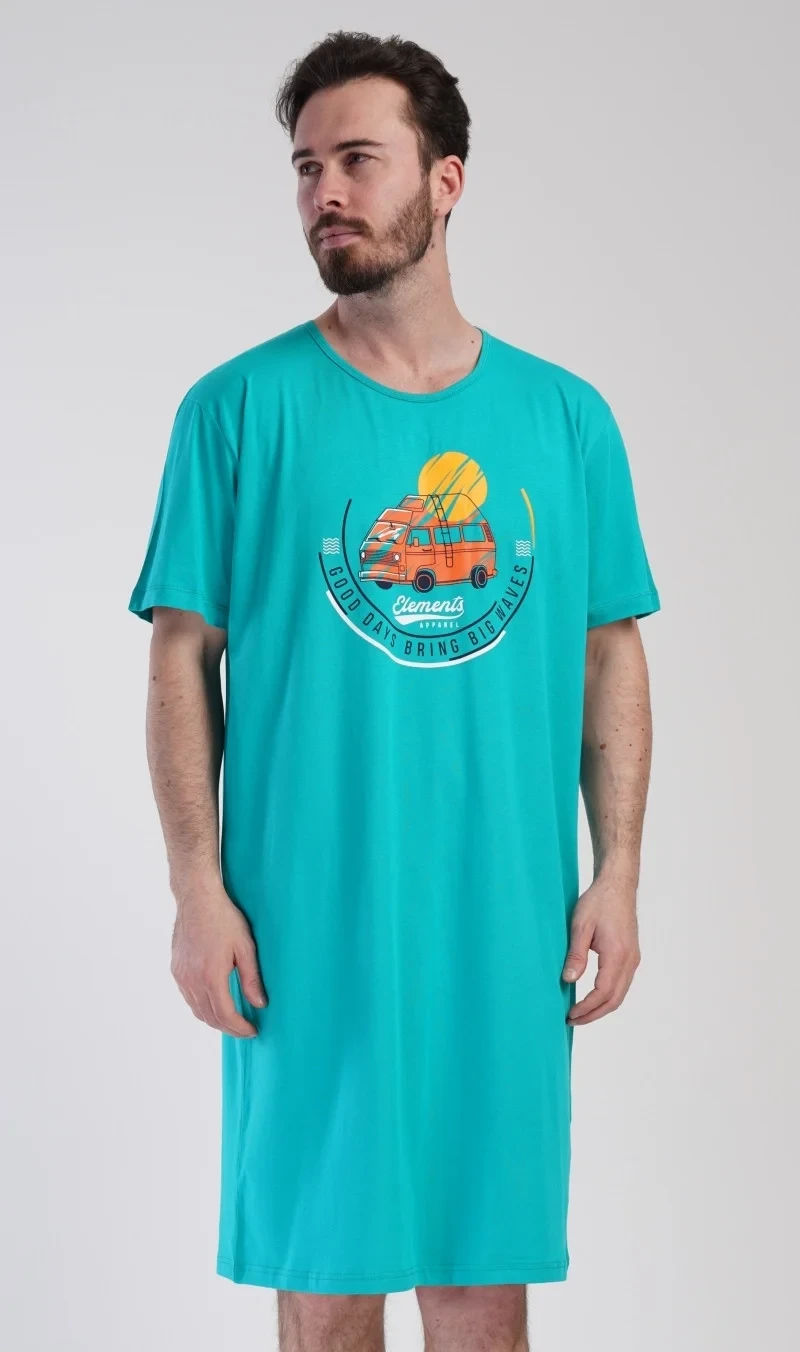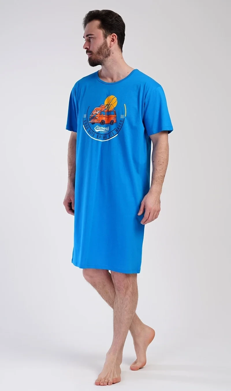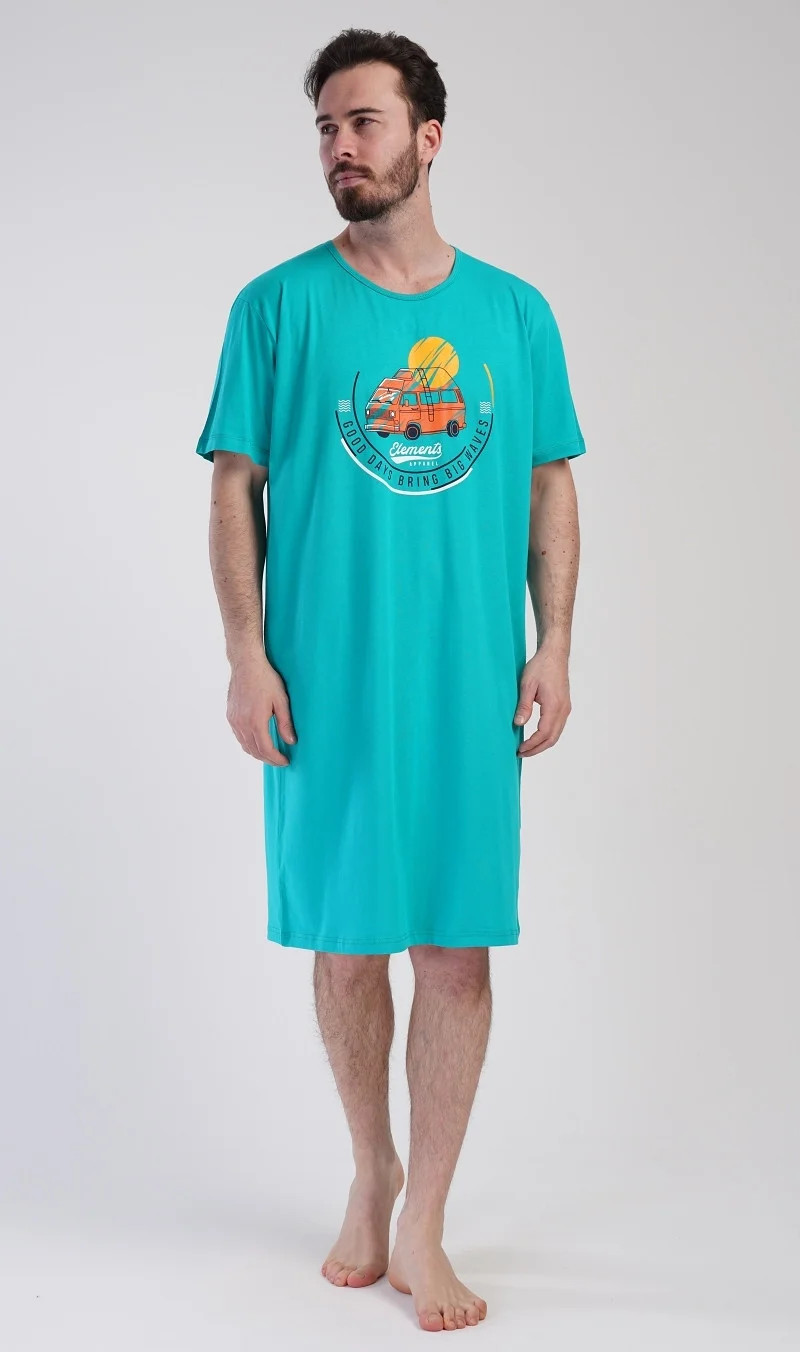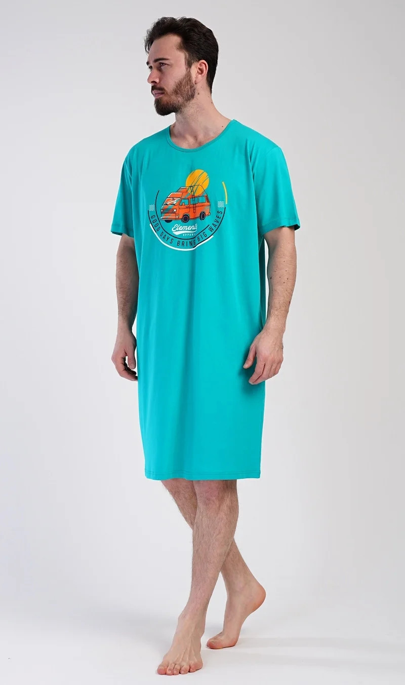 Pánská bavlněná noční košile s krátkým rukávem Adventure. Jednobarevná pánská noční košile s kulatým výstřihem a délkou po kolena má na hrudi obrázek obytného vozu a nápis 'Good days bring big waves'. Noční košile je vhodným dárkem pro všechny milovníky cestování. Použitý materiál s obsahem bavlny 100% je příjemný a poddajný na dotek.