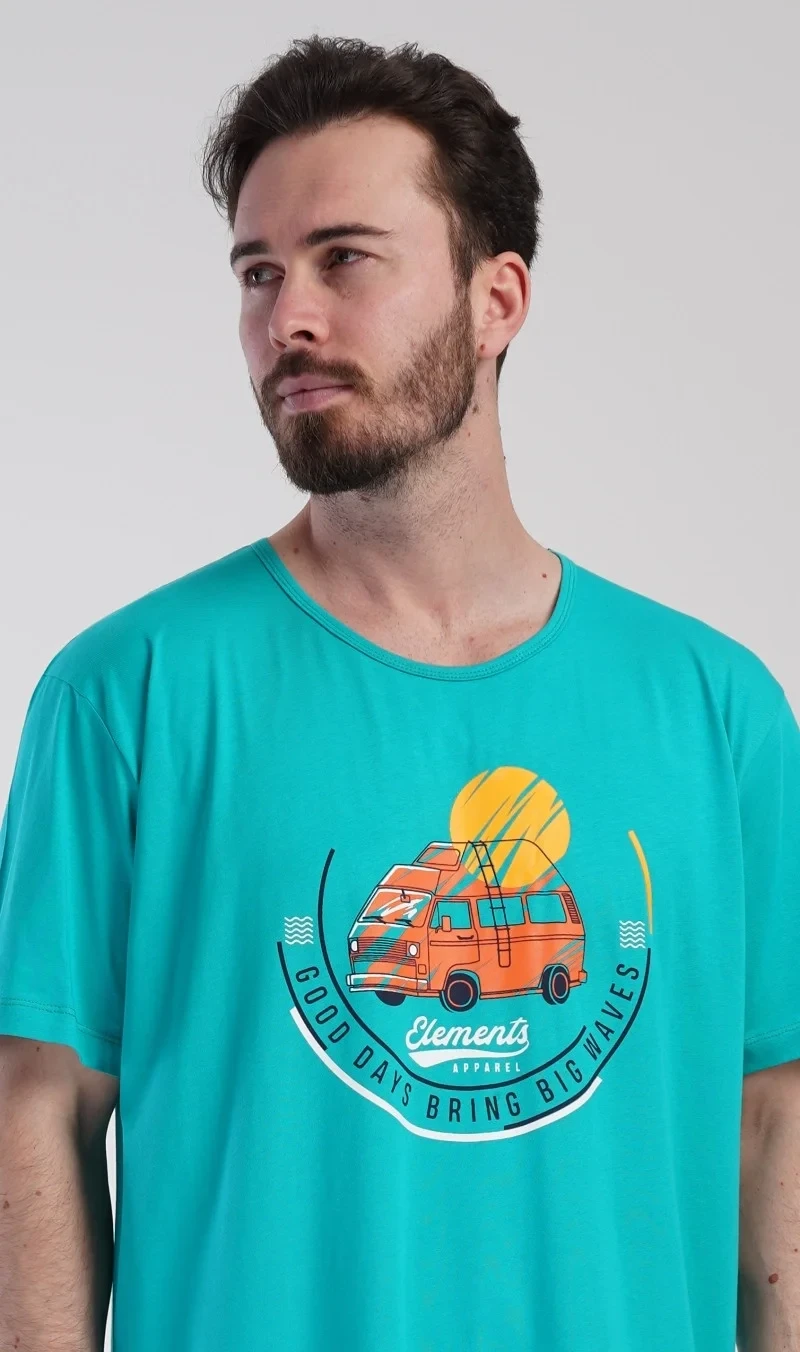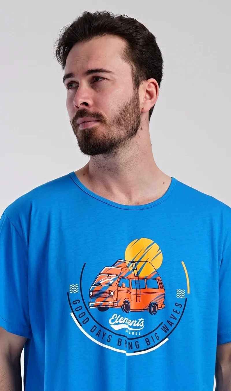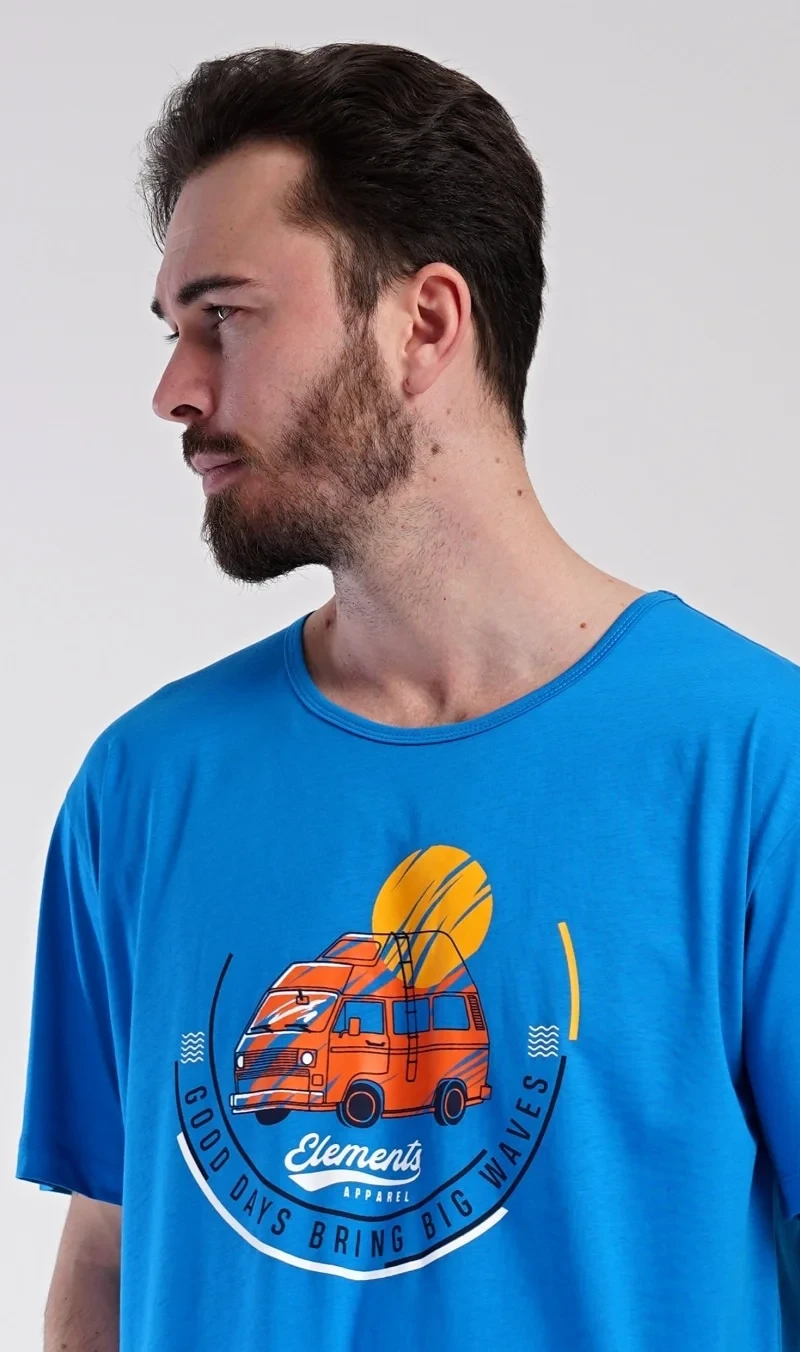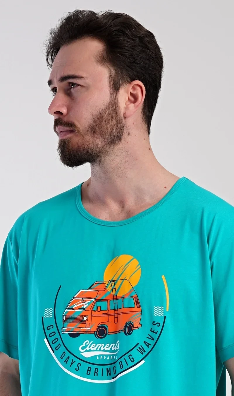 Pánská bavlněná noční košile s krátkým rukávem Adventure. Jednobarevná pánská noční košile s kulatým výstřihem a délkou po kolena má na hrudi obrázek obytného vozu a nápis 'Good days bring big waves'. Noční košile je vhodným dárkem pro všechny milovníky cestování. Použitý materiál s obsahem bavlny 100% je příjemný a poddajný na dotek.
