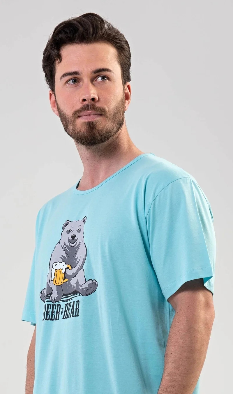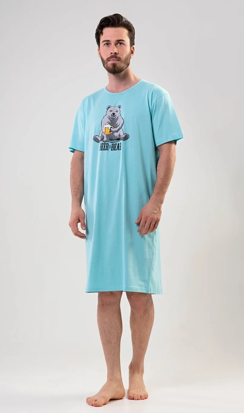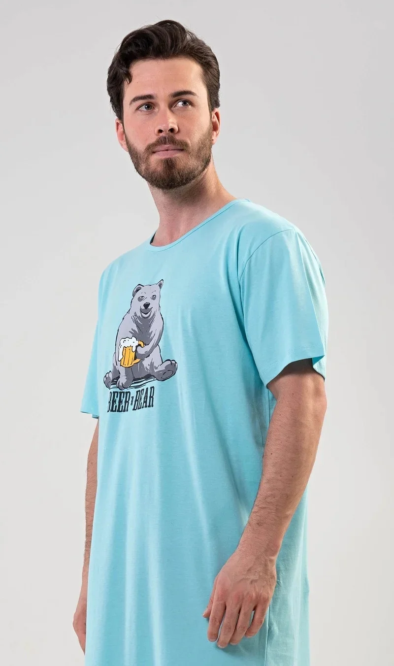 Pánská noční košile s krátkým rukávem Beer and bear. Pánská noční košile má na hrudi obrázek medvěda s pivem. Je určena pro všechny milovníky pohodlí a piva. Použitý materiál je jemný a poddajný na dotek. Obsah bavlny je 100%.