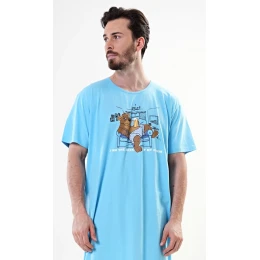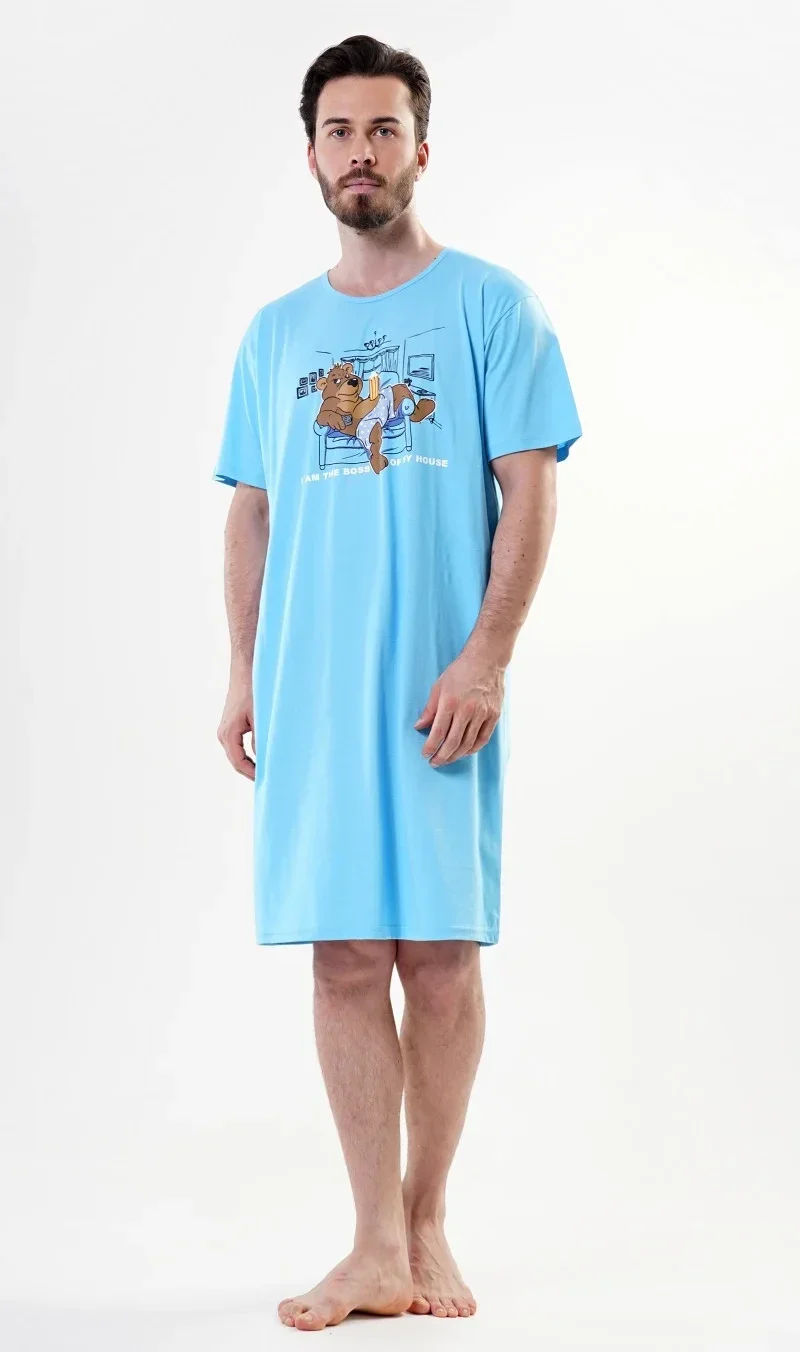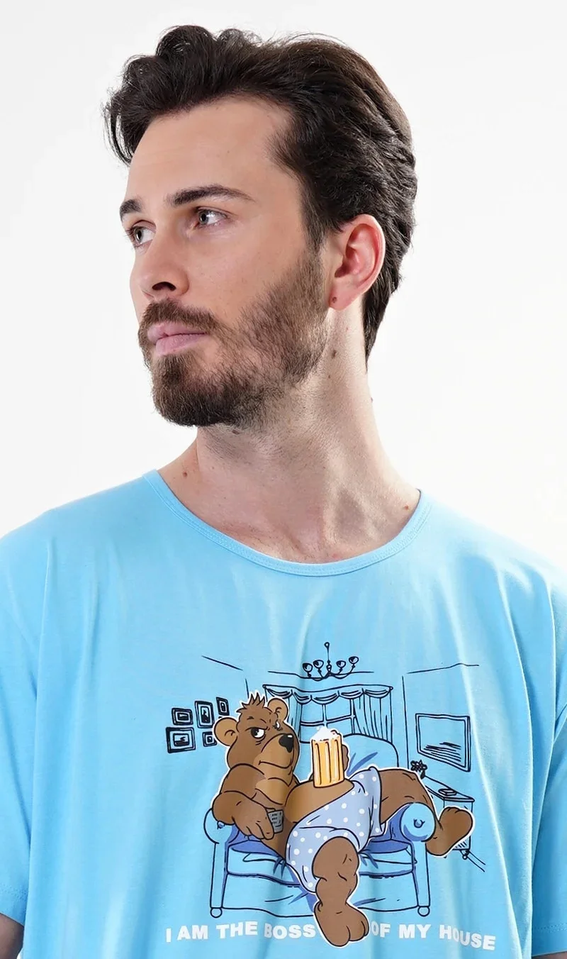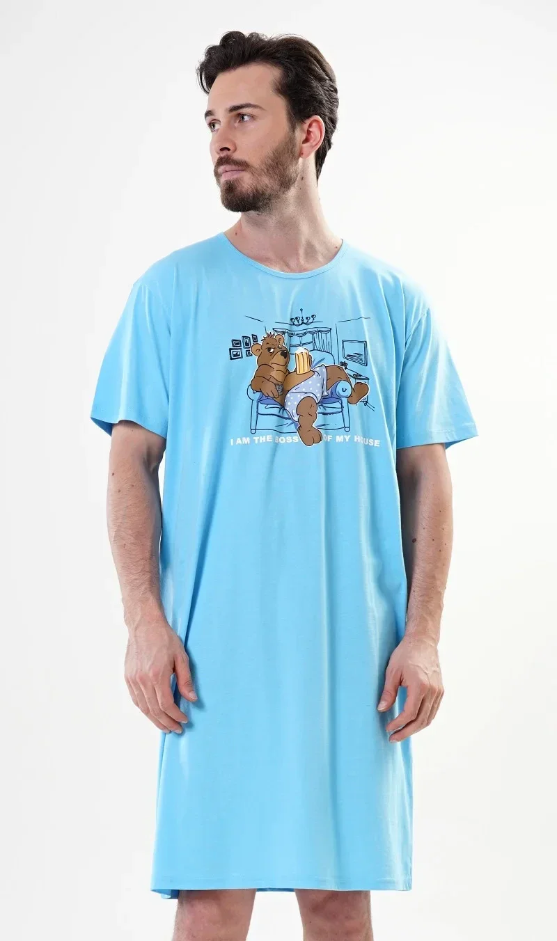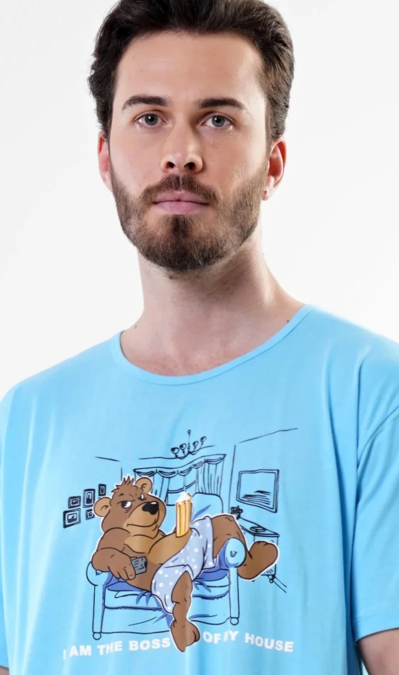Pánská bavlněná noční košile s krátkým rukávem Boss. Pánská noční košile pro všechny milovníky pohodlí má na hrudi obrázek impozantního medvěda sedícího v křesle s pivem v tlapě a nápisem 'Im the Boss of my house'. Použitý bavlněný materiál je příjemný a poddajný na dotek.