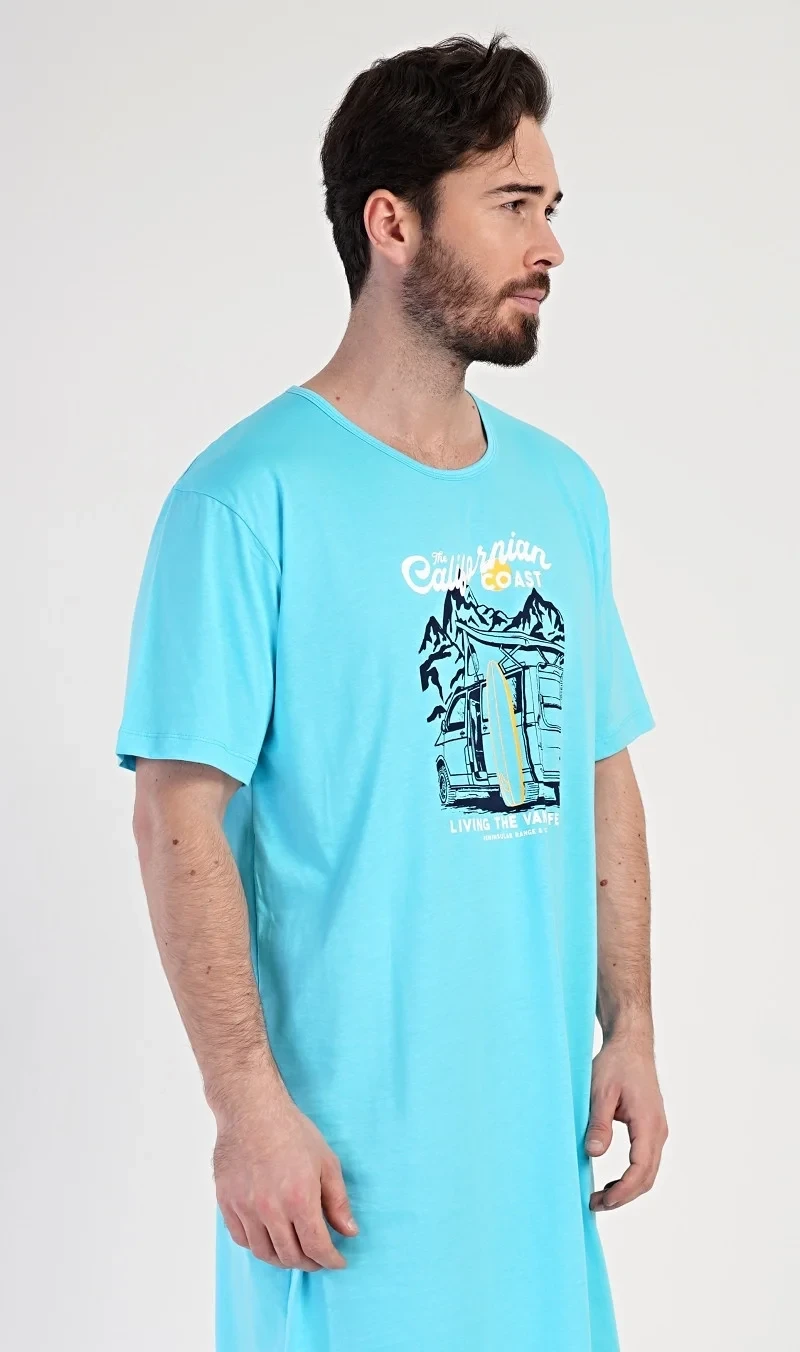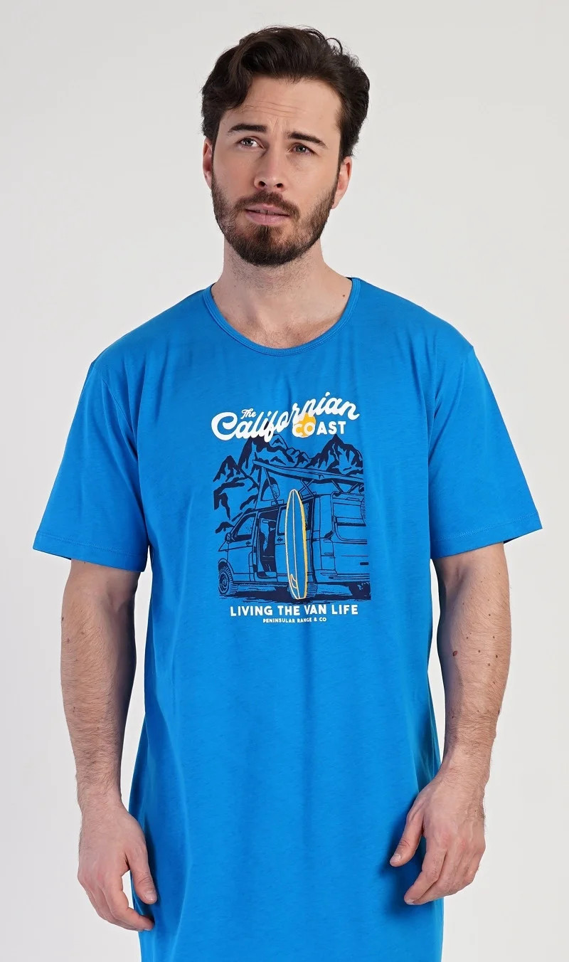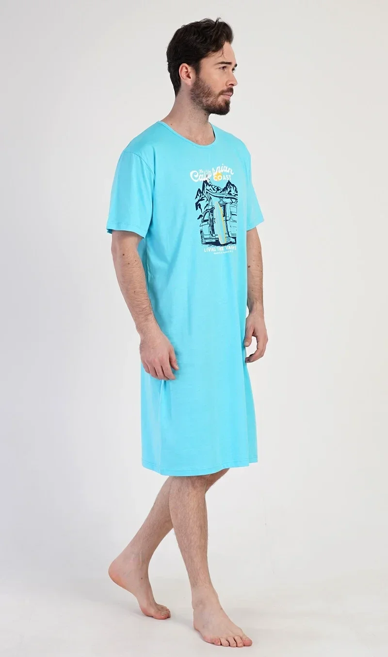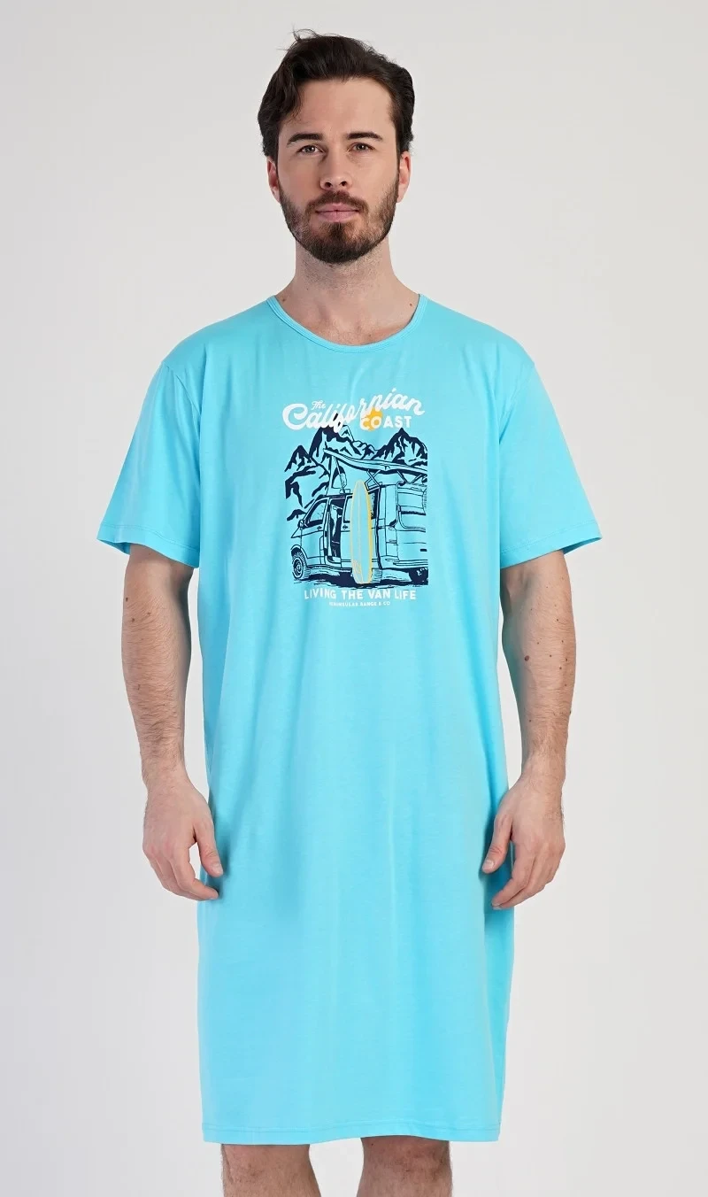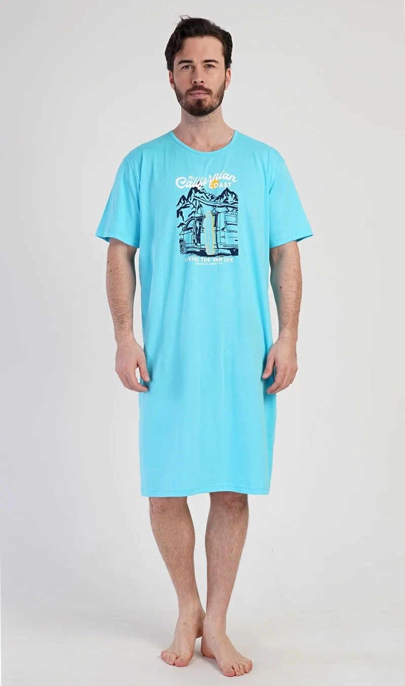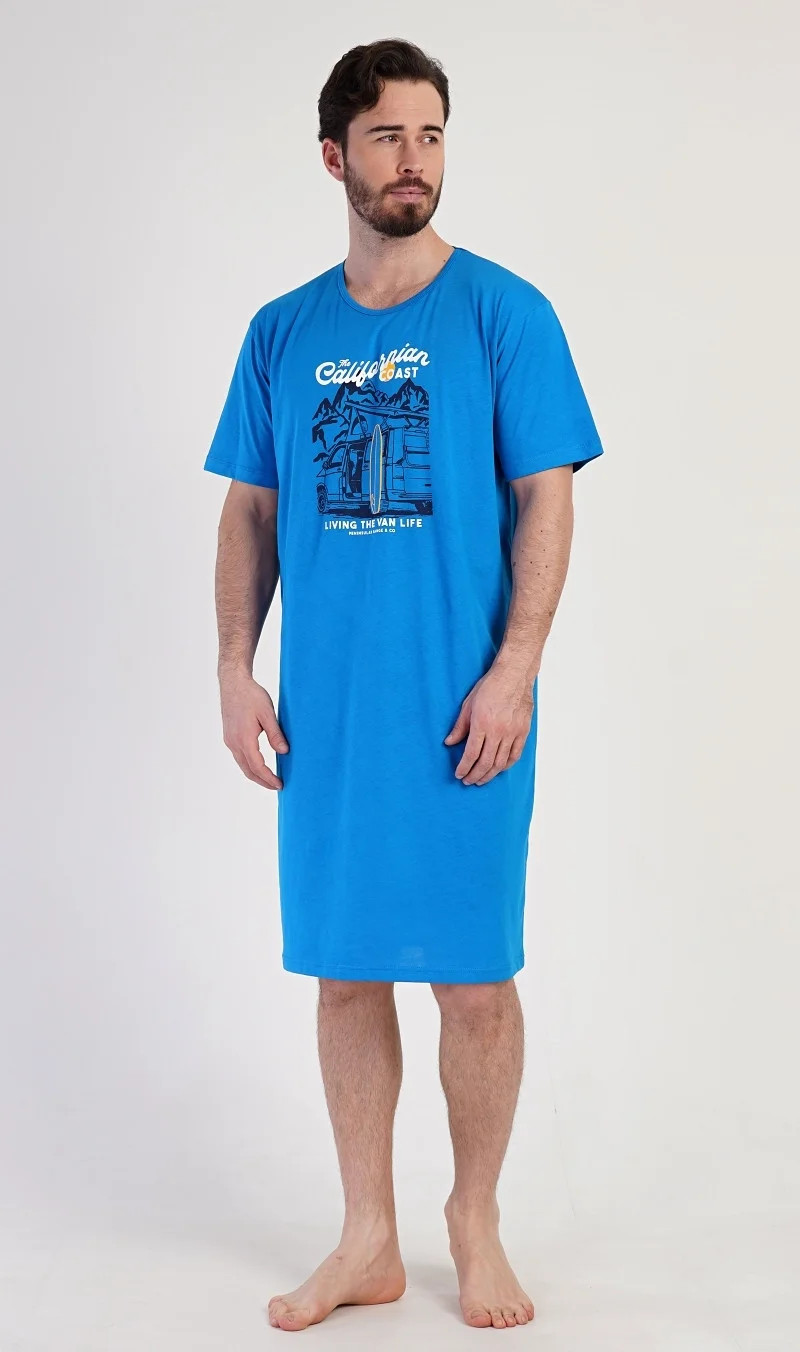 Pánská bavlněná noční košile s krátkým rukávem California. Jednobarevná pánská noční košile s kulatým výstřihem má na hrudi obrázek obytného auta se surfařským prknem a nápis 'California'. Tato košile je vhodným dárkem pro všechny milovníky moře a exotiky. Použitý materiál je příjemný a poddajný na dotek. Obsah bavlny je 100%.
