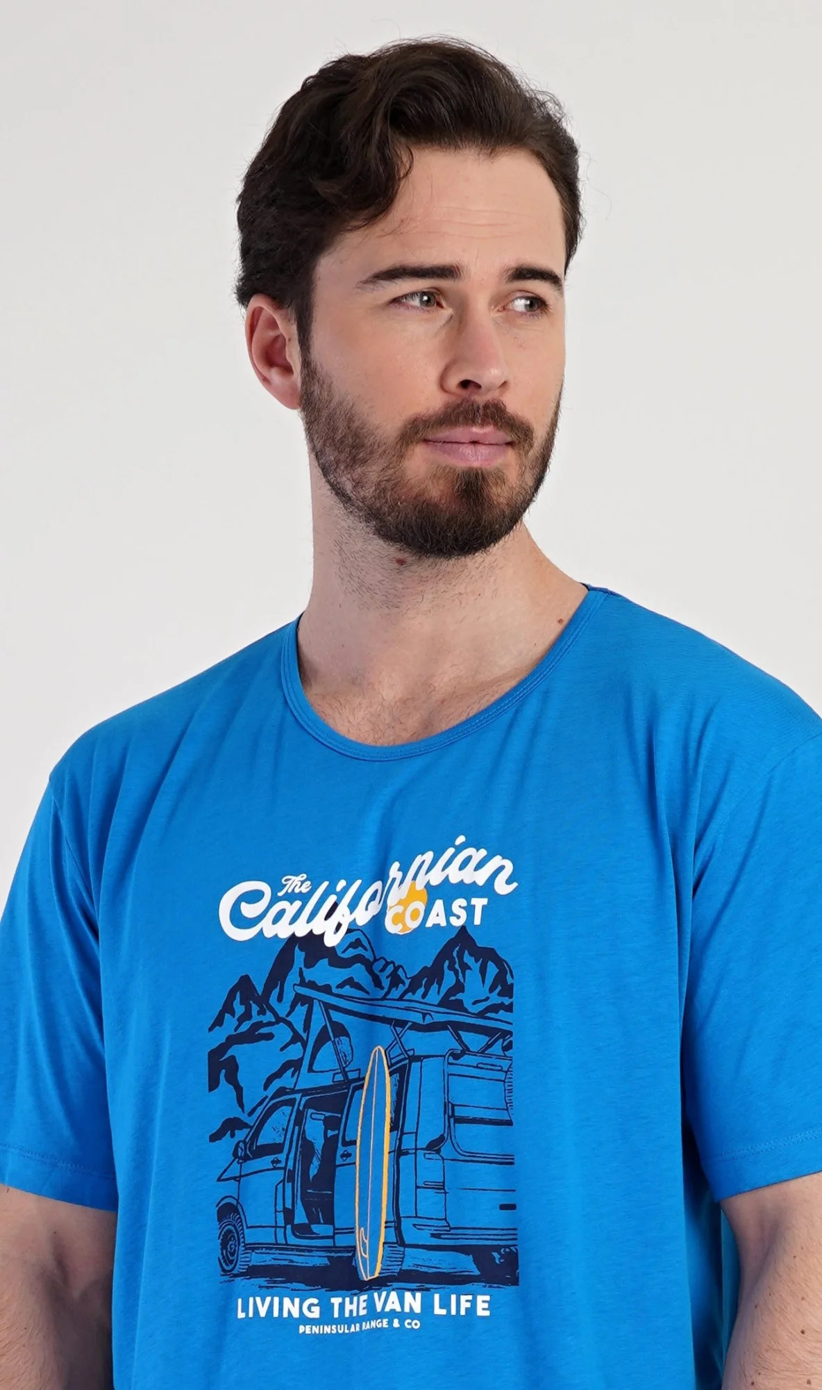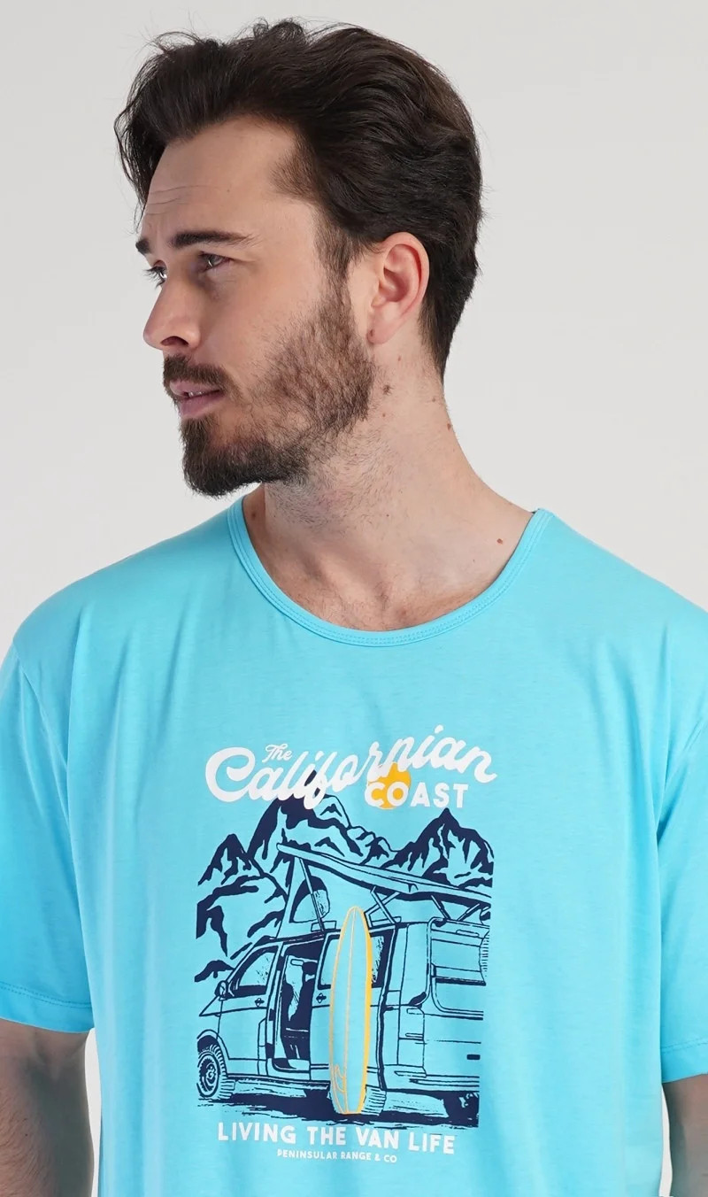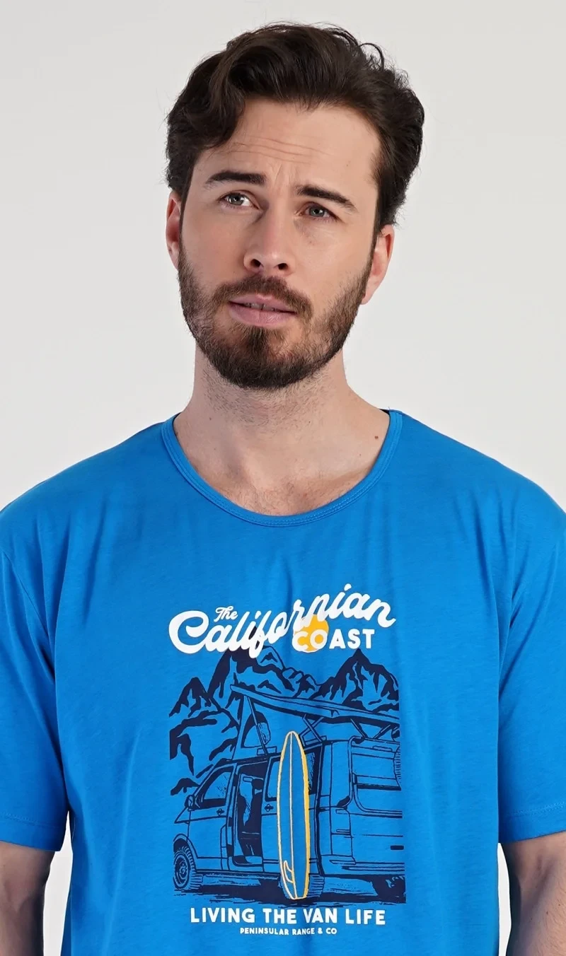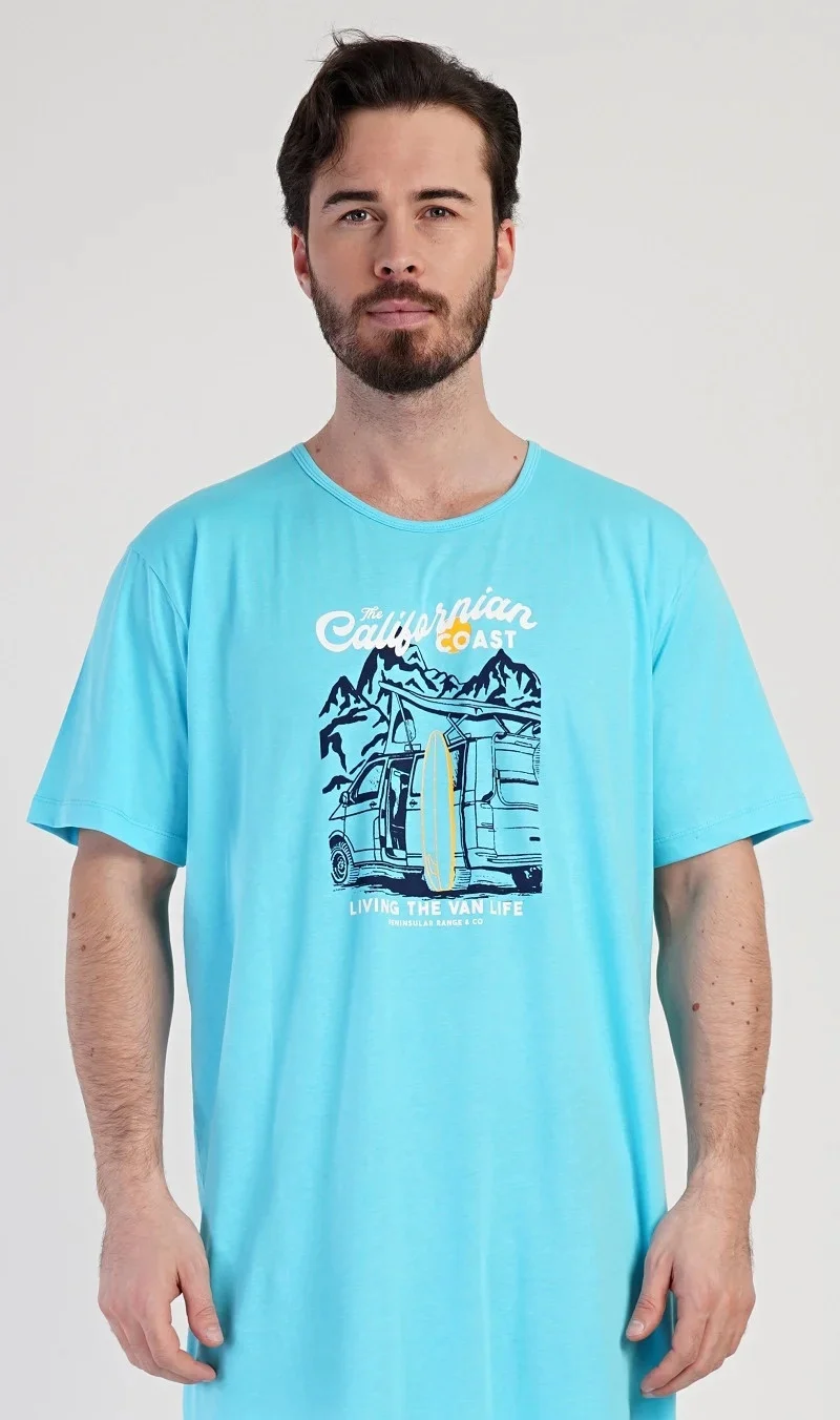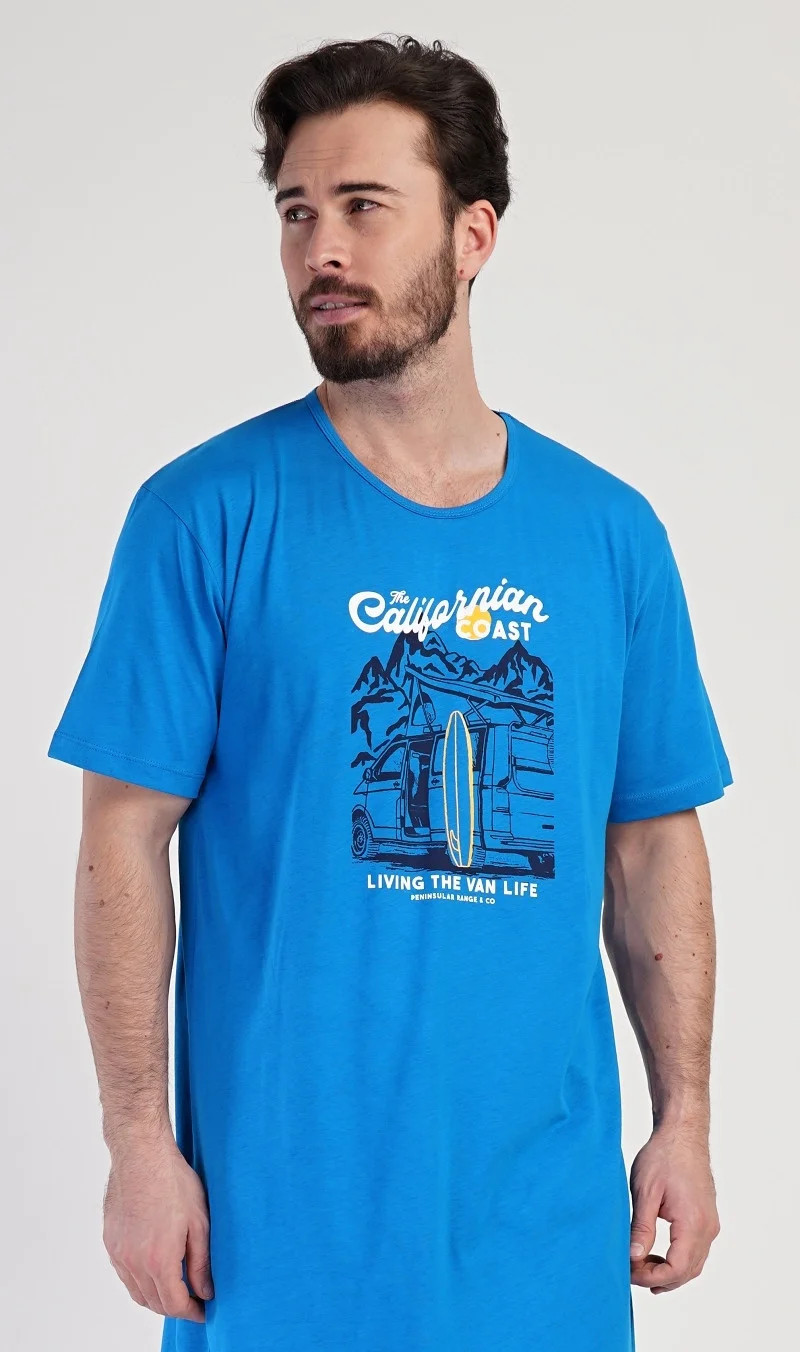 Pánská bavlněná noční košile s krátkým rukávem California. Jednobarevná pánská noční košile s kulatým výstřihem má na hrudi obrázek obytného auta se surfařským prknem a nápis 'California'. Tato košile je vhodným dárkem pro všechny milovníky moře a exotiky. Použitý materiál je příjemný a poddajný na dotek. Obsah bavlny je 100%.