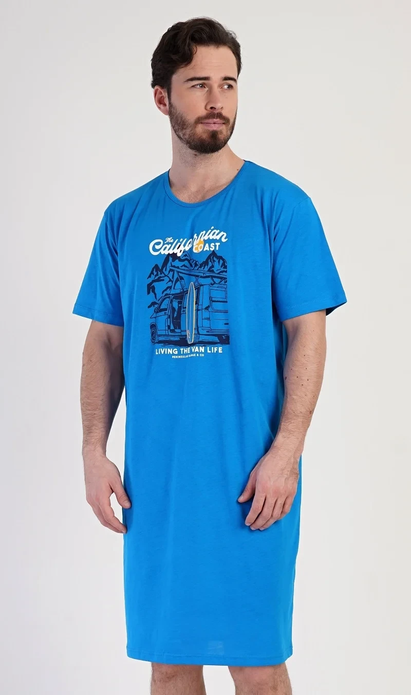 Pánská bavlněná noční košile s krátkým rukávem California. Jednobarevná pánská noční košile s kulatým výstřihem má na hrudi obrázek obytného auta se surfařským prknem a nápis 'California'. Tato košile je vhodným dárkem pro všechny milovníky moře a exotiky. Použitý materiál je příjemný a poddajný na dotek. Obsah bavlny je 100%.
