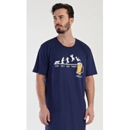 Pánská bavlněná noční košile s krátkým rukávem Filip. Jednobarevná pánská noční košile s kulatým výstřihem je zdobena veselým motivem. Obrázkem panáčků, kteří se s blížícím víkendem nemůžou dočkat sklenice piva. Použitý materiál je jemný a poddajný na dotek. Obsah bavlny je 100%.
