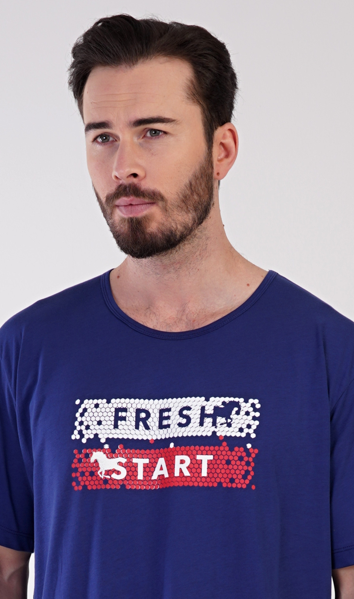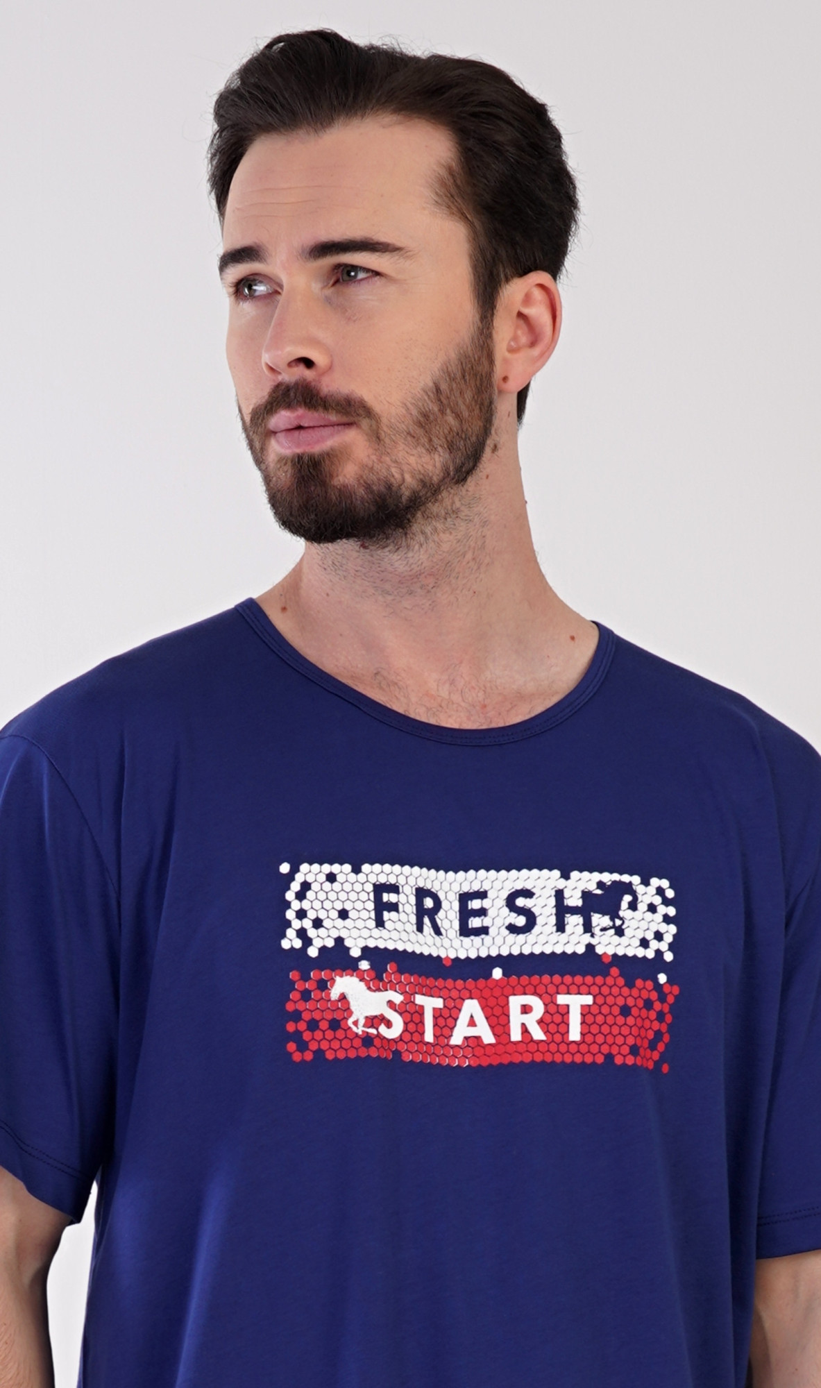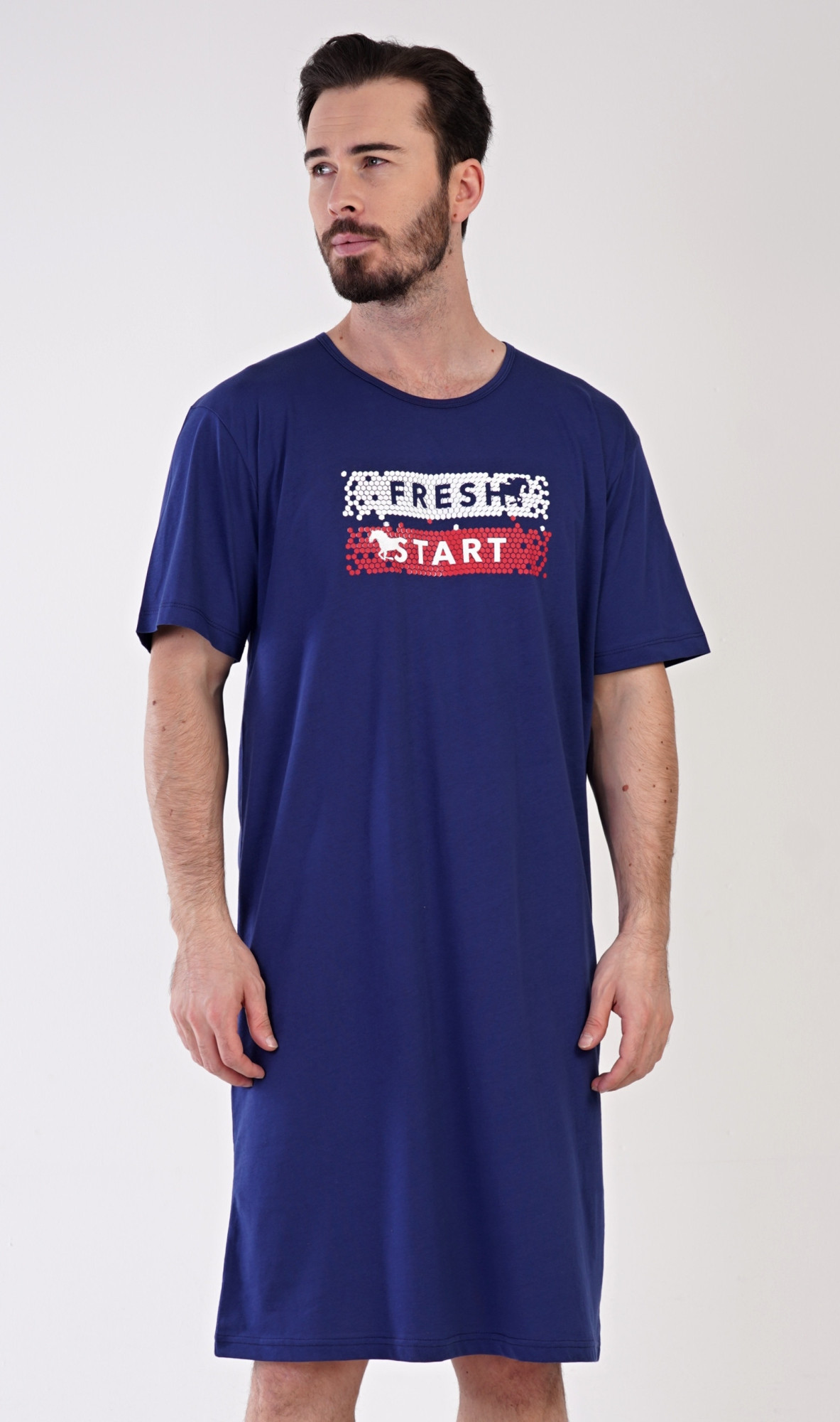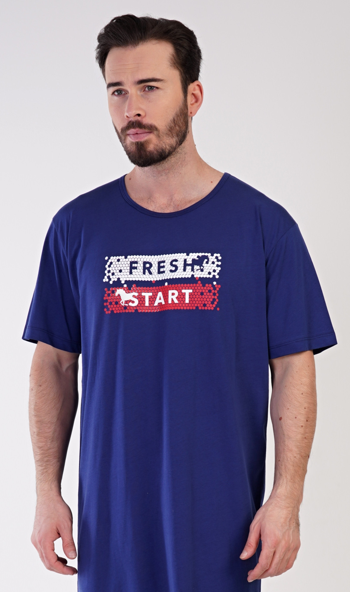 Pánská bavlněná noční košile s krátkým rukávem Fresh start. Jednobarevná pánská noční košile s kulatým výstřihem a délkou po kolena má na hrudi obrázek běžícího koně a nápis FRESH START. Noční košile je vhodným dárkem pro muže všech věkových kategorií. Použitý materiál s obsahem bavlny 100% je příjemný a poddajný na dotek.