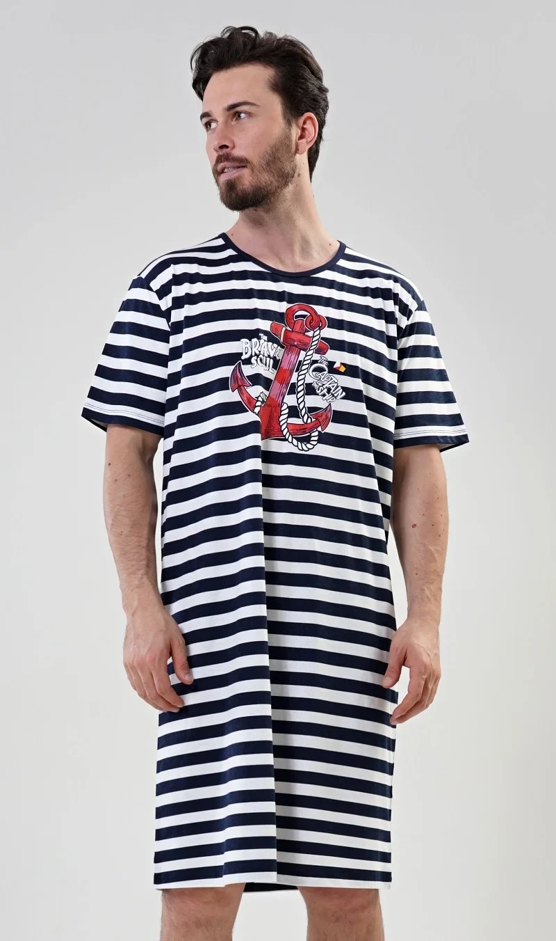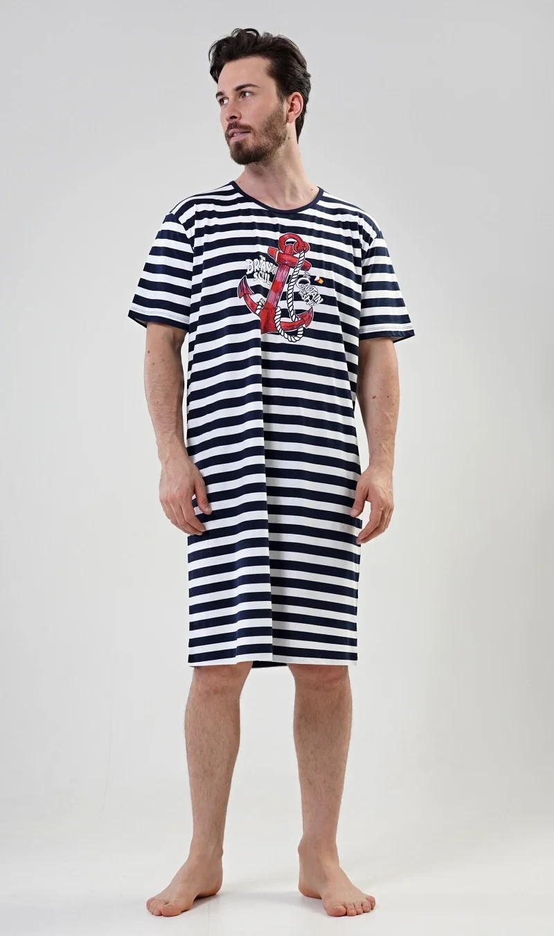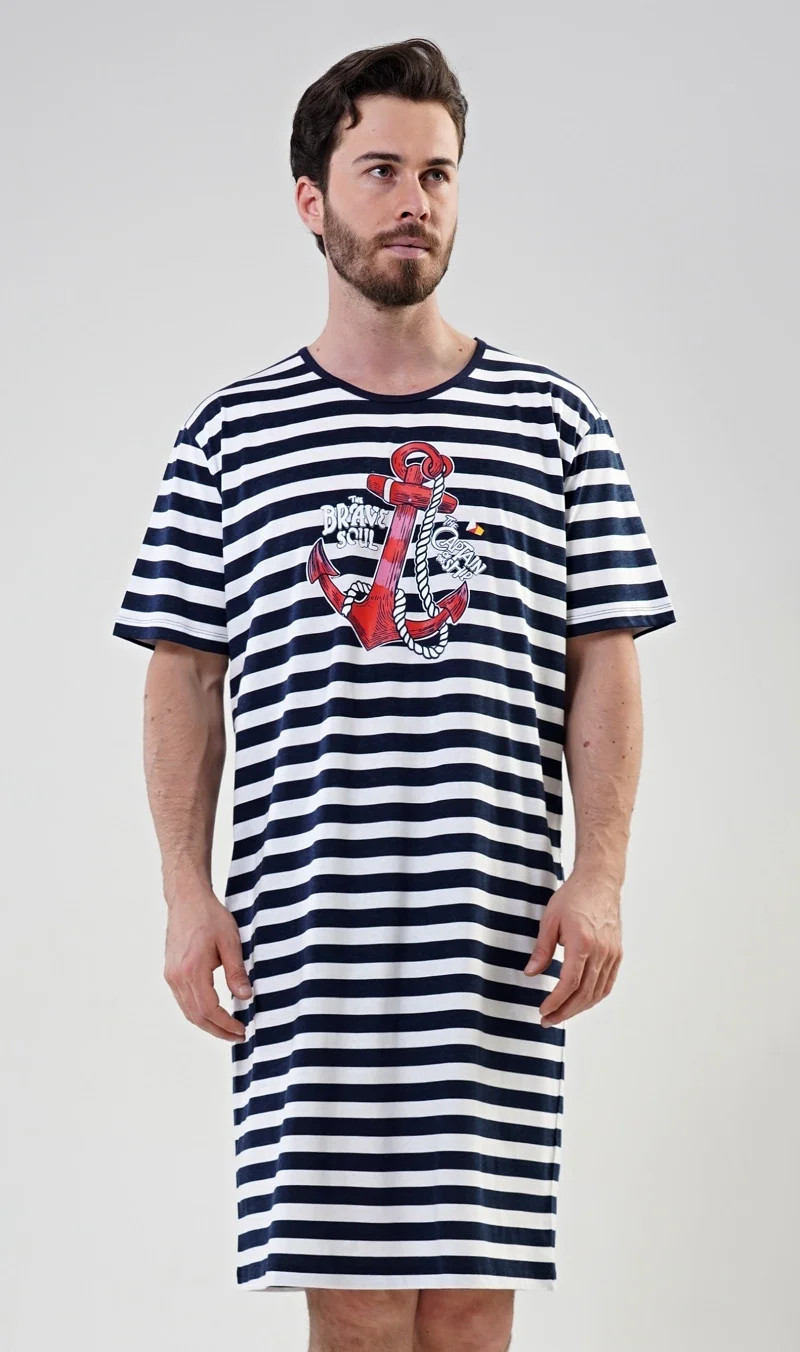 Pánská bavlněná noční košile s krátkým rukávem Kotva. Pánská noční košile pro všechny milovníky pohodlí má na pruhovaném podkladu výrazný obrázek kotvy. Použitý bavlněný materál je příjemný a poddajný na dotek.