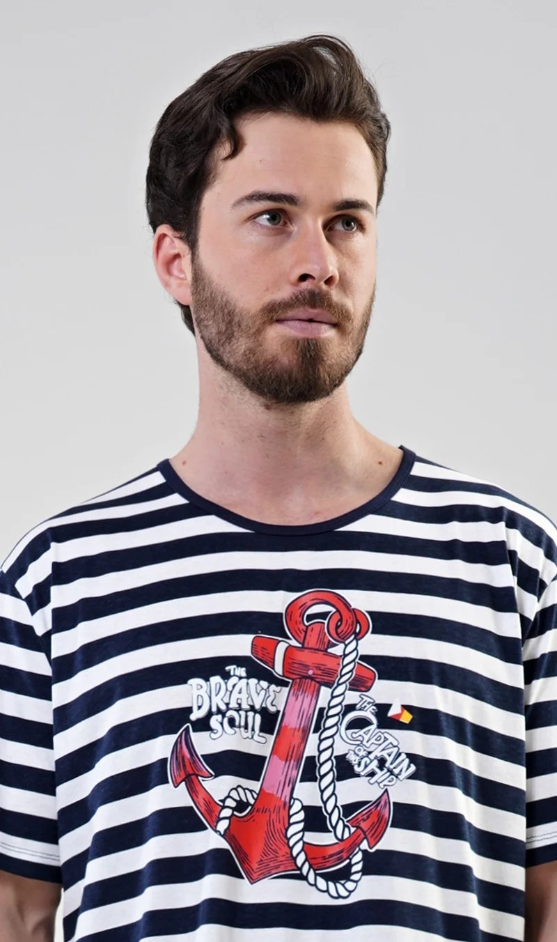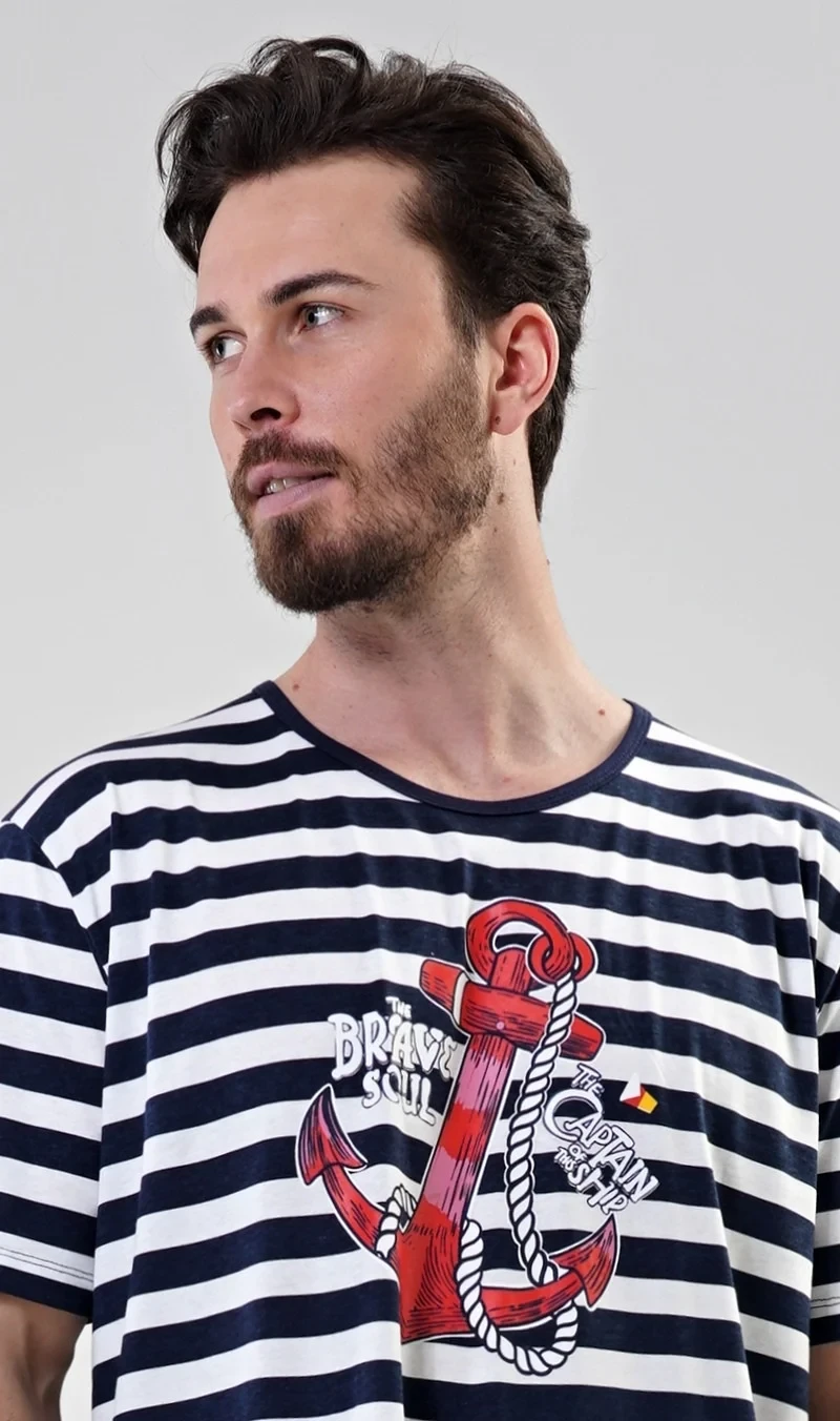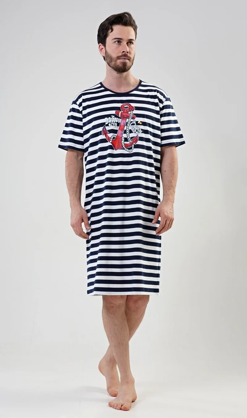Pánská bavlněná noční košile s krátkým rukávem Kotva. Pánská noční košile pro všechny milovníky pohodlí má na pruhovaném podkladu výrazný obrázek kotvy. Použitý bavlněný materál je příjemný a poddajný na dotek.