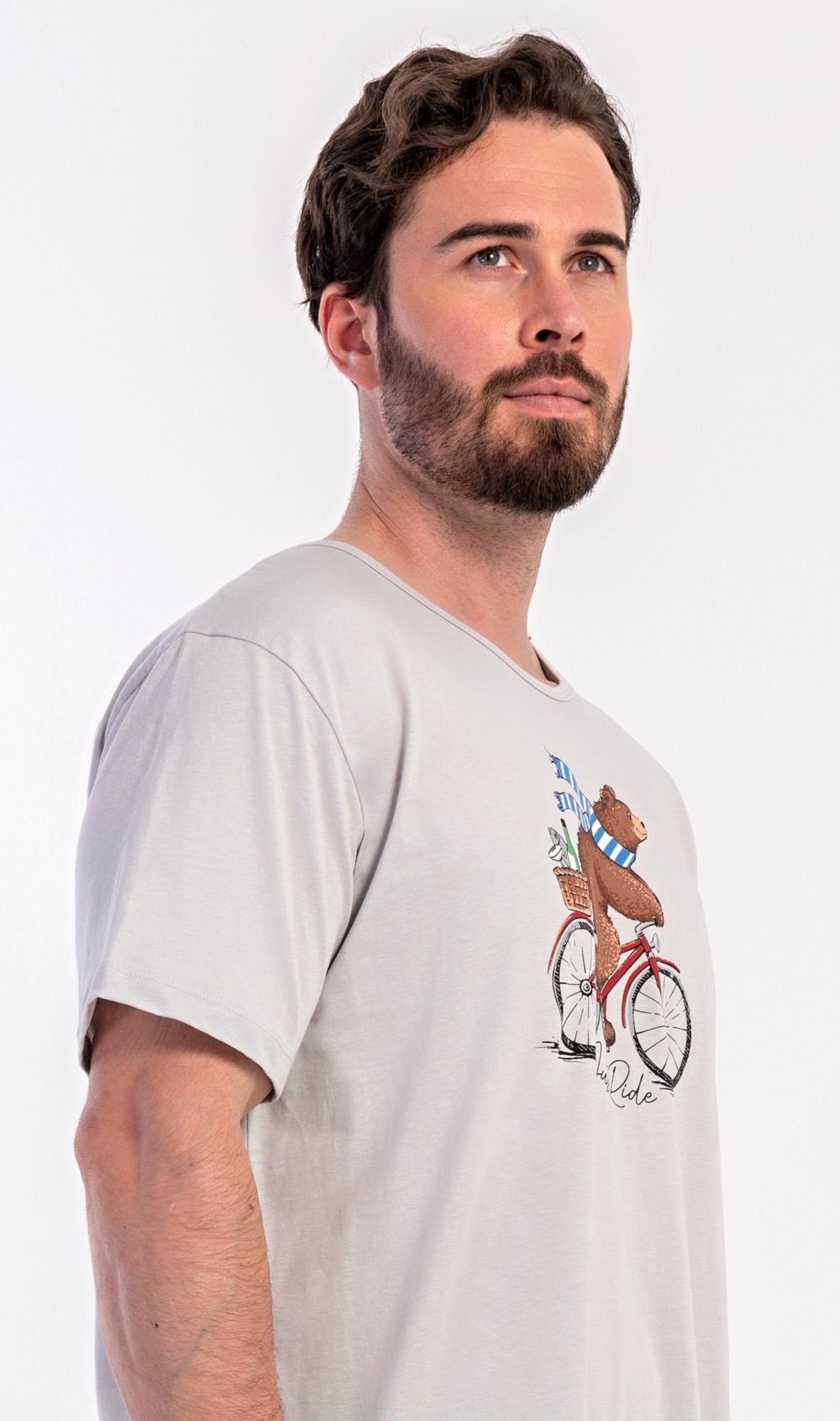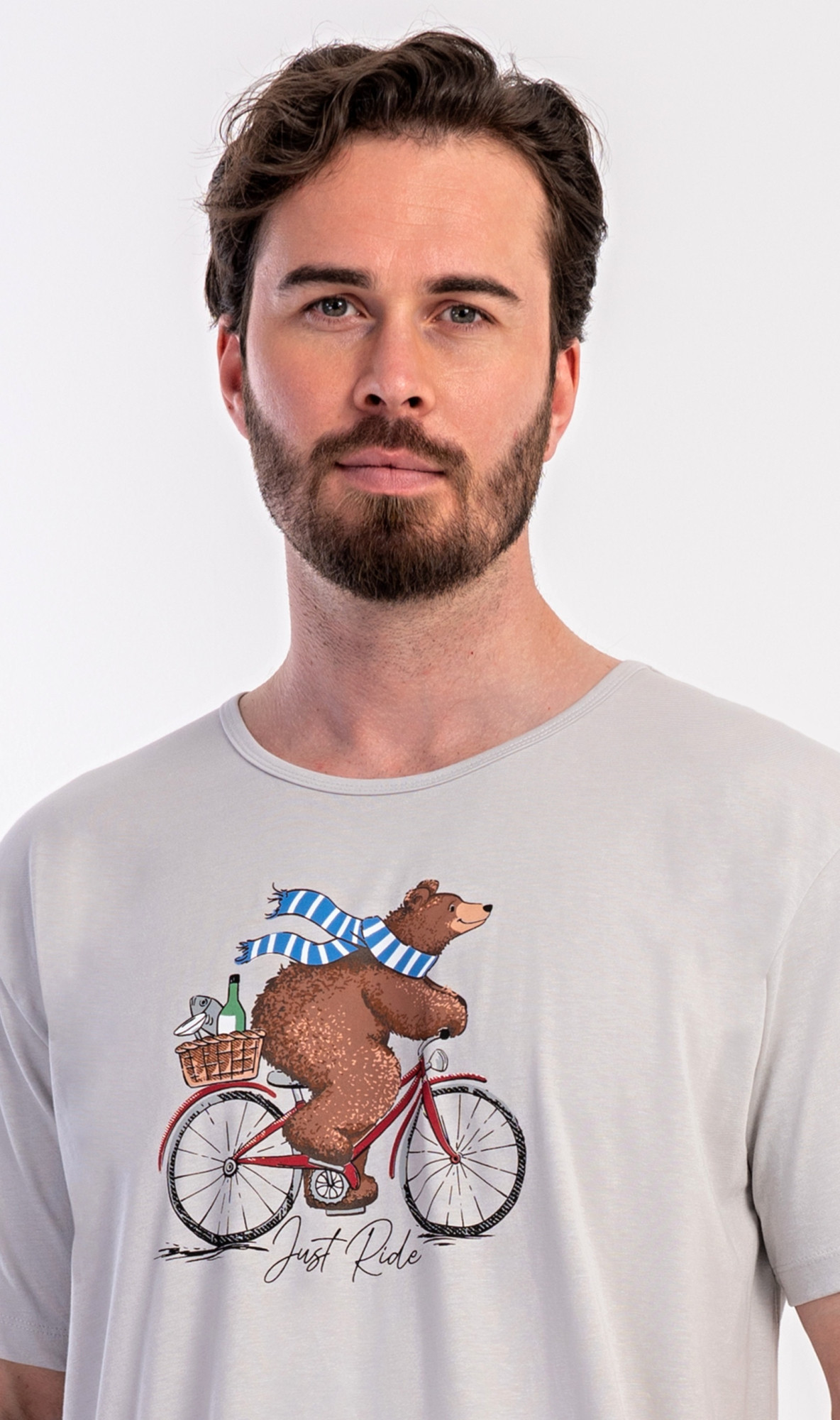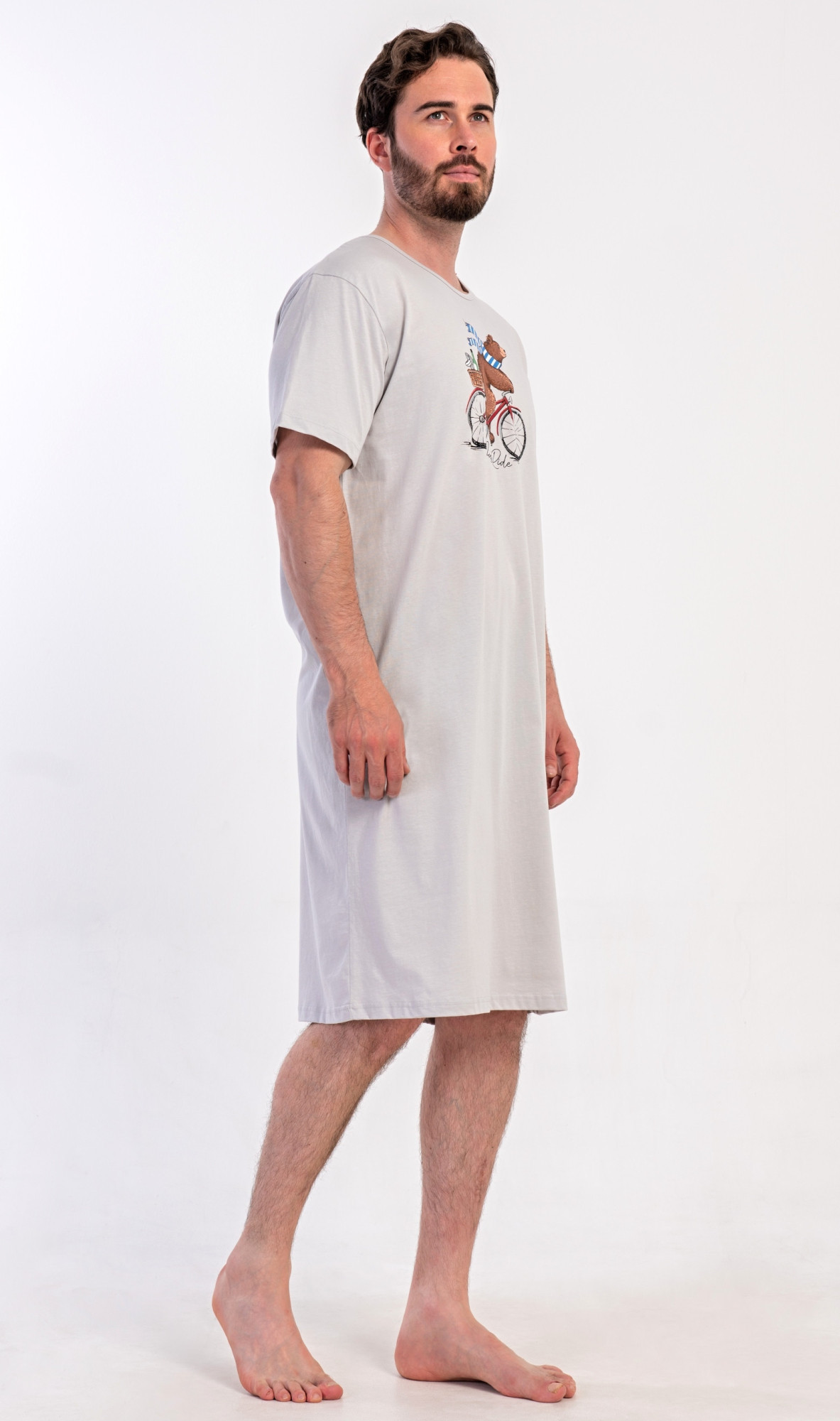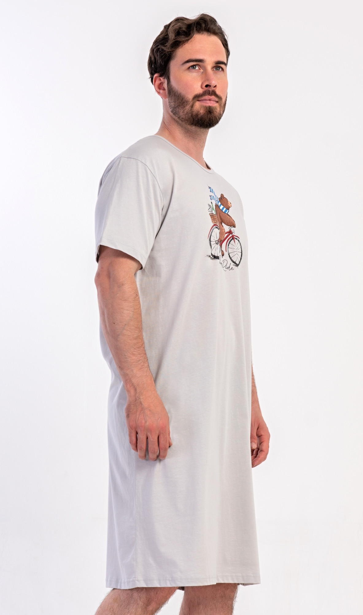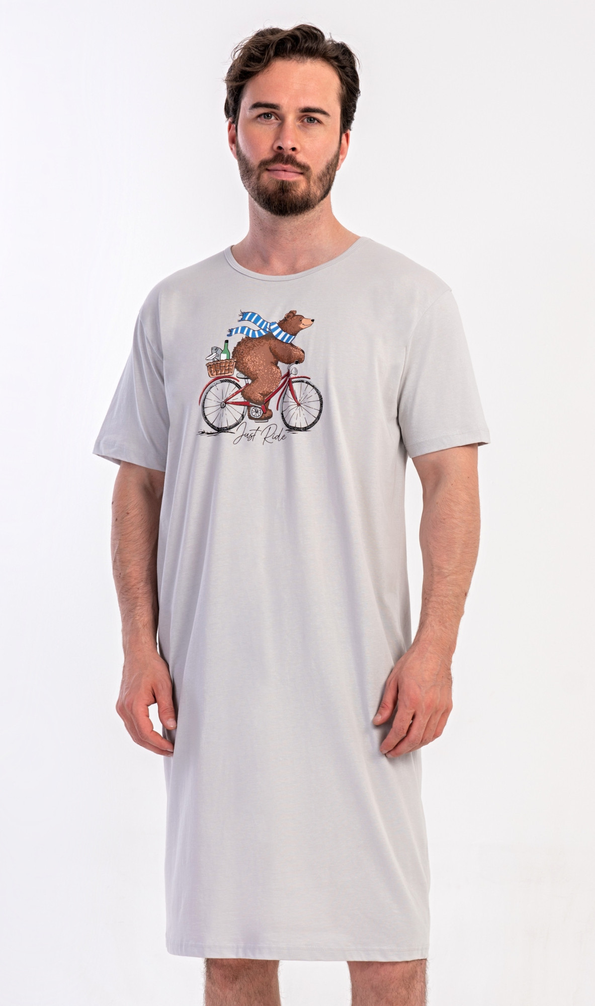Pánská bavlněná noční košile s krátkým rukávem Méďa na kole. Jednobarevná pánská noční košile s kulatým výstřihem a délkou po kolena má na hrudi obrázek medvěda na kole a nápis 'Just ride'. Použitý materiál s obsahem bavlny 100% je příjemný a poddajný na dotek.