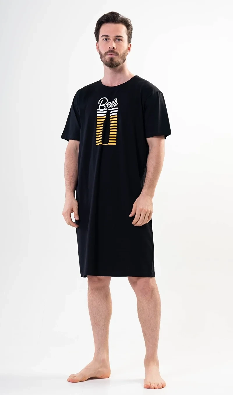 Pánská noční košile s krátkým rukávem Beer. Pánská noční košile má na hrudi zajímavý obrázek pivní flašky. Použitý materiál je jemný a poddajný na dotek. Košile je vhodná na denní nošení.