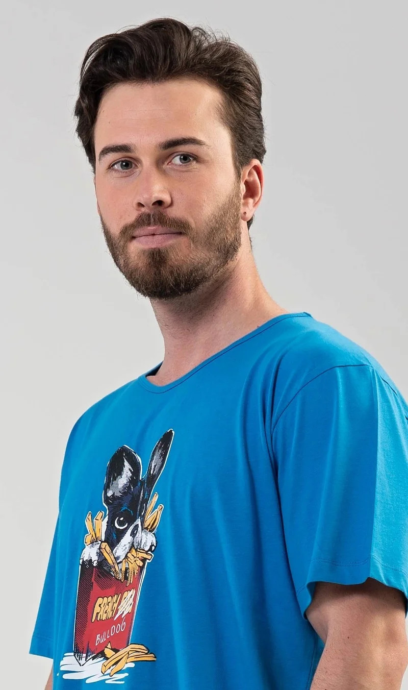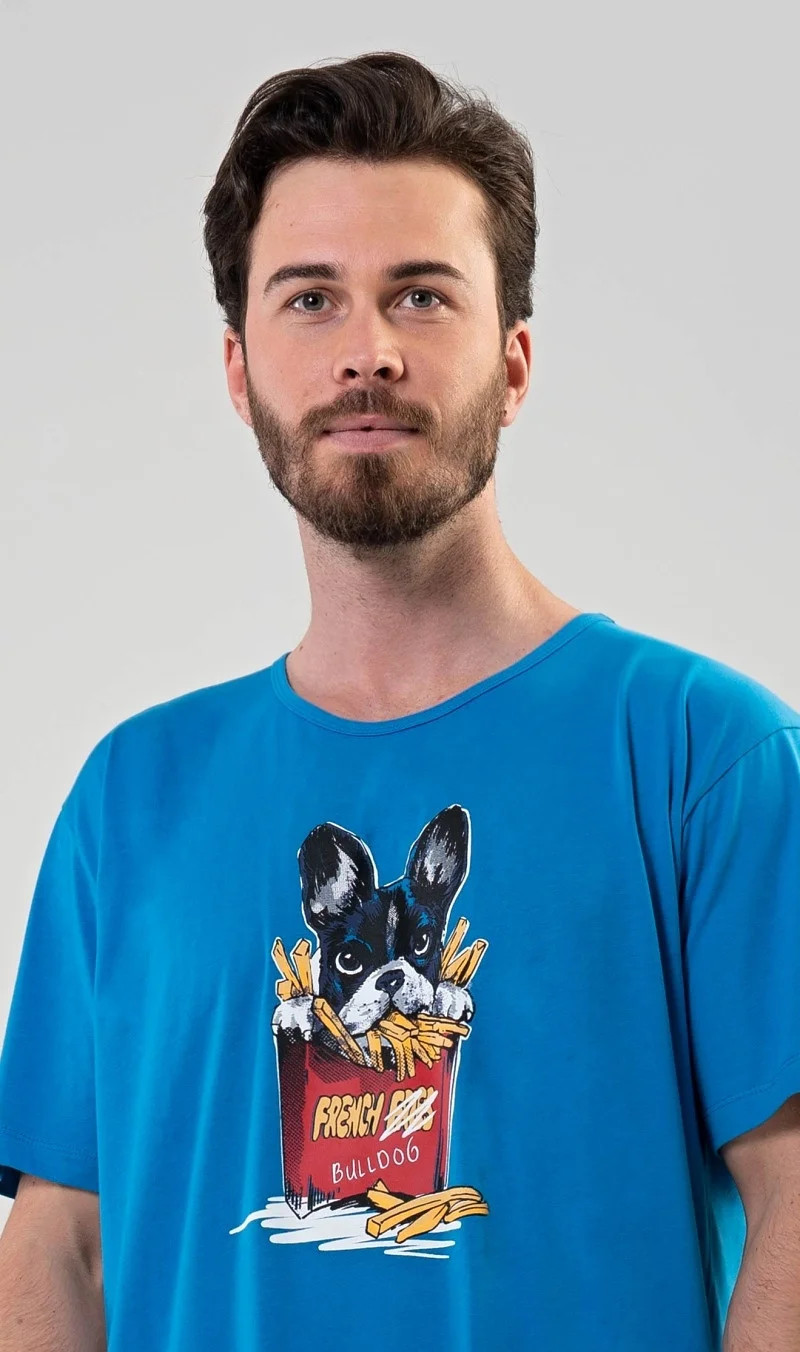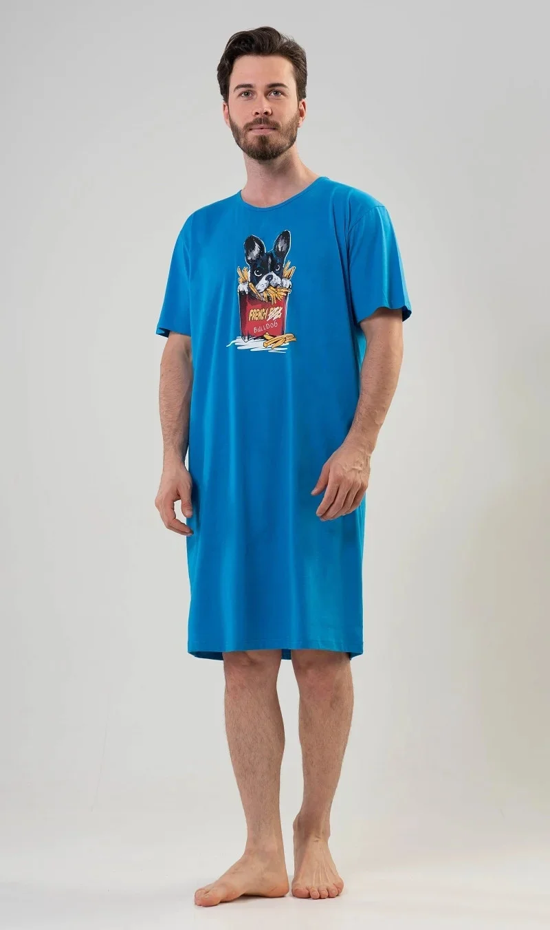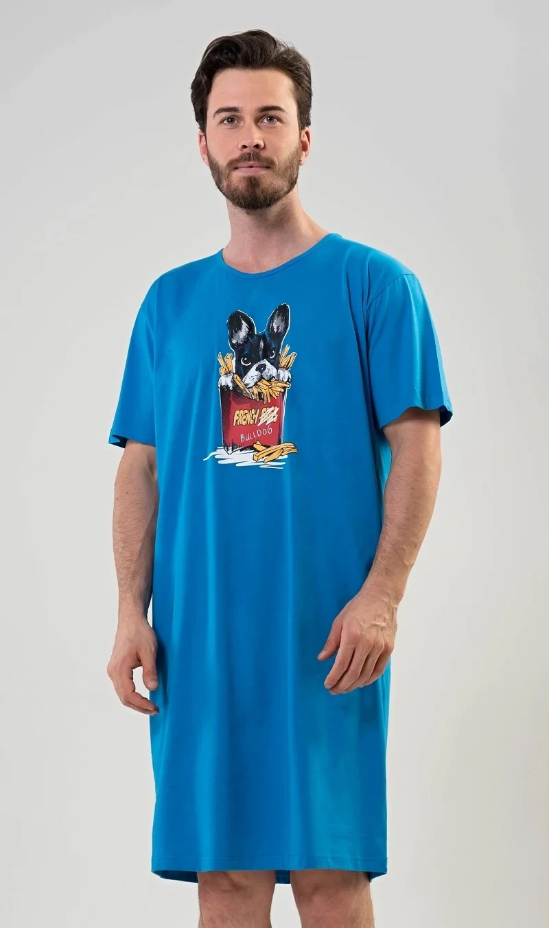 Pánská noční košile s krátkým rukávem Bulldog. Pánská noční košile s obrázkem Bulldoga v hranolkách. Použitý materiál je jemný a poddajný na dotek. Košile je vhodná na denní nošení.
