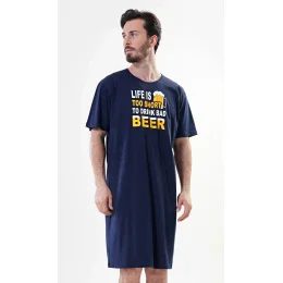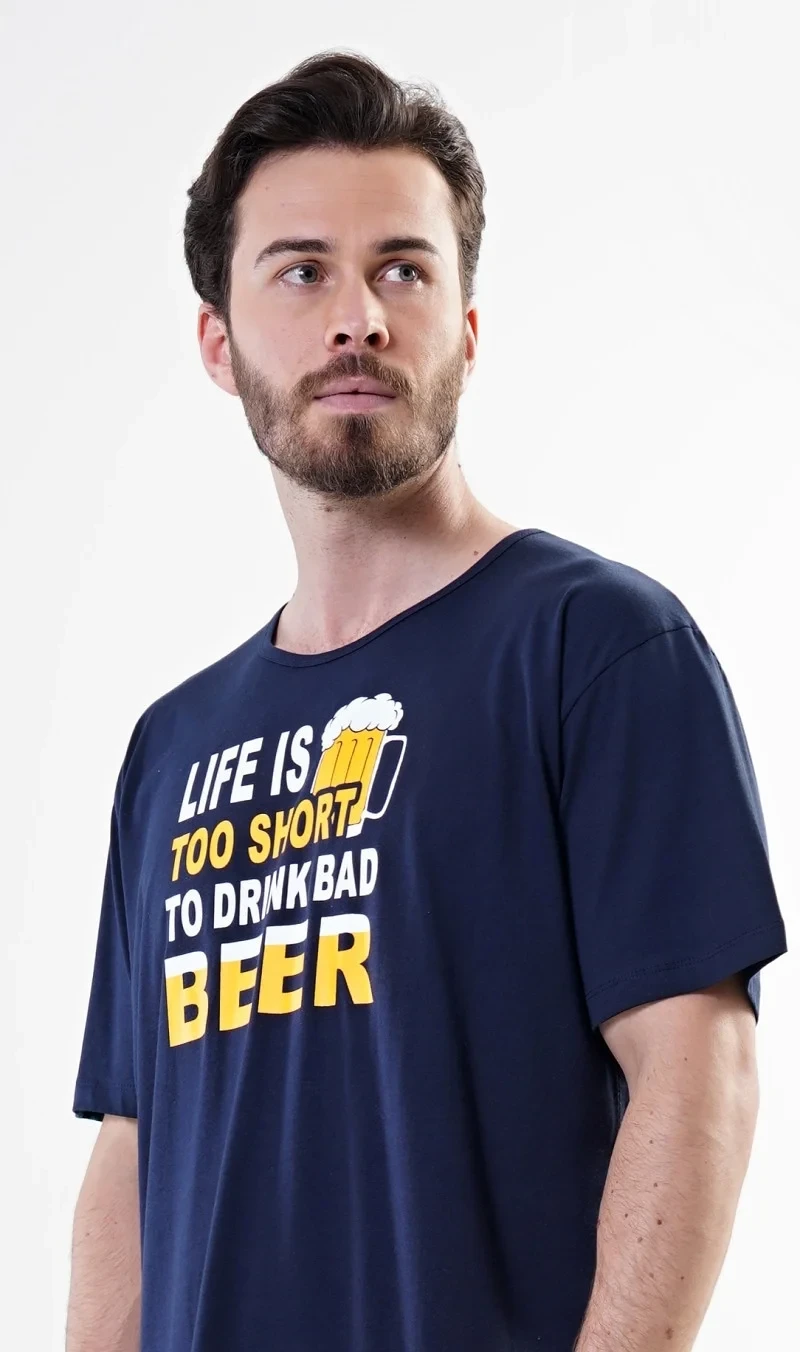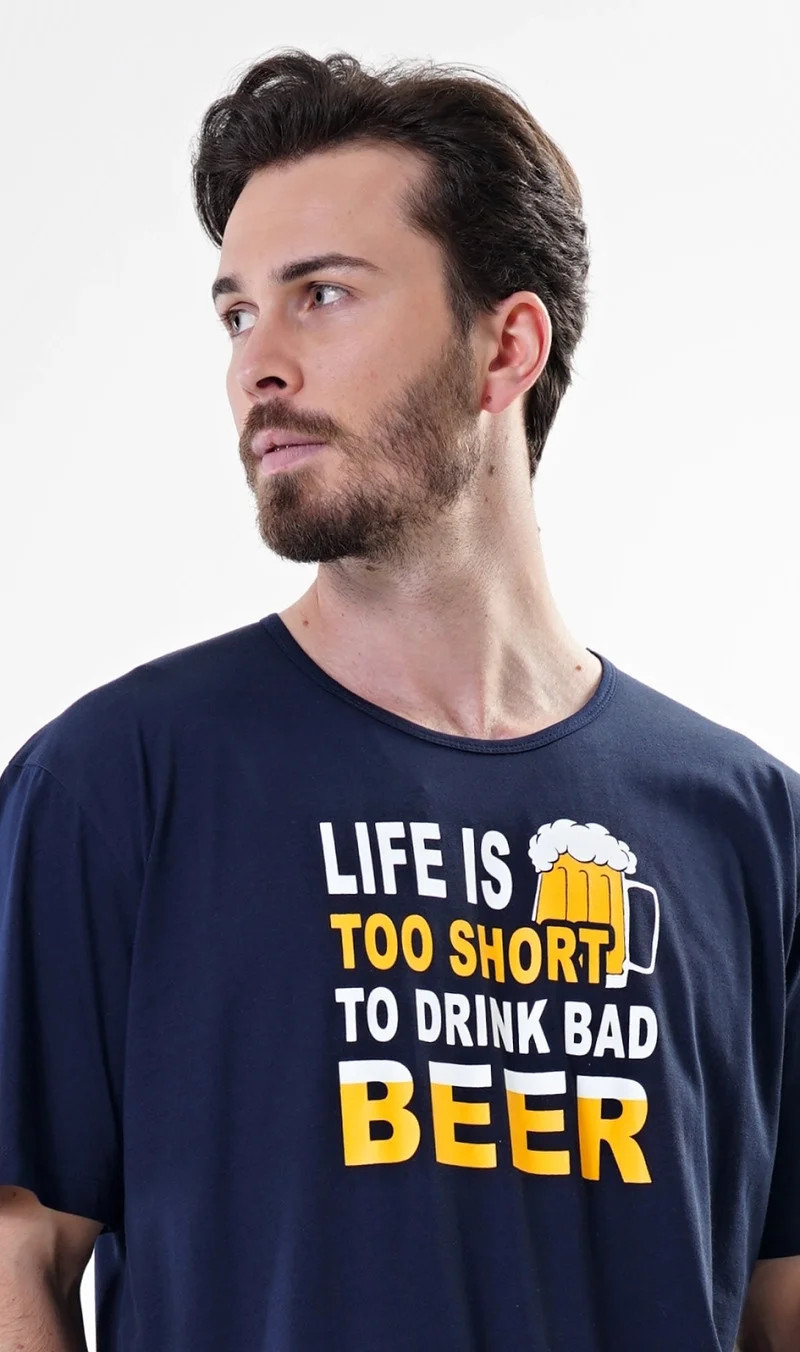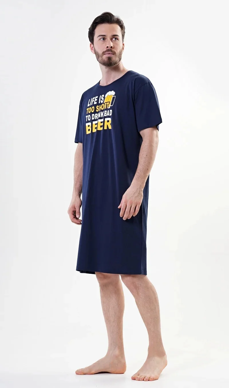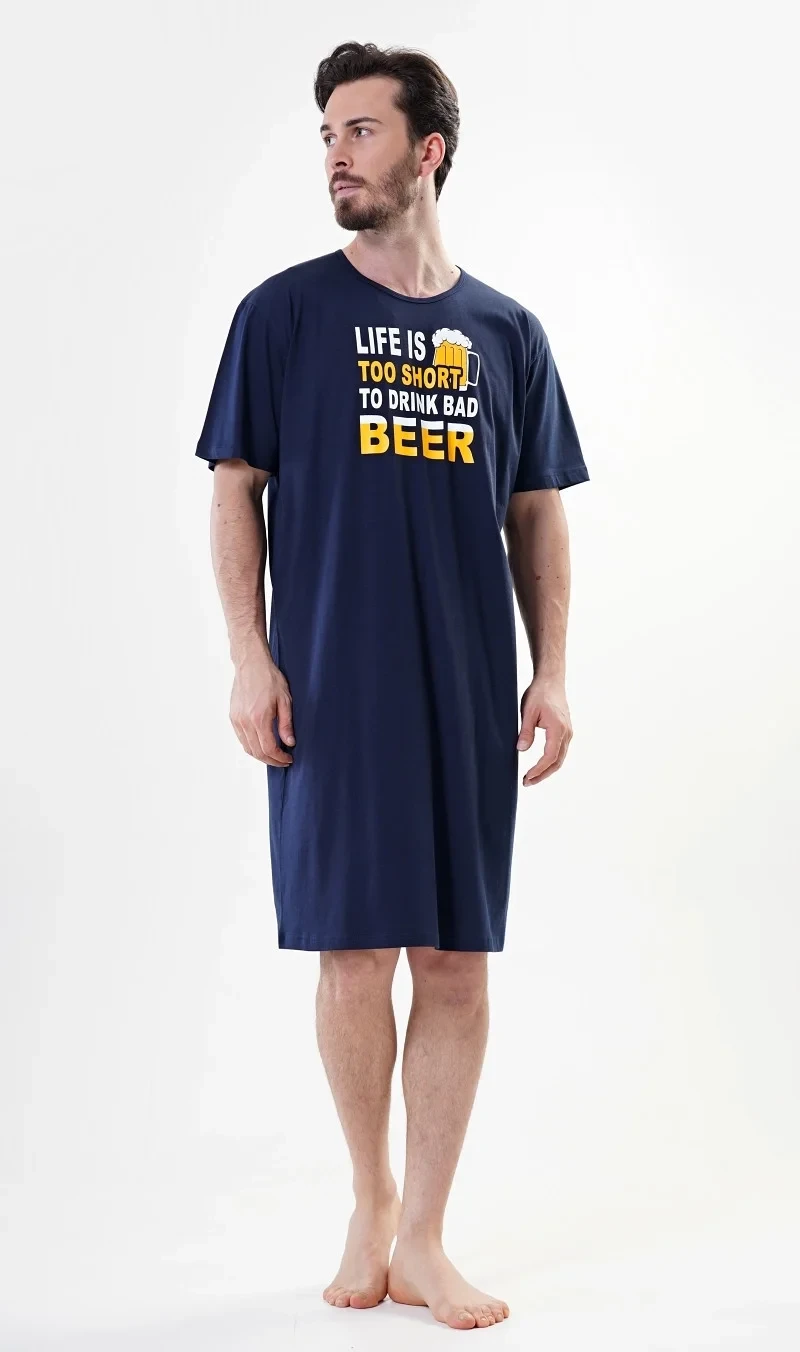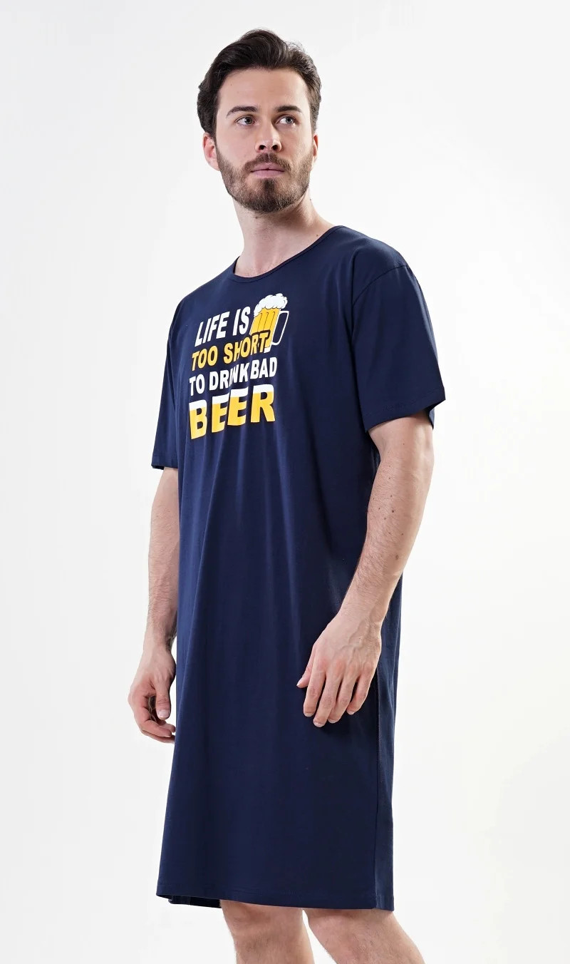 Pánská noční košile s krátkým rukávem Petr. Pánská noční košile s krátkým rukávem pro milovníky pohodlí je jednobarevná, na hrudi je nápis Life is too short to drink bad beer, doplněný malým obrázkem půllitru. Použitý materiál je jemný a poddajný na dotek. Košile je vhodná na denní nošení.